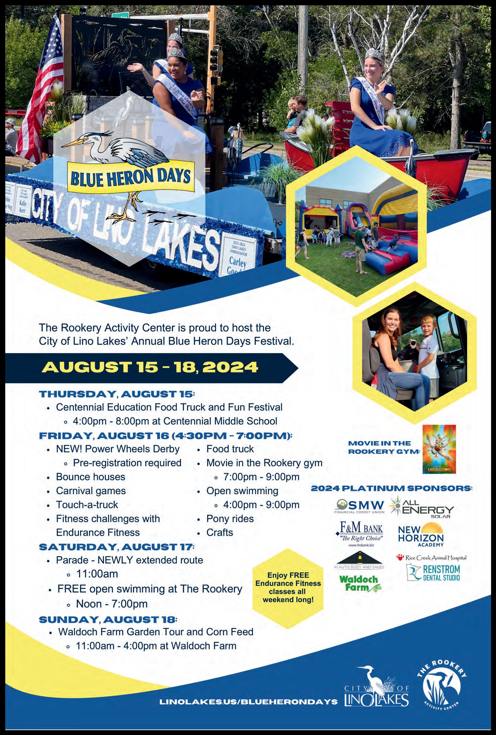 Blue Heron Days, the popular family get-together, will be Aug. 15-18. A majority of events will be held at The Rookery Activity Center in Lino Lakes. The celebration was established in 2004 by a small group of area volunteers who desired to make the vision of a Lino Lakes community festival into a reality.