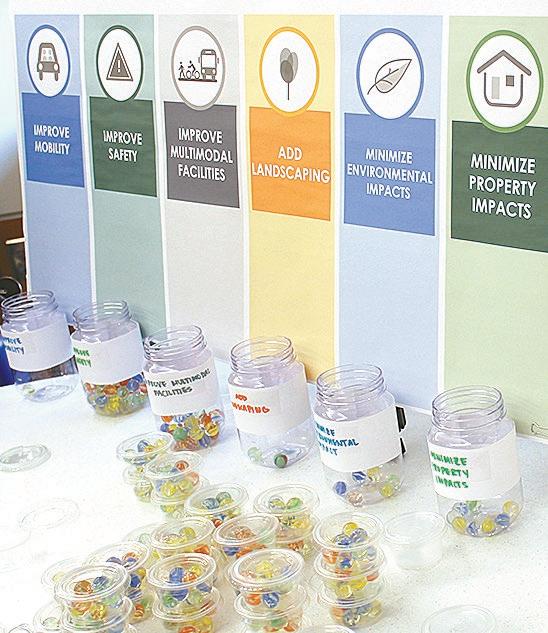 Residents voice their opinions on priorities by placing marbles in jars. Priorities include: improvements to mobility, safety, or multimodal facilities; minimizing environmental impacts or property impacts; or adding landscaping.