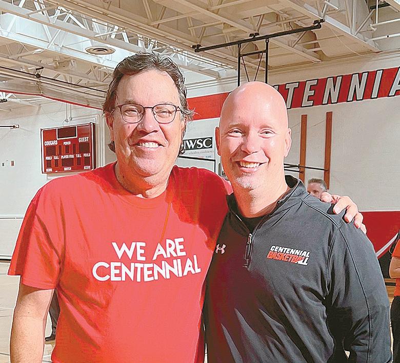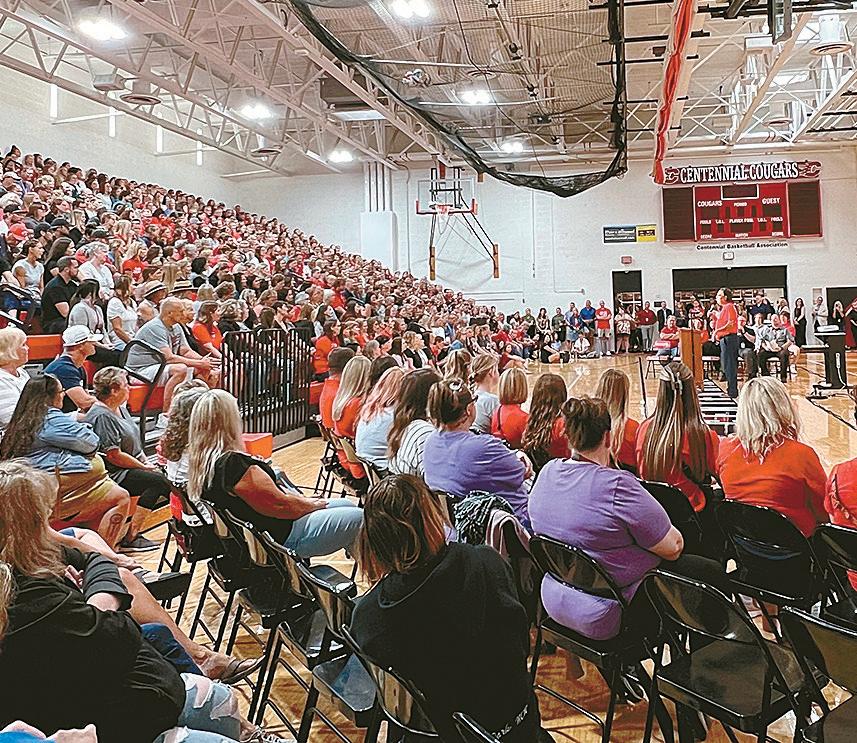 1-2. Centennial Schools held its annual convocation last week to kick off the school year. Circle Pines Mayor Dave Bartholomay, the keynote speaker, talked about the importance of building connections and the impact staff members have on students. Members of the Centennial High School band and choir also participated. The student council emceed the event. Pictured with Bartholomay is Jamie Sobolik, business teacher at Centennial High School. — Contributed