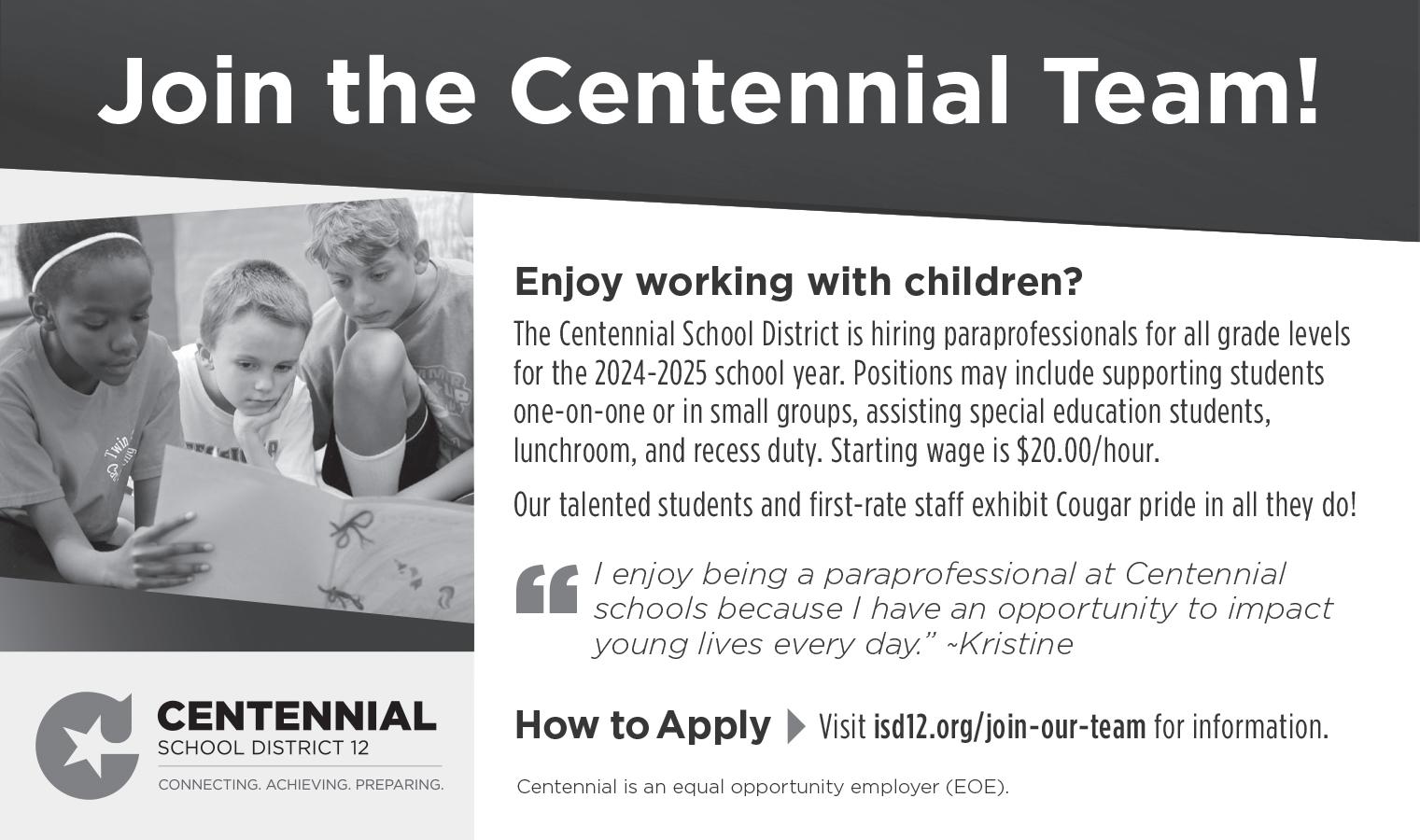 The next Centennial School Board meeting will be at 6:30 p.m. Monday, Oct. 21, in the district board room. Shannon Granholm