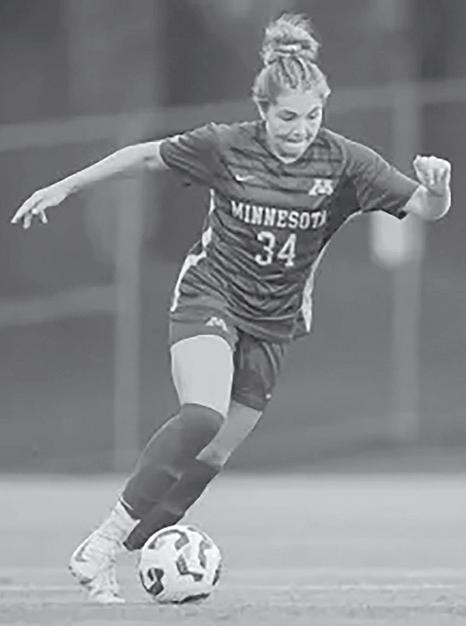 At OSU, Harper slotted her first goal to the far post and her second on a rebound after she outran a defender and took a shot that was blocked. “Huge win at OSU, and super exciting,” said Harper. Harper was a prize recruit for the Gophers in 2020 after earning Metro Player of the Year awards from both the Star-Tribune and Pioneer Press. Harper tallied 134 prep goals in five seasons, two with North Branch and three with the Cougars, whom she led to a state runnerup finish as a junior. She had 26 goals and 11 assists as a senior on a 13-1 team but there were no playoffs due to Covid. Harper served notice from the opening kickoff this year that she’d be a force, logging a pair of hat tricks, in wins over UW-Milwaukee 3-2 and St. Thomas 4-1. The Gophers had a 7-0-1 nonconference start, their