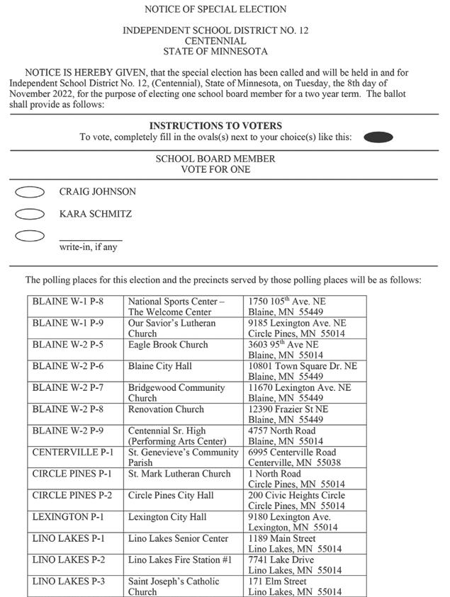 NOTICE IS HEREBY GIVEN that a General Election will be held in the City of Centerville, Minnesota, on Tuesday, November 8, 2022 at the polling locations listed below for the purpose of voting for candidates of the offices specified below. The polls for said election will be open at 7:00 AM and will remain open until closing at 8:00 PM.