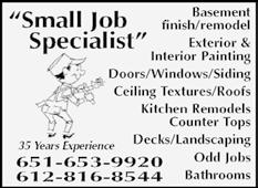 DECEMBER 20, 2022 QUAD COMMUNITY PRESS 17 www.presspubs.com LORENZ DRYWALL • CHANGING CEILINGS OVER TO KNOCK DOWNS • TAPING • SPRAYING • ADDITIONS • BASEMENTS • NEW HOMES • GARAGES No job too small! Kerry 651-653-9021 (Cell) 651-271-4221 DRYWALL Wolf Bros. Dr ywall Co. Total Dr ywall Ser vices Residential/Commercial New Const & Basement Finishes Family Owned & Operated Forest Lake Insured CALL LEE (651) 428-0229 40 yrs • Since 1979 DRYWALL/PLASTER ELECTRIC New Construction/Remodel Residential Commercial Competitive Rates ELECTRICAL SERVICES 651-307-6502 Furnace & A/C Installations and Service Licensed, Bonded & Insured 651.426.4233 cphvac.net HEATING & COOLING • Interior only • Wallpapering • Stain & Varnish • Painting of Home Furnishings (furniture, cabinets, mirrors, light fixtures, frames, etc.) www.LDMarshallPainting.com Free Estimates • Established 1987 L D MARSHALL PAINTING Scott or Linda • 651-426-9135 (office) PAINTING • Hardboard Painting (Hardie Plank and LP) • Texture Removal/Repair 16 years in business servicing the North East Metro. Discounts for Veterans and Senior Citizens. Warrantied work done by insured Employees. Google and Angies List reviewed for more than 10 years (see our reviews online) www.completecustompaint.com J & G Home Interiors Residential/Commercial Painting Specialists 24 years in business We do: interior painting, stain and varnishing, Ceiling conversion to knock down, drywall repair Insured & Bonded FREE ESTIMATES 10% OFF ANY JOB WITH AD Scott – 651-426-0288 Honest Work for Honest Pay 651-270-7360 Reasonable Rates - all jokes and laughs are free Servicing All Major Appliance Brands Major Credit Cards Accepted APPLIANCE REPAIR AUTO SERVICE • Auto Repair • Oil Lube & Filter Service 20 Years of experience serving White Bear Lake & Centerville - Friendly, Honest Service 651.226.4235 Monday - Friday 8 am - 6 pm 7137 20th Avenue North - Centerville www.facebook.com/vermauto H UG E S AVING S! Lic. #20060261 651-257-4706 www.youngcastlebathrooms.com • Design • Bath Repair • Remodeling • Tub Surrounds • Free Estimates Bathrooms by BATHROOMS Schneider Custom Woodworks Custom CABINETRY! Free Estimates & Callbacks within 24 hours schneidercustomwoodwork.com 651-213-6638 Commercial & Residential CUSTOM WOOD WOR KS CARPENTRY CLEANING Household Waste Construction Debris Appliances Furniture 651-323-4682 651-746-4582 www.northlandlandscape.com Bonded Insured • Lic #BC638094 Custom Decks/Footing Repair Screen Rooms/Additions Garages/Roofing/Siding Aluminum/Glass/Cable Railings All Repairs Call Us for WINTER SPECIALS DECKS • Drain Cleaning • Hot Water Heating • Hot Water Heaters & Disposal • Well Pump Service • New Construction • Remodeling Lic. #005402 Tom Thill 651-433-4866 PLUMBING PROFESSIONAL SOLUTIONS FOR EVERYDAY PROBLEMS (952)222-7673 puremechcorp.com Plumbing -Remodel to new construction -In-floor Heating -Tankless Water Heaters Emergency Service 24/7 white bear plumbing inc. ResidentIal CommercIal (651) 426-6000 www.whitebear plumbing.com REMODELING 24 years and going strong! Interior/Exterior Remodeling FREE ESTIMATES Bill 651-775-8396 www allaroundremodeling com Insured • Bonded • License# BC637741 Roofing/Siding Bathrooms Basements Major/Minor Remodeling Doors/Windows Garages Kitchens Additions Quality Home Building and Remodeling KOlsonconstruct.com Lic. #BC-516217 WM Hayes Roofing & ReModeling, llC Call 651-429-2682 Roofing • Siding • Remodeling www.wmhayesconstruction.com MN License #BC002810 Locallyownedsince1972 APPLEWOOD BUILDERS applewoodremodelers.com 612.670.7004 3 Peace, joy & Home MN LIC# BC003215 BATHROOMS ~ KI TCHEN S BASEMEN TS ~ TILES 651-238-6751 N o rco nHome s co m Locally Owned Since 1994 Insured / Lic #BC105943 Twin Cities Premier Home Improvement Company ALL REMODELING ROOFING 651-407-1987 “Your Local Exterior Specialists” MN Lic.# BC223025 Residential - Hardie Plank Roofing Siding Windows Gutters Fascia &Soffit “ TH E LE A K S S TO P HER E” Leaky Roof? 763-742-7500 over 40 years experience Full Ser vice Contractor bettersol.com MN Lic. BC639211 TH E LE A K S S TO P HER E Leaky Roof? 763-742-7500 over 40 years experience Full Ser vice Contractor bettersol.com MN Lic. BC639211 • Roofing • Siding • Repairs • Windows • Doors • & More Leaky Roof? Ice Dam & Snow Removal ROOFING/SIDING TREE SERVICE Snow Removal (651) 775-8602 • Rooftop & Vent clearing • Driveway & Sidewalks • Small parking areas Lic/Ins • Free Estimates • Senior/Veteran discount CameronTree & Snow Removal GENE’S TREE SERVICE & STUMP GRINDING Licensed/Insured • Free Estimates Call Today! 763-785-1629 Meet Your Specialist We take our construction projects seriously. Wm Hayes Construction LLC was established in 1971. Our staff is highly qualified and dedicated. We work hard to make sure that our customers get exactly the kind of roof they need. Wm Hayes also has the ability to solve water intrusion problems, including roofing, stucco, siding, and windows. Owner William Hayes makes it a point to supervise each job site and discuss any questions or concerns with the client. We want to provide each of our clients with a superior roof. If you’d like a free estimate for a new roof, or repair, please call us at (651) 429-2682. Remember, preventative measure can save lots of money and problems in the future. See our ad under Roofing Roofing Siding Windows 651-287-3720 REMODELING Roofing • Siding • Windows (763) 315-3911 BC545108 4105 85th Avenue N. Brooklyn Park, MN allamericanrestorationllc.com ESTIMATES! Roofing • Siding • Windows (763) 315-3911 License # BC545108 4105 85th Avenue N. Brooklyn Park, MN allamericanrestorationllc.com FREE ESTIMATES! Roofing • Siding • Windows (763) 315-3911 License # BC545108 4105 85th Avenue N. Brooklyn Park, MN allamericanrestorationllc.com FREE ESTIMATES! Roofing • Siding • Windows (763) 315-3911 License # BC545108 4105 85th Avenue 