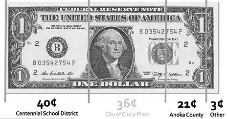 This graphic depicts what portion of a resident’s dollar goes to which jurisdiction. Most of a resident’s dollar is given to the Centennial School District, followed by the city of Circle Pines and Anoka County.