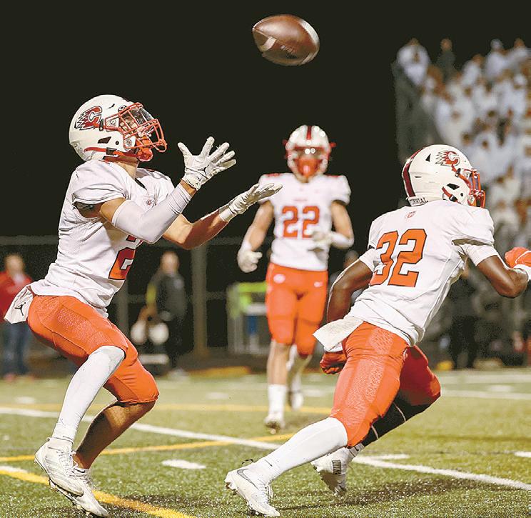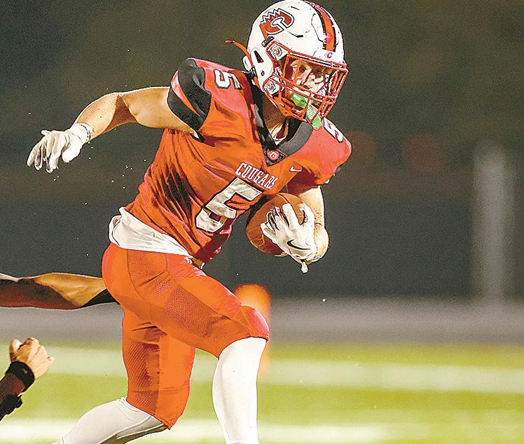 Tanner Dittrich gathers in a kickoff that he would return 92 yards. Edwin Ekah (32) turns upfield to block.