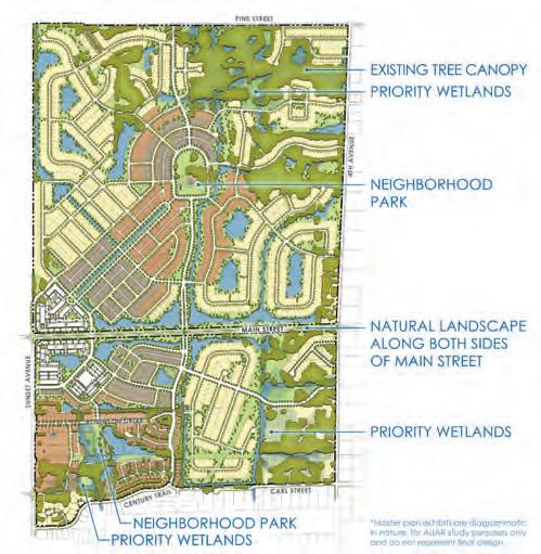 Larsen noted that since the Del WebbPulte Homes proposal is within the Main Street Master Plan study area, it will be reviewed against the Master Plan preferred scenario for consistency. To better align with the Main Street Master Plan, Wipperfurth suggested moving the smaller single-family lots currently planned for the northeast portion of the site to the south, where the higher-density and medium-density areas are located. He also recommended relocating the 60- to 65-foot-wide singlefamily lots from the southeast to the northwest.