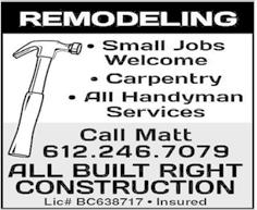 JANUARY 3, 2023 SHOREVIEW PRESS 17 www.presspubs.com LORENZ DRYWALL • CHANGING CEILINGS OVER TO KNOCK DOWNS • TAPING • SPRAYING • ADDITIONS • BASEMENTS • NEW HOMES • GARAGES No job too small! Kerry 651-653-9021 (Cell) 651-271-4221 DRYWALL Wolf Bros. Dr ywall Co. Total Dr ywall Ser vices Residential/Commercial New Const & Basement Finishes Family Owned & Operated Forest Lake Insured CALL LEE (651) 428-0229 40 yrs • Since 1979 DRYWALL/PLASTER ELECTRIC New Construction/Remodel Residential Commercial Competitive Rates ELECTRICAL SERVICES 651-307-6502 Furnace & A/C Installations and Service Licensed, Bonded & Insured 651.426.4233 cphvac.net HEATING & COOLING • Interior only • Wallpapering • Stain & Varnish • Painting of Home Furnishings (furniture, cabinets, mirrors, light fixtures, frames, etc.) www.LDMarshallPainting.com Free Estimates • Established 1987 L D MARSHALL PAINTING Scott or Linda • 651-426-9135 (office) Painting Pro Pro Livin g Colors • Professional, Residential House Painting • 35 Years Experience • Interior & Exterior • Kind, Respectful Ser vice CONTACT RICHARD 612-394-8978 Honest Work for Honest Pay 651-270-7360 Reasonable Rates - all jokes and laughs are free Servicing All Major Appliance Brands Major Credit Cards Accepted APPLIANCE REPAIR AUTO SERVICE • Auto Repair • Oil Lube & Filter Service 20 Years of experience serving White Bear Lake & Centerville - Friendly, Honest Service 651.226.4235 Monday - Friday 8 am - 6 pm 7137 20th Avenue North - Centerville www.facebook.com/vermauto H UG E S AVING S! Lic. #20060261 651-257-4706 www.youngcastlebathrooms.com • Design • Bath Repair • Remodeling • Tub Surrounds • Free Estimates Bathrooms by BATHROOMS Schneider Custom Woodworks Custom CABINETRY! Free Estimates & Callbacks within 24 hours schneidercustomwoodwork.com 651-213-6638 Commercial & Residential CUSTOM WOOD WOR KS CARPENTRY CLEANING Household Waste Construction Debris Appliances Furniture 651-323-4682 651-746-4582 www.northlandlandscape.com Bonded Insured • Lic #BC638094 Custom Decks/Footing Repair Screen Rooms/Additions Garages/Roofing/Siding Aluminum/Glass/Cable Railings All Repairs Call Us for WINTER SPECIALS DECKS Specializing in: • Cabinet Enameling • Interior Painting and Exterior Painting. • Hardboard Painting (Hardie Plank and LP) • Texture Removal/Repair CALL US FOR A FREE PROPOSAL 651-336-0561 16 years in business servicing the North East Metro. Discounts for Veterans and Senior Citizens. Warrantied work done by insured Employees. Google and Angies List reviewed for more than 10 years (see our reviews online) www.completecustompaint.com J & G Home Interiors Residential/Commercial Painting Specialists 24 years in business We do: interior painting, stain and varnishing, Ceiling conversion to knock down, drywall repair Insured & Bonded FREE ESTIMATES 10% OFF ANY JOB WITH AD Scott – 651-426-0288 • Drain Cleaning • Hot Water Heating • Hot Water Heaters & Disposal • Well Pump Service • New Construction • Remodeling Lic. #005402 Tom Thill 651-433-4866 PLUMBING puremechcorp.com white bear plumbing inc. ResidentIal CommercIal (651) 426-6000 www.whitebear plumbing.com Lic #686889 REMODELING 24 years and going strong! Interior/Exterior Remodeling FREE ESTIMATES Bill 651-775-8396 www allaroundremodeling com Insured • Bonded • License# BC637741 Roofing/Siding Bathrooms • Basements Major/Minor Remodeling Doors/Windows • Garages Kitchens Additions TIME TO REMODEL? Kitchen / Bathroom Basement / Deck Check out our Models for design ideas. *1 yr financing option available* SHERCO CONSTRUCTION 651-888-4138 License # BC627690 Quality Home Building and Remodeling Room Additions • Kitchens Basements • Decks All Remodeling For more info visit KOlsonconstruct.com Lic. #BC-516217 612-868-6837 WM Hayes Roofing & ReModeling, llC Call 651-429-2682 Roofing • Siding • Remodeling www.wmhayesconstruction.com MN License #BC002810 Locallyownedsince1972 APPLEWOOD BUILDERS applewoodremodelers.com 612.670.7004 3 the beauty of beginnings MN LIC# BC003215 BATHROOMS ~ KI TCHEN S BASEMEN TS ~ TILES 651-238-6751 N o rco nHome s co m Locally Owned Since 1994 Insured / Lic #BC105943 Twin Cities Premier Home Improvement Company ALL REMODELING ROOFING 651-407-1987 “Your Local Exterior Specialists” MN Lic.# BC223025 Residential - Hardie Plank Roofing Siding Windows Gutters Fascia &Soffit TH E LE A K S S TO P HER E Leaky Roof? 763-742-7500 over 40 years experience Full Ser vice Contractor bettersol.com MN Lic. BC639211 “ TH E LE A K S S TO P HER E” Leaky Roof? 763-742-7500 over 40 years experience Full Ser vice Contractor bettersol.com MN Lic. BC639211 • Roofing • Siding • Repairs • Windows • Doors • & More Leaky Roof? Ice Dam & Snow Removal ROOFING/SIDING TREE SERVICE Snow Removal (651) 775-8602 • Rooftop & Vent clearing • Driveway & Sidewalks • Small parking areas Lic/Ins • Free Estimates • Senior/Veteran discount CameronTree & Snow Removal GENE’S TREE SERVICE & STUMP GRINDING Licensed/Insured • Free Estimates Call Today! 763-785-1629 Meet Your Specialist Viking Auto Repair 2501 E County Road F White Bear Lake, MN 55110 651-407-3465 Service so honest, you can even keep your leg Find Viking Auto under “Automotive Repair” Are you tired of paying too much for your auto repairs? You are always welcome to the home-like atmosphere with friendly service and low rates at Viking Auto Repair. We offer services on: • Engine & Transmission • Computer & fuel injection system repair • Brakes • Suspension & steering • Tune-up • Exhaust • Cooling system service • Air conditioning • Tires • Electrical • Classic car repair 741095 Roofing Siding Windows 651-287-3720 PLUMBING ICE DAM Roofing • Siding • Windows (763) 315-3911 BC545108 4105 85th Avenue N. Brooklyn Park, MN allamericanrestorationllc.com ESTIMATES! Roofing • Siding • Windows (763) 315-3911 License # BC545108 410
