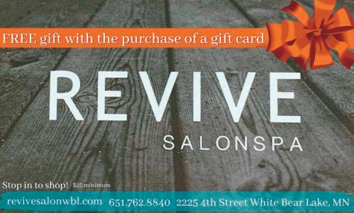 18 SHOREVIEW PRESS DECEMBER 6, 2022 www.presspubs.com 758997 When you need us, we are here to help. *Servicing all brands Read our reviews and check out our current promotions at www.krinkies.com Licensed, Bonded, Insured Serving the St. Paul and Surrounding Area 651-426-5220 24/7 Emergency Service BEST OF THE PRESS 756464 FREE TRIP CHARGE With repair $109 value! Valid during regular business hours • Expires 12/31/22 2022-23 Holiday Gift Cards Help support our local businesses this Holiday Season by purchasing gift cards for friends & family. Countdown to Christmas! 758521 125 E County Rd F • Vadnais Heights, MN 55127 651-483-4055 • www.fairwaycollisioncenter.com Total Collision & Automotive Repair Gift Cards Available! 759534 Total Collision and Automotive Repair Paintless Dent Repair • Brakes • Tires • Tune-ups • Painting • Detailing 125 County Rd F • Vadnais Heights, MN 55127 651-483-4055 • www.fairwaycollisioncenter.com Just call. We do it all. angusmeatmarket.com • 61liquors.com 2700 Maplewood Drive • Maplewood (651) 484-9447 745216 1# - 85% Lean Ground Beef One per household FREE *Valid Now until April 1, 2023* For information on 2023 CSA sign-up and gift cards, visit: costagreenhouse.com • costaproducefarm.com GIVE A GIFT THAT KEEPS GIVING IN 2023 Gift Cards Available Online Use in the Greenhouse or at the Cornstand Open April thru September 2023 759164 759591 BUY $50 - GET $10 FREE* HOLIDAY GIFT CARD SALE **offer good through 12/31/22** 651-340-7581 3959 Linden St., White Bear Lake Mon-Thurs 11am-9pm Fri-Sat 11am-9pm Sunday Closed 759517 A Great Stocking Stuffer! Phone: 651.633.1777 Website: FlahertysBowl.com 651.633.1777 Website: FlahertysBowl.com County Road E & Snelling County Road E & Snelling Available in any denomination Available in any denomination Offer good Dec. 2 - 16, 2022. For future purchases only. kowalskis.com 10% off gift card purchases! (of $100 or more) 757594 GET A $20 GIFT CARD WHEN YOU PURCHASE $100 GIFT CARD. Offer good until 1/1/23 FOR RESERVATIONS PLEASE CALL (651) 653-6718 (651) 653-6718 | rudysredeye.com 4940 Hwy 61 N, White Bear Lake 759376 759258 PURCHASE GIFT CARDS ONLINE AT ACQUAWBL.COM OR CALL 651-407-7317 HOLIDAY GIFT CARD SALE! BUY $100 GET $25 FREE* *OFFER GOOD UNTIL 12/24/22. Some restrictions apply. BUY $100 IN GIFT CARDS & GET $20 FREE! 759793 651-429-7609 1350 Highway 96 E White Bear Lake carboneswhitebearlake.com DELIVERY & TAKEOUT AVAILABLE 4729 HIGHWAY 61 N WHITE BEAR LAKE, MN | (651) 209-6790