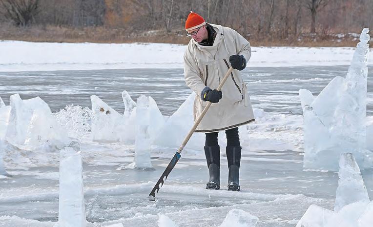 Rather than discarding the excess ice, Schmidt arranged these chunks around the hole. “It was sort of honoring what comes out of the lake,” he said. “The only other option is to slide it under the ice. You can only do it if you cut it so long. As water circulates around, it all sort of erodes, and because of how it’s sloped, when you shove it under it tends to come right back in.”