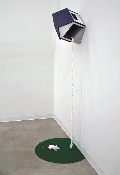 During his residency, Lemke brought bins of wooden model house parts, spending the majority of his time sanding, assembling, painting, staining and detailing. In between, Lemke took guided tours of the Jackson Meadow site, a residential neighborhood featuring uniquely designed houses, to help him create his models. “A lot of my research deals with the history of planned communities in the world and in the United States,” said Lemke, “of which Jackson Meadow is a very special example.” Post-residency, Lemke added 3D-printed components to his sculptures. “I wanted to make sculptures that interact with the gallery space in different, precarious or unusual arrangements as a way to surprise the viewer,” said Lemke.