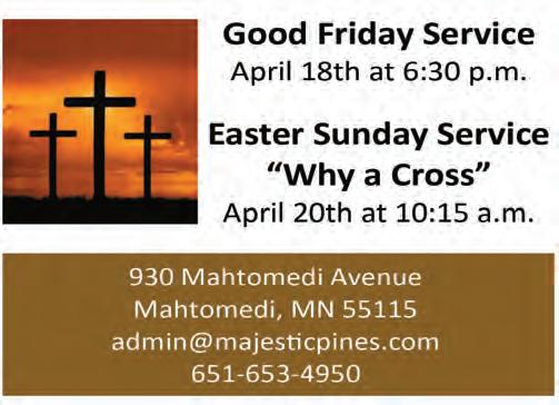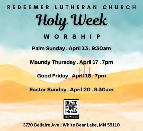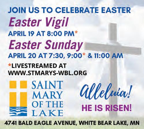 Catalyst Covenant Church of White Bear Lake will host a community egg hunt at 9:30 a.m. Saturday, April 12 at Lakewood Hills Park, right behind the White Bear Lake Area YMCA. For more information, visit www. catalystwbl.org.