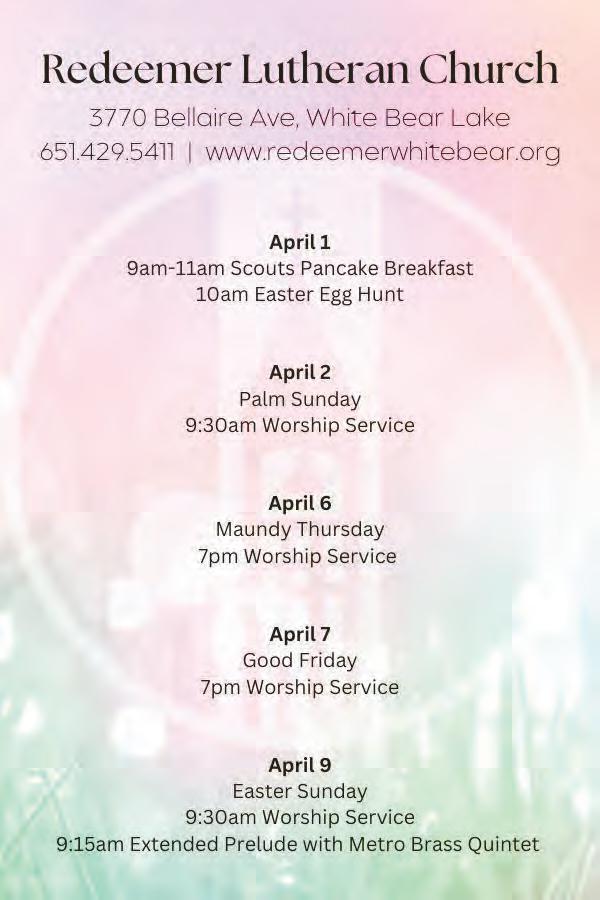 Hot Turkey Sandwich 11am-gone Happy Hour 4 pm - 6 pm RIB SPECIAL 11 til Gone RIB SPECIAL 11 til Gone Fish Fry 11 am - until gone Happy Hour 4 pm - 6 pm Fish Fry 11 am - until gone Happy Hour 4 pm - 6 pm Hot Turkey Sandwich 11am-gone Happy Hour 4 pm - 6 pm Hot Turkey Sandwich 11am-gone Happy Hour 4 pm - 6 pm Hot Turkey Sandwich 11am-gone Happy Hour 4 pm - 6 pm Hot Meatloaf Sandwich 11am-gone Happy Hour 4 pm - 6 pm Hot Meatloaf Sandwich 11am-gone Happy Hour 4 pm - 6 pm Hot Meatloaf Sandwich 11am-gone Happy Hour 4 pm - 6 pm LUNCH Spaghetti & Meatballs Happy Hour 4 pm - 6 pm LUNCH Spaghetti & Meatballs Happy Hour 4 pm - 6 pm LUNCH Spaghetti & Meatballs Happy Hour 4 pm - 6 pm Seniors 62+ 15% OFF FOOD Happy Hour 4 pm - 6 pm Seniors 62+ 15% OFF FOOD Happy Hour 4 pm - 6 pm Seniors 62+ 15% OFF FOOD Happy Hour 4 pm - 6 pm $3 Tacos OpenNightGame 6 - Close $3 Tacos OpenNightGame 6 - Close $3 Tacos OpenNightGame 6 - Close 1 RIB SPECIAL 11 til Gone Fish Fry 11 am - until gone Happy Hour 4 pm - 6 pm $3 Tacos OpenNightGame 6 - Close LUNCH Spaghetti & Meatballs Happy Hour 4 pm - 6 pm Seniors 62+ 15% OFF FOOD Happy Hour 4 pm - 6 pm *We will be closed on Easter Sunday SUNMONTUEWEDTHUFRI SAT Join L&B Extras for even more great offers! Sign up at LandB.mn/Extras or text EXTRAS to 55955* *Msg & data rates may apply. T&C/Privacy: http://bit.ly/1KfDUyv Special offers just for Extras members Digital coupons for use at checkout 4630 Centerville Road, White Bear Lake, MN 55110 651-653-0000 SPECIAL OFFER FOR L&B EXTRAS MEMBERS ONLY! $1.99 Cedar’s Hommus 8 oz. | Limit 2 per day. Offer valid March 30 – April 5, 2023. 768555 When you need us, we are here to help. *Servicing all brands Read our reviews and check out our current promotions at www.krinkies.com Licensed, Bonded, Insured Serving the St. Paul and Surrounding Area 651-426-5220 24/7 Emergency Service 2022 of the Press 768200 FREE TRIP CHARGE With repair $109 value! Valid during regular business hours • Expires 4/30/23 COMMUNITY BRIEFS