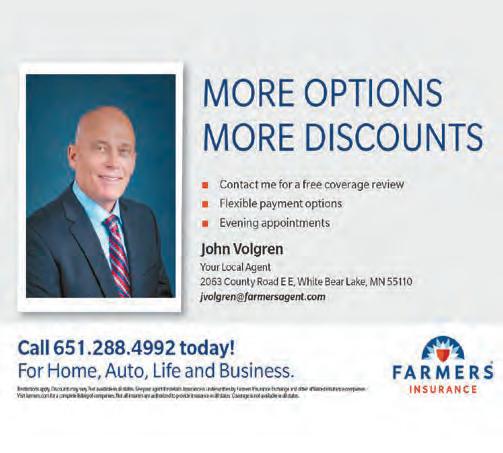 22 WHITE BEAR/VADNAIS HEIGHTS PRESS MAR CH 29, 2023 www.presspubs.com 651-429-1394 1978 Hwy 96 E White Bear Lake MN 55110 763151 State Farm Mutual Automobile Insurance Company State Farm Indemnity Company State Farm Fire and Casualty Company State Farm General Insurance Company Bloomington, IL State Farm County Mutual Insurance Company of Texas Your hometown home & auto team When you go with State Farm® you get neighborly service and a local agent — all for a surprisingly great rate. Give me a call and get a quote today. Like a good neighbor, State Farm is there.® Scott William Bohnen, Agent 1981 Whitaker Street White Bear Lake, MN 55110 Bus: 763-515-4655 scott.bohnen.vaayzv@statefarm.com BEST OF THE PRESS 2022 of the Press Vadnais Heights State Farm Mutual Automobile Insurance Company State Farm Indemnity Company State Farm Fire and Casualty Company State Farm General Insurance Company Bloomington, IL State Farm County Mutual Insurance Company of Texas State Farm Lloyds Your hometown home & auto team When you go with State Farm®, you get neighborly service and a local agent — all for a surprisingly great rate. Give me a call and get a quote today. Like a good neighbor, State Farm is there.® Scott William Bohnen, Agent 1981 Whitaker Street White Bear Lake, MN 55110 Bus: 763-515-4655 scott.bohnen.vaayzv@statefarm.com State Farm Mutual Automobile Insurance Company State Farm Indemnity Company State Farm Fire and Casualty Company State Farm General Insurance Company Bloomington, IL State Farm County Mutual Insurance Company of Texas State Farm Lloyds State Farm Florida Insurance Company Your hometown home & auto team When you go with State Farm®, you get neighborly service and a local agent — all for a surprisingly great rate. Give me a call and get a quote today. Like a good neighbor, State Farm is there.® Scott William Bohnen, Agent 1981 Whitaker Street White Bear Lake, MN 55110 Bus: 763-515-4655 scott.bohnen.vaayzv@statefarm.com State Farm Mutual Automobile Insurance Company State Farm Indemnity Company State Farm Fire and Casualty Company State Farm General Insurance Company Bloomington, IL State Farm County Mutual Insurance Company of Texas State Farm Lloyds Richardson, TX State Farm Florida Insurance Company Your hometown home & auto team When you go with State Farm® you get neighborly service and a local agent — all for a surprisingly great rate. Give me Like a good neighbor, State Farm is there.® Scott William Bohnen, Agent 1981 Whitaker Street White Bear Lake, MN 55110 Bus: 763-515-4655 scott.bohnen.vaayzv@statefarm.com Scott Bohnen, Agent 1981 Whitaker Street White Bear Lake, MN 55110 2171 4th St. White Bear Lake Serving the communities of Birchwood, Gem Lake, Hugo, Lino Lakes, Little Canada, Maplewood, North Oaks, Vadnais Heights, White Bear Lake, and White Bear Township. White Bear Lake Area Schools Leading minds to learning, hearts to compassion, and lives to community service. Join us! informationEnrollmentat isd624.org/enroll Translations: Para Español por favor llame al 651-407-7625 Xav tau ntawv Hmoob hu rau 651-407-7623 Why Be a Bear? Our students benefit from: • Safe, nurturing and challenging environments. • Personalized instruction. • Hands-on learning. • World language experiences. • Focus on academic, social and personal development of all students. • Career Pathways opportunities and College-level courses. See what we’re up to! • E-NEWSLETTER The Community e-Newsletter is sent out each week, with alternating text and video editions. Be added to the Community e-Newsletter list may contact us at communications@isd624.org. • CONSTRUCTION UPDATES - Find periodic updates about the construction projects happening throughout the district at isd624.org/BuildingOurFuture • STAY SOCIAL Join White Bear Lake Area Schools’ social media circles on Facebook, Twitter and YouTube for daily 624 Fact posts and video share-outs of The Week in 62.4 Seconds 651-407-7500 www.isd624.org /isd624 White Bear Lake Area Schools (651) 888-4111 313 Stillwater Rd, Willernie RMA RESTAURANT - BAR - MARKET 310 Stillwater Rd., Willernie Kathy Madore 651-592-4444 Lisa Madore 651-216-1335 TheMadores.edinarealty.com The Madores (651) 271-0877 BenStewart@edinarealty.com Sonia Kohli 651-428-5105 soniakohli@edinarealty.com www.soniakohli.com North Oaks resident since 1999 Selling homes for over 18 years $ 1,195,000 The best time to buy a home is always five years ago. -Ray Brown $ 1,500,000 $ 950,000 $ 2,395,000 Sale Pending $ 1,095,000 New Listing $ 1,195,000 Sale Pending Ben Stewart 651-440-9128 Dugoutbarmn.com 651-492-1888 995 Wildwood Rd, White Bear Lake 766220 CALL FOR A FREE CONSULTATION 651-426-8176 BRUGGEMANEXTERIORS.COM • ROOFING • SIDING • WINDOWS • GUTTERS AND MORE! WE DO EXTERIOR RENOVATIONS! CALL NOW TO SCHEDULE YOUR SPRING PROJECT! BUILDING YOUR TRUST SINCE 1959 651-426-8176 Bruggemanexteriors.com (651) 429-0648 9500 Dellwood Rd, White Bear Lake Sandy Espe Sorenson 612-812-9792 sespe@cbburnet.com Laura Whitney 612-387-3052 laura@crushrealestatemn.com F co llis io n a a i rw Y an d au to moti ve 651.483.4055 125 E. County Rd F E Vadnais Heights www.kowslskis.com 11 Twin Cities locations Maplewood • White Bear Lake • Hugo • Roseville • Blaine • 20 MN Offices 652-777-7700 | premierbanks.com 651-407-0491 4225 White Bear Pkwy Ste 1240 Vadnais Heights MN 651•426•4433 3865 Highway 61 N. • White Bear Lake From Projects to Parties ...We Can Help! From Projects to Parties...We Can Help! White Bear Lake Boys Basketball Congratulations Class 4a State Qualifiers!