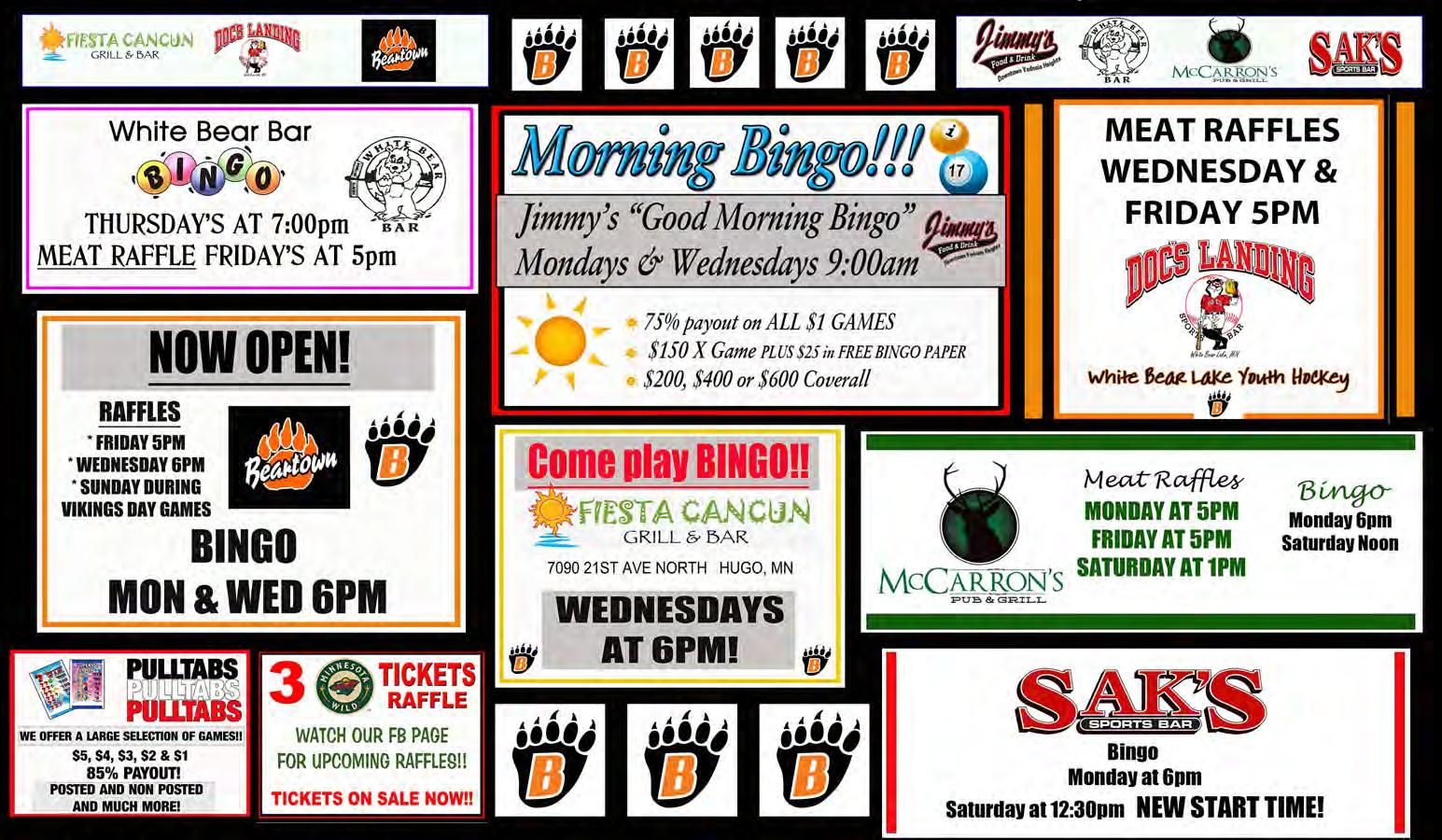 BAR HOURS: Sundays 11am til 10pm, Monday 11am til 11pm, Tuesday thru Thursday 11am til 12pm, Friday & Saturday 11am til 1am KITCHEN HOURS: Monday&Tuesday 11am-7pm, Wednesday&Thursday 11am - 8pm, Friday&Saturday 11am - 9pm, Sunday 11am - 7pm HOURS MAY CHANGE 4496 Lake Ave. South, White Bear Lake • 651-426-4944 768789 RIB SPECIAL 11 til Gone RIB SPECIAL 11 til Gone Fish Fry 11 am - until gone Happy Hour 4 pm - 6 pm CLOSED Hot Meatloaf Sandwich 11am-gone Happy Hour 4 pm - 6 pm 2 3 4 5 6 7 8 9 10 11 12 13 14 15 16 17 18 19 20 21 22 23 24 25 26 27 28 29 30 SUNDAY NIGHT GAME