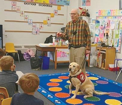 Tim Roufs speaks to students in a classroom with his hearing assist dog, Bentley, at his side. Service dogs like Bentley help their owners with various day-