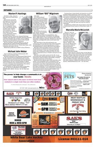 2A WHITE BEAR/VADNAIS HEIGHTS PRESS JULY 12, 2023 www.presspubs.com 779235 CORNER OF 3RD AND BANNING me White Bear American Legion BE SURE TO ASK ABOUT MEMBERSHIP! White Bear Lake, American Legion Post 168 2210 3rd Street 651-429-5770 Gambling License #00539 PULL TABS & E-TABS Best Odds in Town! KARAOKE Fridays and Saturdays 9-12PM THIRSTY THURSDAY DRAWING Stop in each day for a free ticket Winner picked every Thursday at 7PM Must be present to win and no purchase necessary DAILY HAPPY HOUR Monday thru Friday 2-6PM $1 off drinks Post 168 UPCOMING EVENTS & SPECIALS MARKETFEST Join us every Thursday from 6-9PM for Drink Specials, Gift Card Raffles and $7 Pork Chops on a Stick & Karaoke or Live Music UPCOMING BANDS • Jul 20 - Thomas and James Band – During Marketfest 7-9PM • Jul 22 - Inside Straight Band • August 26 - Thomas and James Band • Sept 30 – Lucky Liz Band • October 21 – Mayfair 3 Band • Nov 11 - Thomas and James TWINS GAMES All Friday, Saturday and Sunday Twins Games Stop in for $4 Seltzer, $3 Busch Light tall boys, $2 High Life taps *Band schedule subject to change 651.426.2116 Family and Cosmetic Dentistry 4916 Highway 61, White Bear Lake drsarahboo.com *Includes 2 exams, 2 cleanings, 1 set of x-rays easy come? easy go? #15 ofthe Press White Bear Press 2022 Yes, going to the dentist actually can be easy. We’ve got night-time appointments. We have a ordable care - only $299/year*. And we’re available 24/7 by text if an emergency should arise. Go easy on yourselfcall us today for an appointment. Starting today, please vote for us at : presspubs.com/white_bear/bestof/