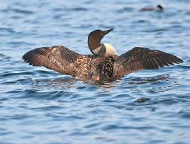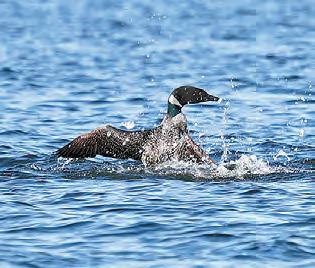 we approached, she flashed a huge foot waggle and soaked in the moment. Foot waggles are more frequent in hot weather, which certainly has been the case, as of late. We only spotted Eloise with a parent on one occasion. While staying safe and swimming close to and under the docks near the Yacht Club, Eloise received the cue from papa Loon to join him for fishing and diving. This behavior was instilled early and is a critical safety skill for Loon chicks. Within a few minutes, Eloise was swimming next to her papa, circling his neck, and accepting fish deliveries. While Eloise is getting more proficient at catching her own fish, she gladly accepts fish deliveries from any Loon interested in serving her. There are three “grandparent”/old warrior Loons, featured in the montage, that regularly take turns watching over and feeding Eloise. The Loon with the white battle scar near its right eye and