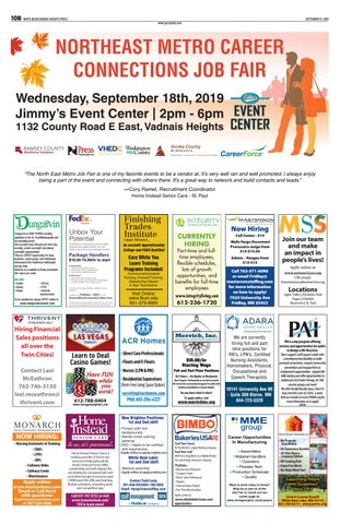 NORTHEAST METRO CAREER CONNECTIONS JOB FAIR Wednesday, September 18th, 2019 Jimmy’s Event Center | 2pm - 6pm 1132 County Road E East, Vadnais Heights