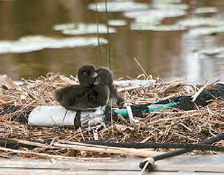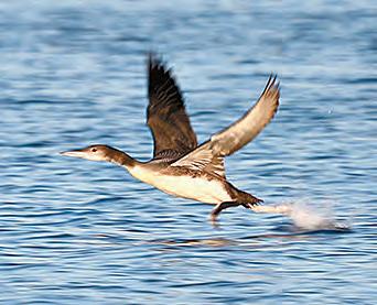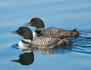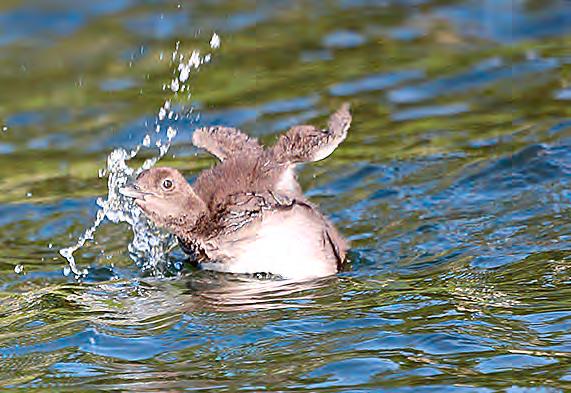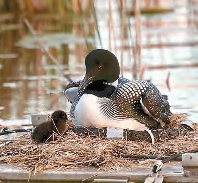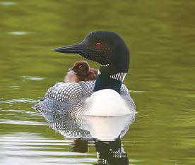 new family, a morning we will never forget. So many tender and comical moments. We then made our way to the Peninsula nest and spotted a spunky new chick, Shannon named Eloise, with both parents. Everyone was so looking forward to the arrival of the fourth chick, during the next 24 hours. The next day, however, the wind and waves proved to be too much for the Cove chicks, and both perished. The parents searched aimlessly for hours, but to no avail. Eloise and her parents made it to safety in the bulrushes, abandoning the remaining egg on the nest. The Cove parents were not able to successfully renest, but remained together, as a pair, and spent their summer socializing with all the other Loons on the lake. We have no doubt that the Cove pair will return next spring and try again. Eloise put on quite a show this summer. She grew like a weed and was evicted from her parents’ backs less than twelve days post-hatch. Unlike last summer, Eloise’s parents