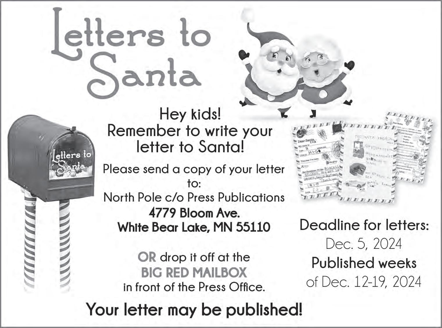 • To submit a letter, e-mail it to whitebearnews@presspubs. com, fax it to 651-429-1242 or mail or deliver it to Press Publications, 4779 Bloom Ave., White Bear Lake, MN 55110.