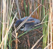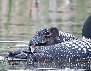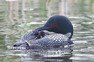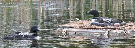 Another wild two weeks! On our May 14 outing, all appeared calm in the Cove, with mama and papa Loon taking turns on their well-hidden nest in the bulrushes. The Peninsula pair also had things under control. Mama was panting on the nest, while papa circled, with one wing sliding into the water. I had a hunch that, perhaps, he was hiding a chick under his wing. The next morning, Loon Whisperers Brad and
