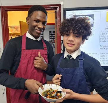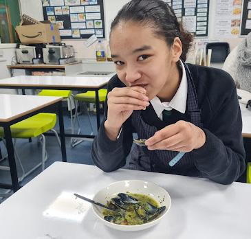 While Year 11 made mussel chowder with a focus on knife skills, refining the knife cut of brunoise, which is a highlevel skill in their NEA2 practical exam.