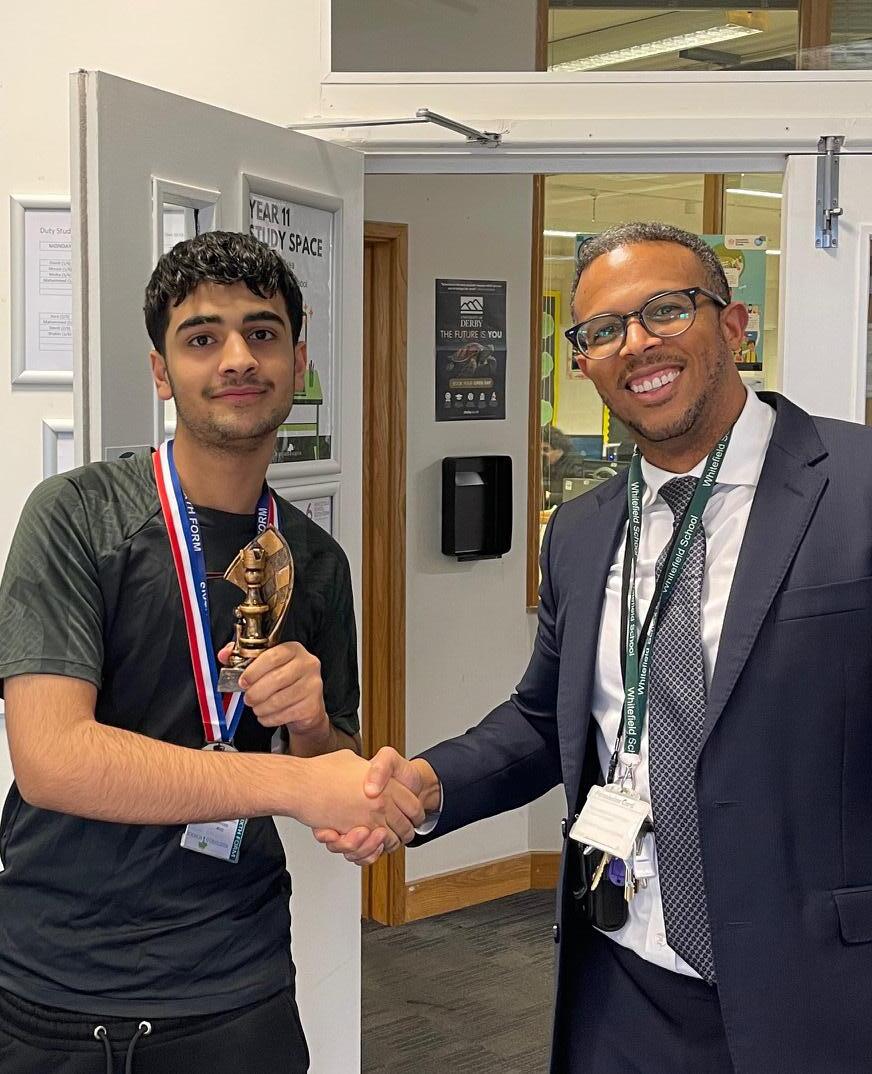 Mr Walker organised the Sixth Form tournament to allow students to compete, after multiple rounds the final was between Omar and Sebastian in Year 12. Congratulations to Omar who won the final and is our chess champion! Headteacher Mr Hunt congratulated both for their participation and presented the finalists awards.