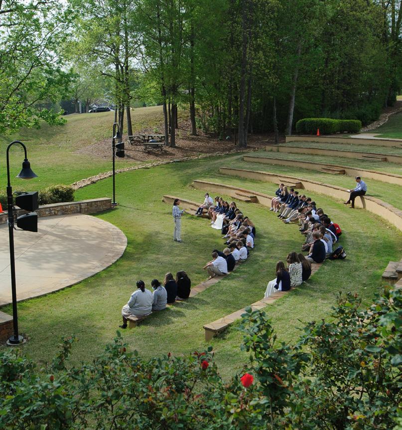 The scenic center of campus is a beehive of learning. Students from each division regularly take advantage of the picturesque greenspace or simply enjoy a breath of fresh air on their way to the Innovation Lab, musical arts classrooms, or Campus Store.