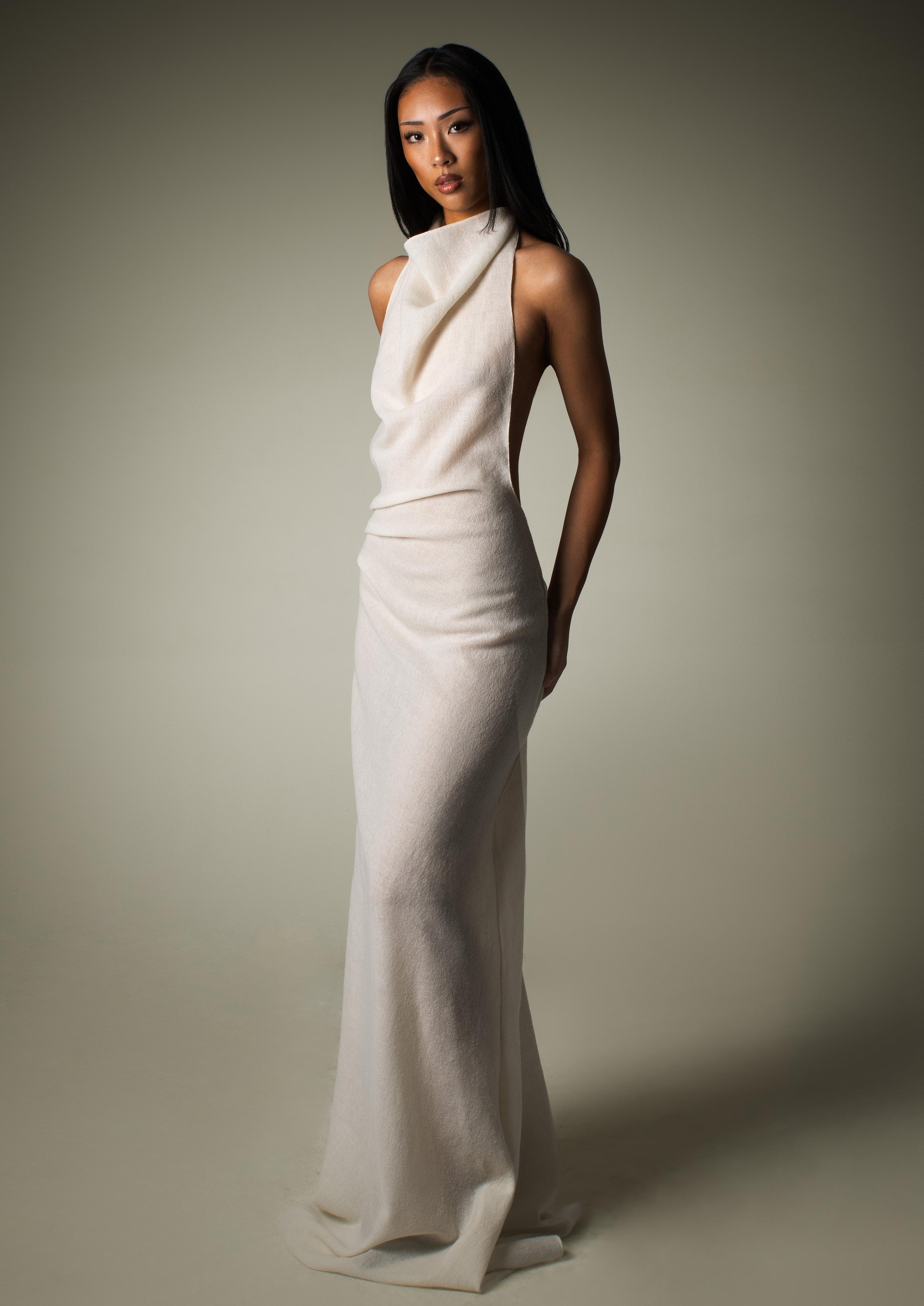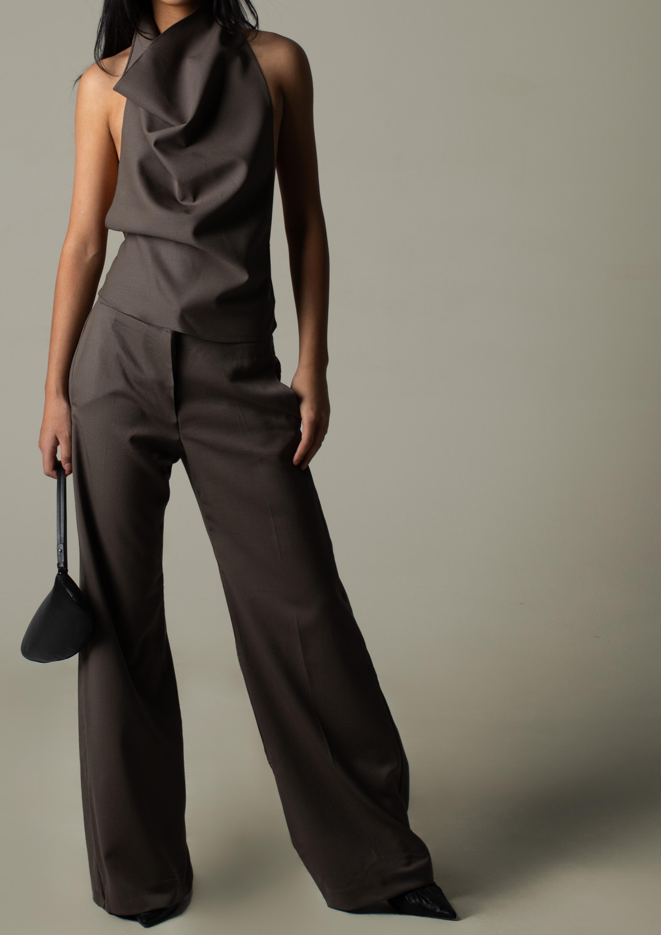 Cut in the same merino wool as Look One and aligned with the direction of Look Three, this look refines the cowl-neck halter into a warmer, more tactile expression. Paired with tailored trousers, it reinforces the collection’s material and formal continuity while offering a grounded, understated silhouette.