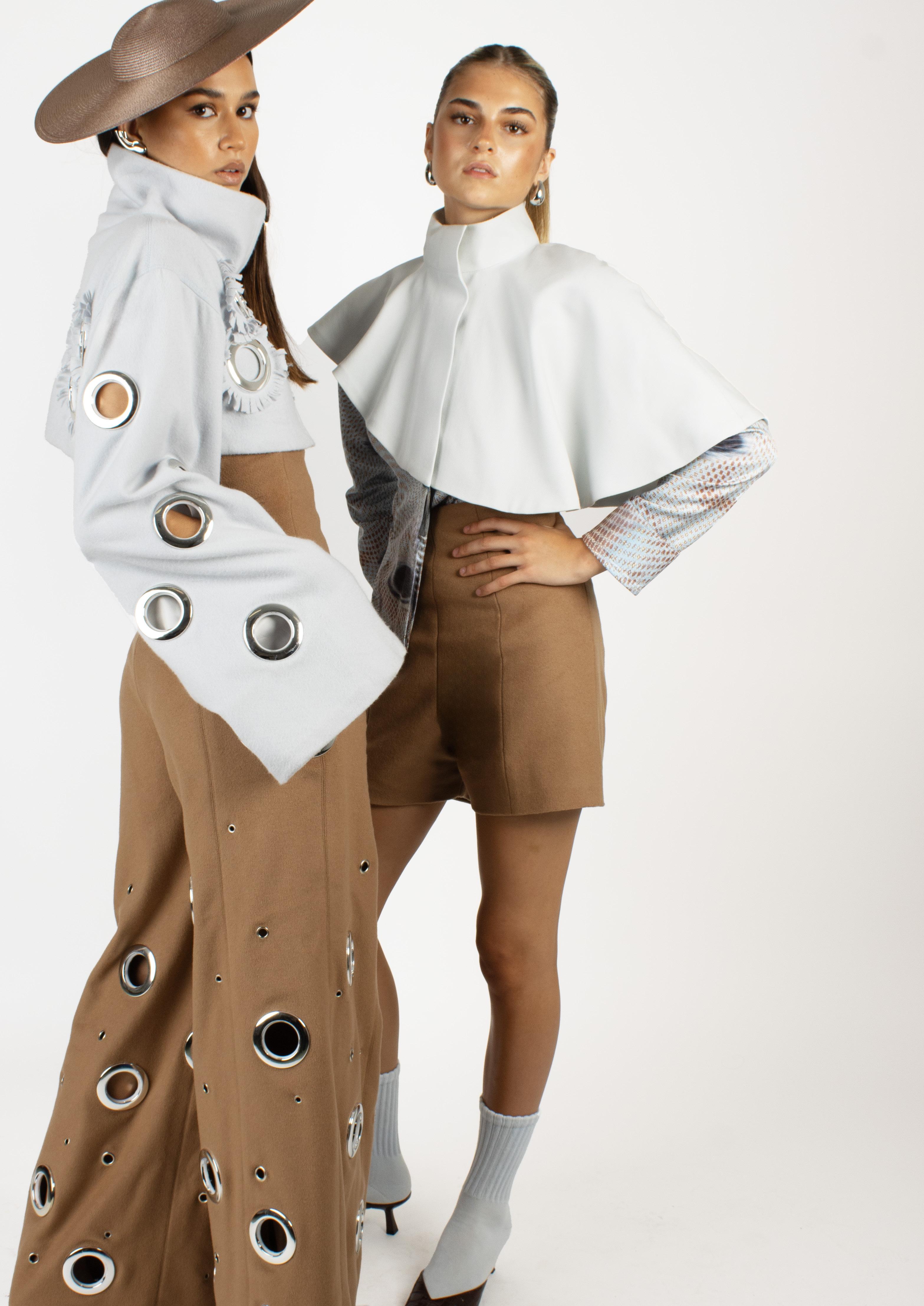 This notion is expressed across the range through intricate grommet detailing and embellishment techniques that echo themes of recollection and play, contrasted against the refined structure of tailored wool garments. Through the considered use of trend forecasting and the integration of upcoming seasonal colour palettes, Caloola Road bridges contemporary fashion language with deeply personal storytelling. The result is a body of work that feels both grounded and expressive, a study in how memory can be materialised through texture, tone, and form.