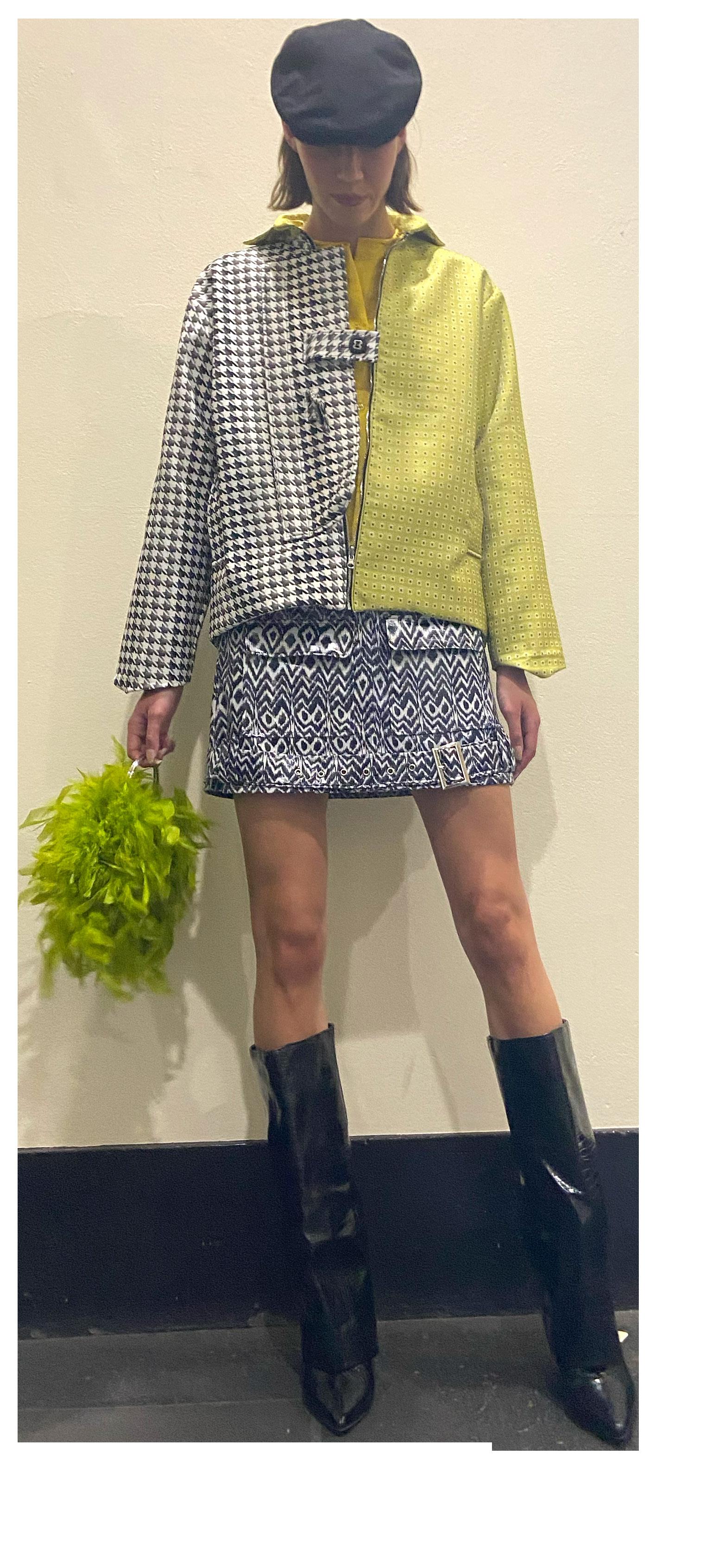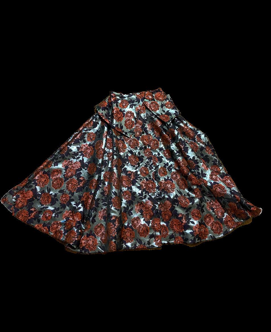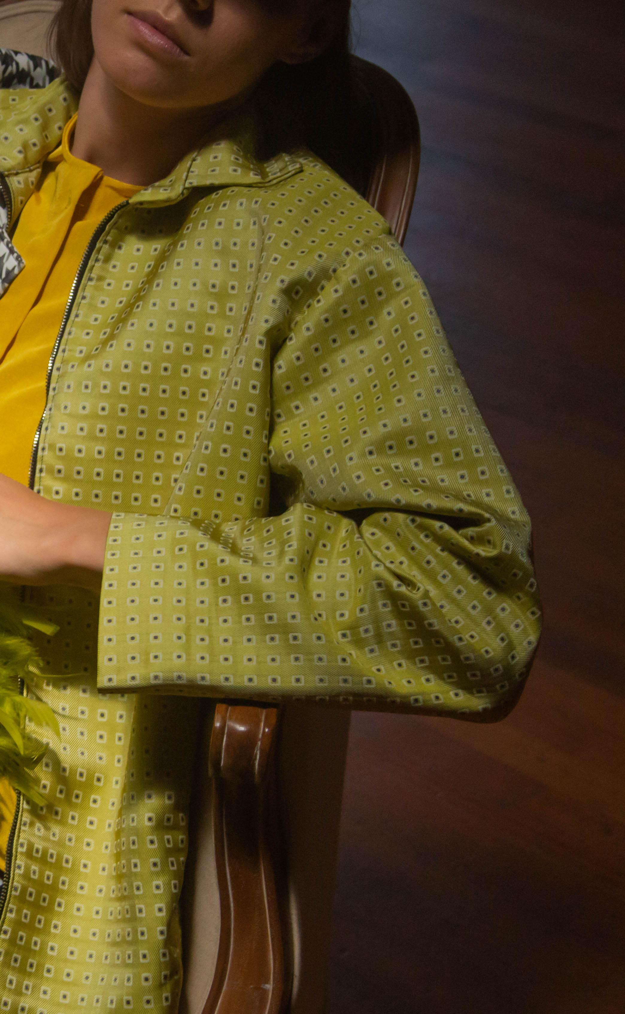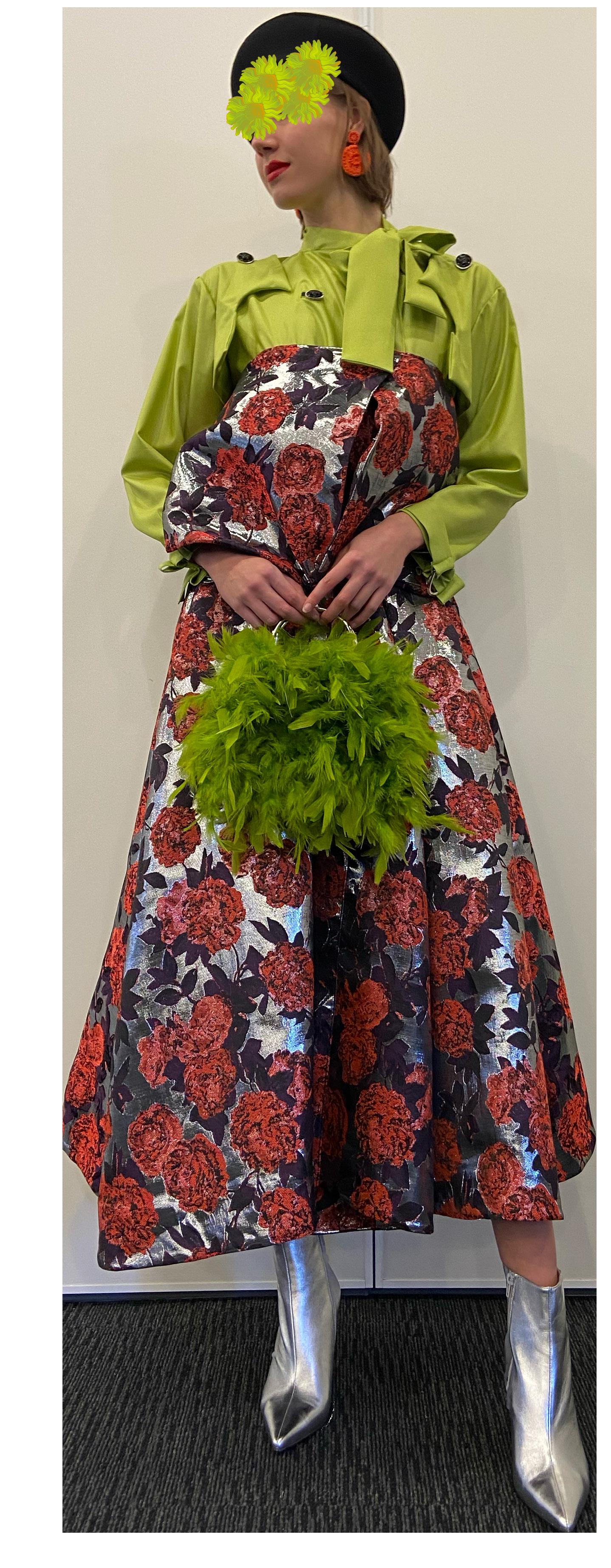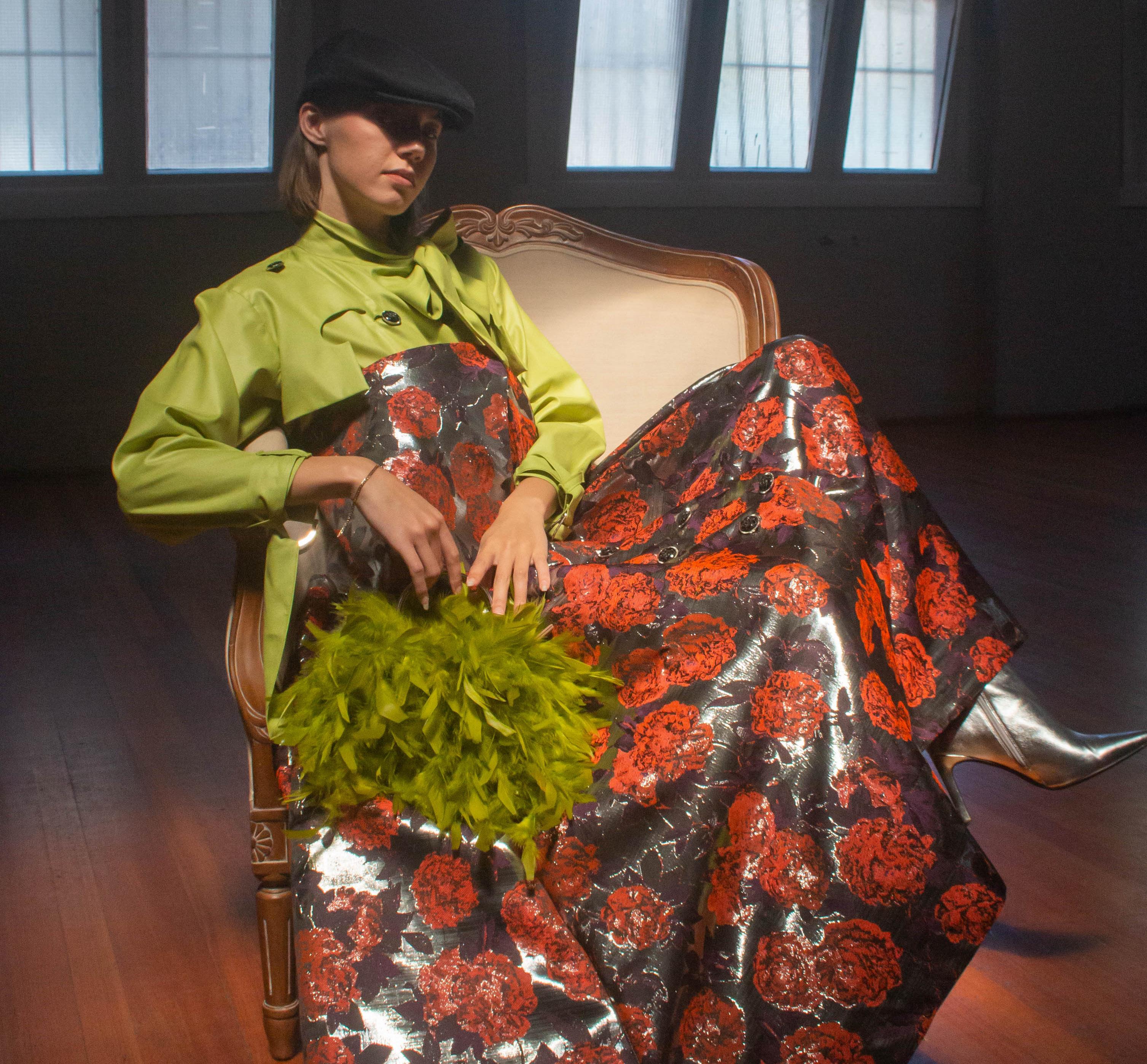 The collection consists of a hero garment that contains the utilisation of bold colours such as shades of green, red-orange and tints of purple and black. The fabrication included in this collection is a unique metallic floral print embellished with floral like buttons, paired with a trench style under shirt.