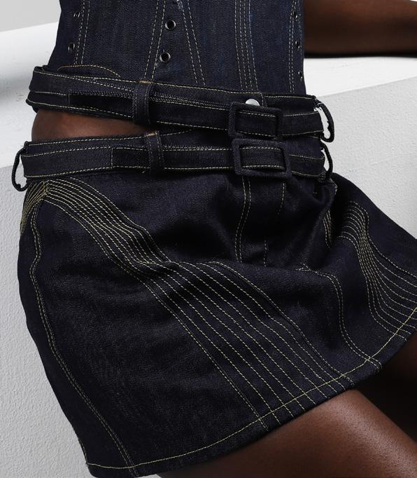 STRAPLESS DRESS WITH LONG SIDE SLITS AND CUSTOM DENIM BELTS AND BUCKLES, PAIRED WITH MINISKIRT FEATURING UNDULATING TOPSTITCHING DETAILS.