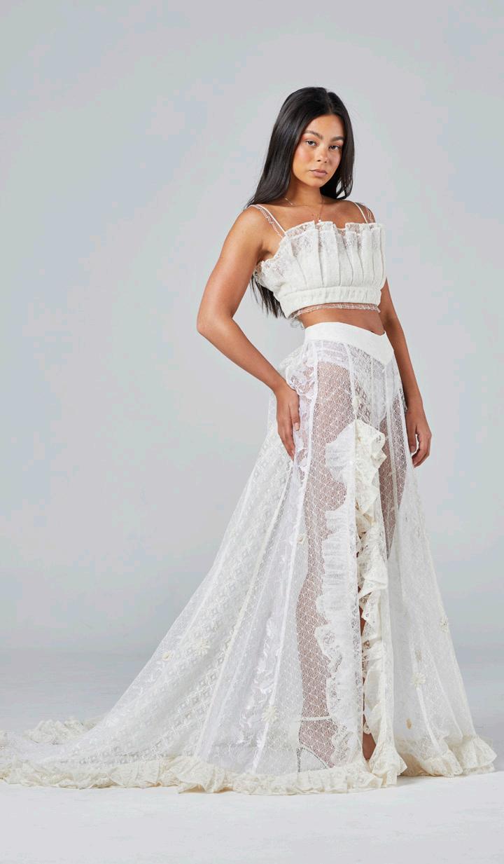 The maxi skirt is made with 100% recycled fabrics. It features all over lace, embroidery detailing, design lines following down the skirt, freshwater pearls with finger loop closures running from waist to the bottom of the train, leg slit and frill trim on all edges.