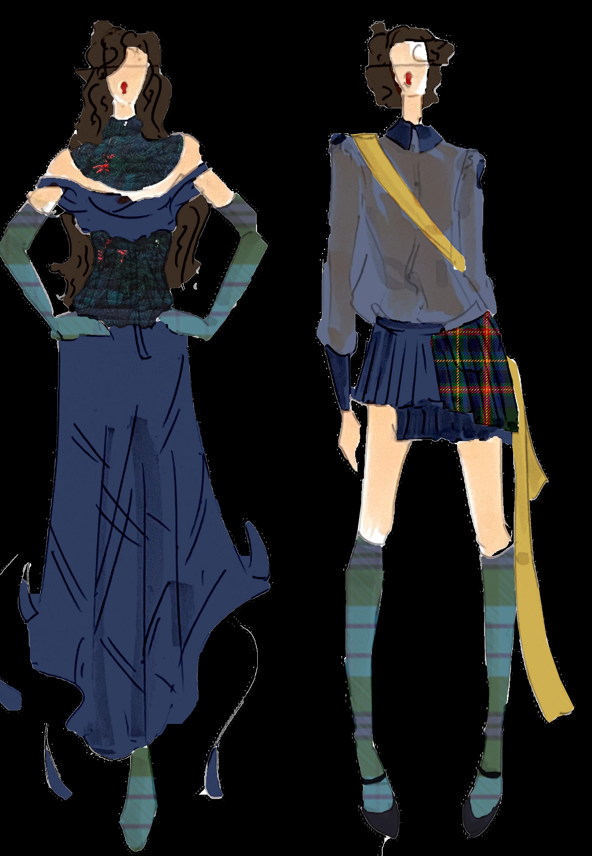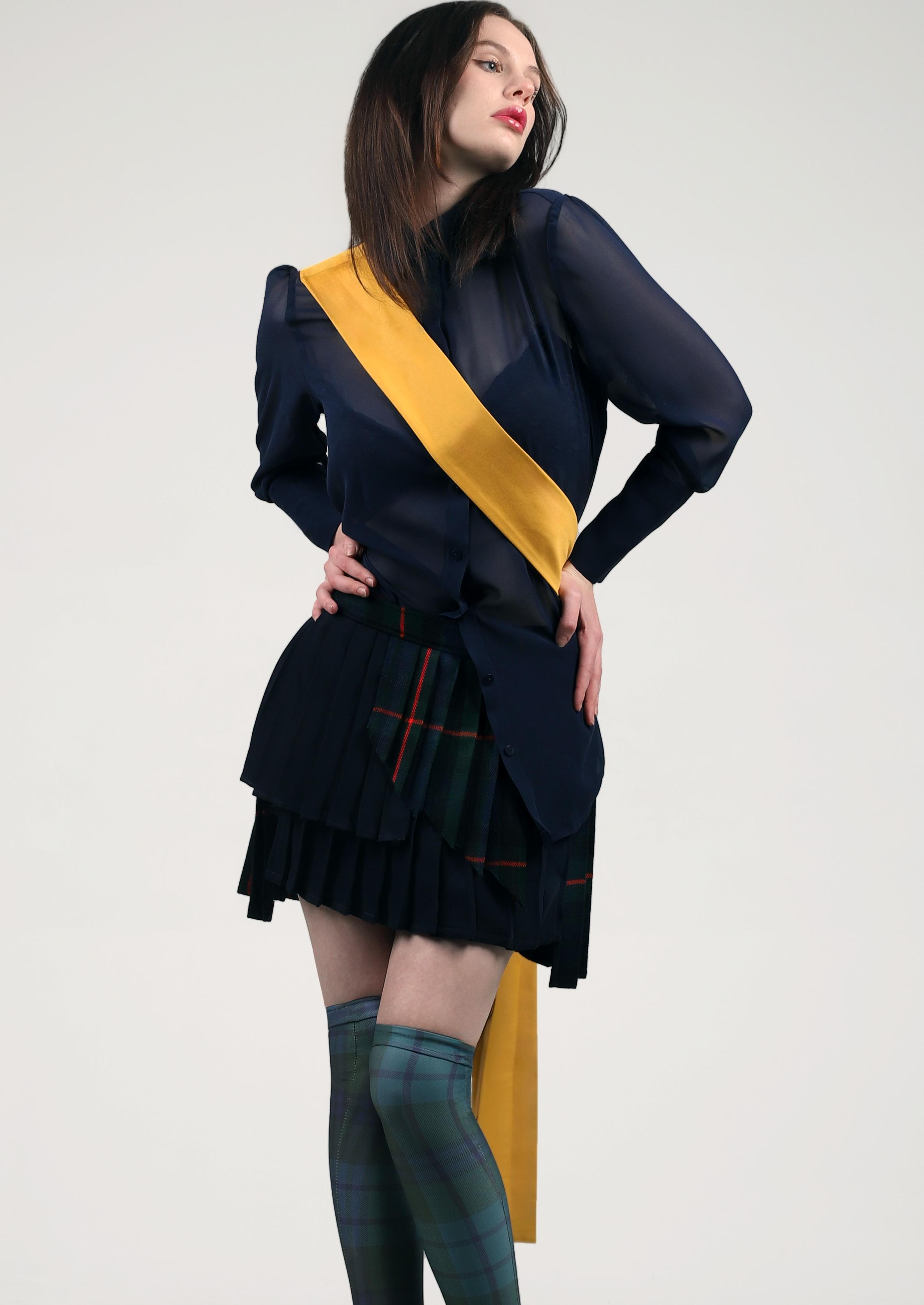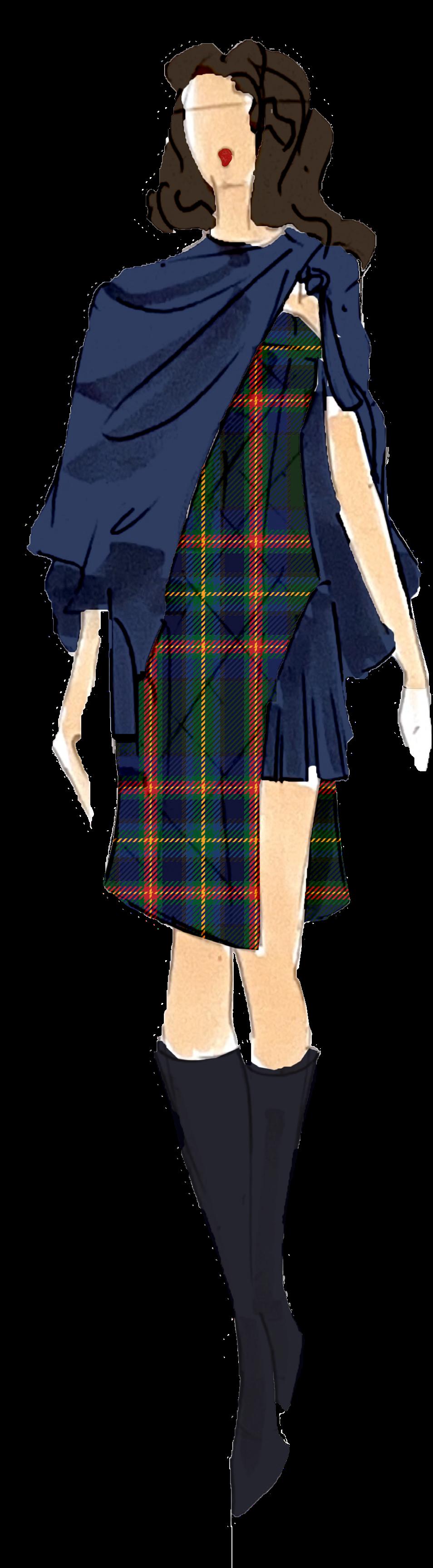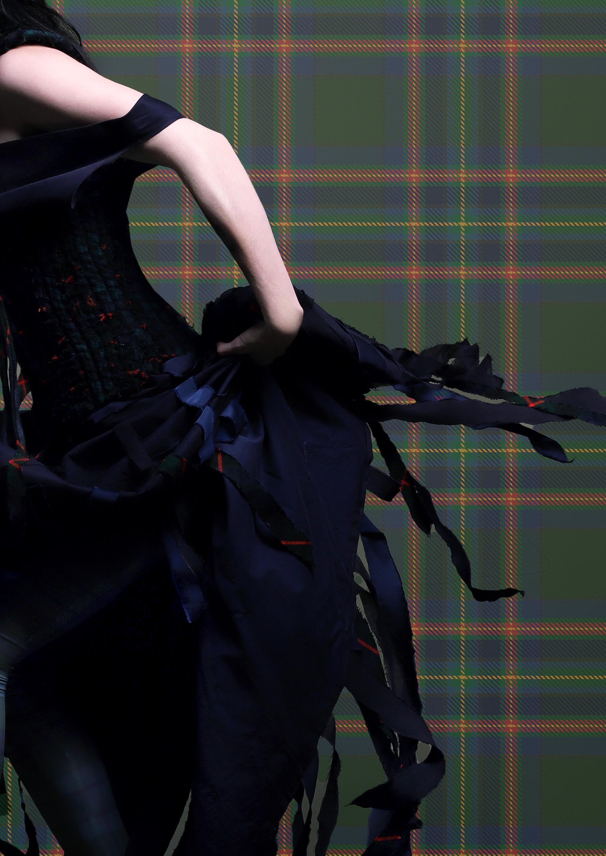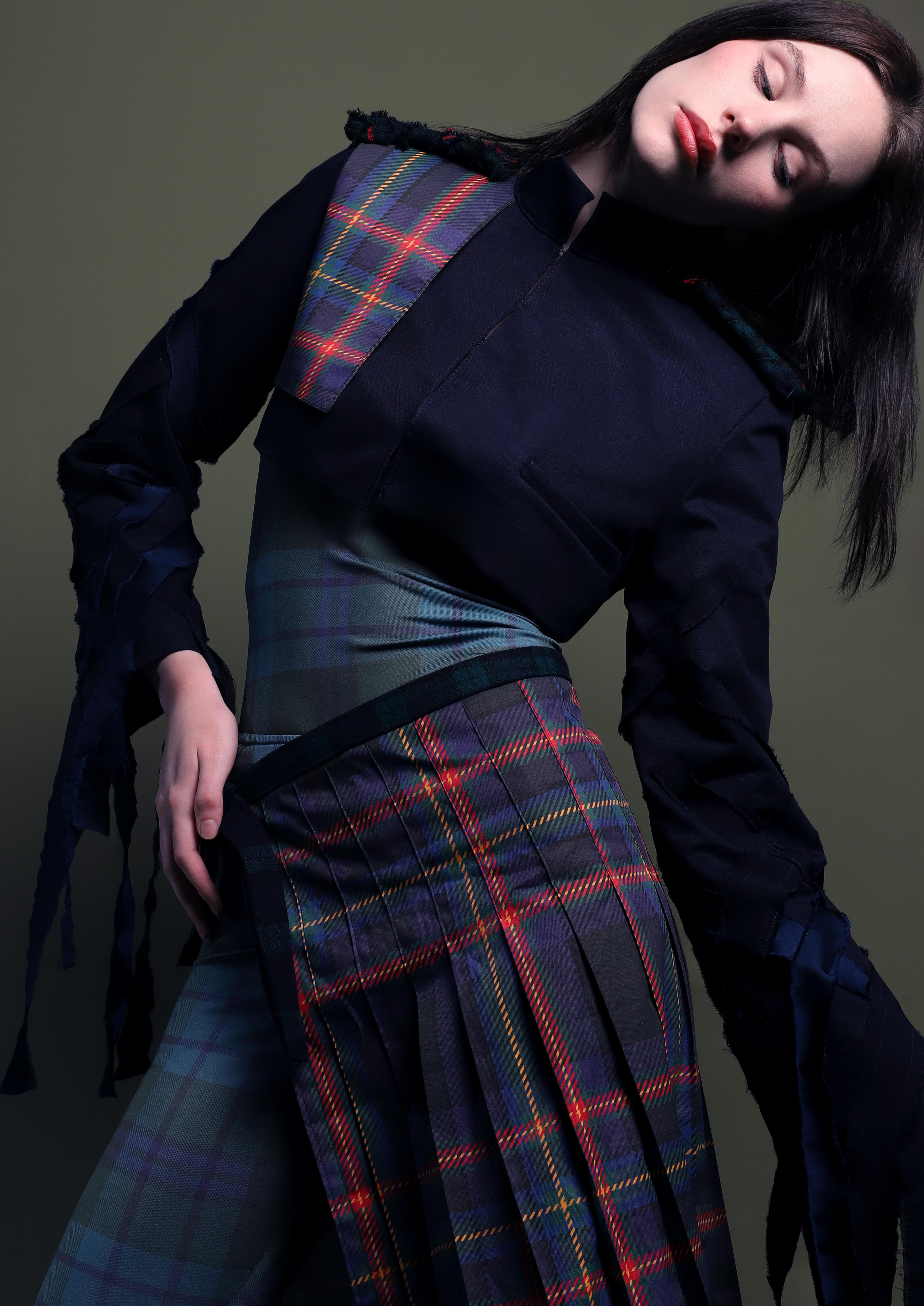 Paired with Tencel, a fiber made from wood pulp, the materials reinforce the garment’s grounding in nature while embracing a contemporary sustainable approach. Corset inspired shaping, bold tartans and dramatic proportions mirror the landscape, windswept, grounded and powerful.