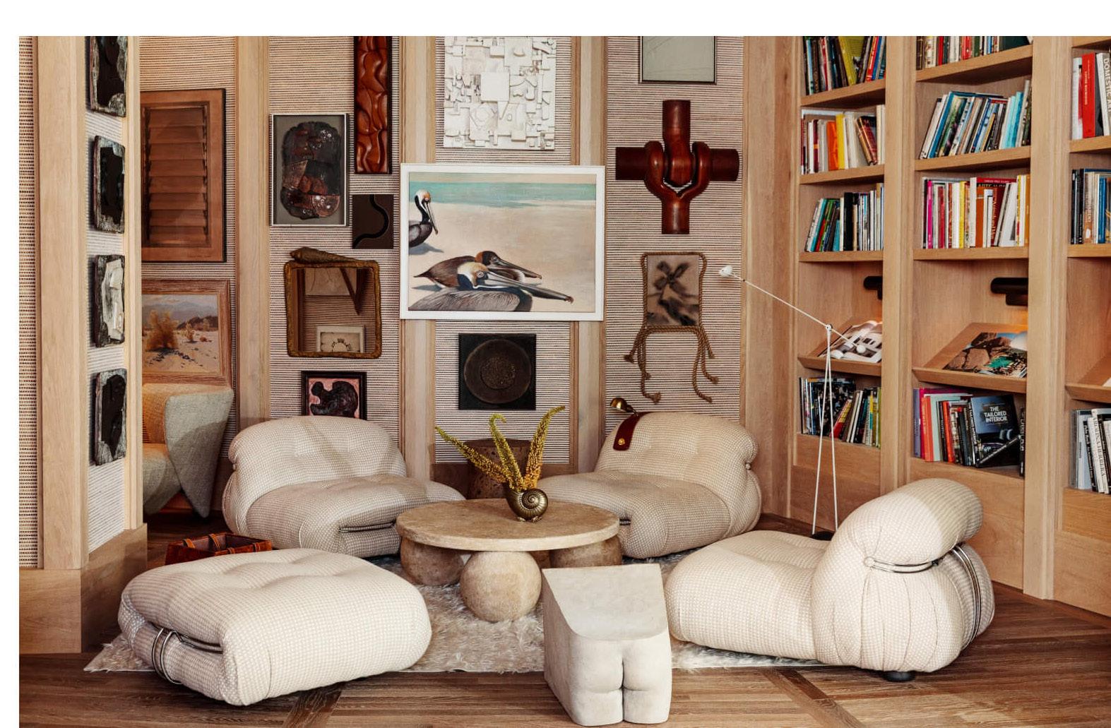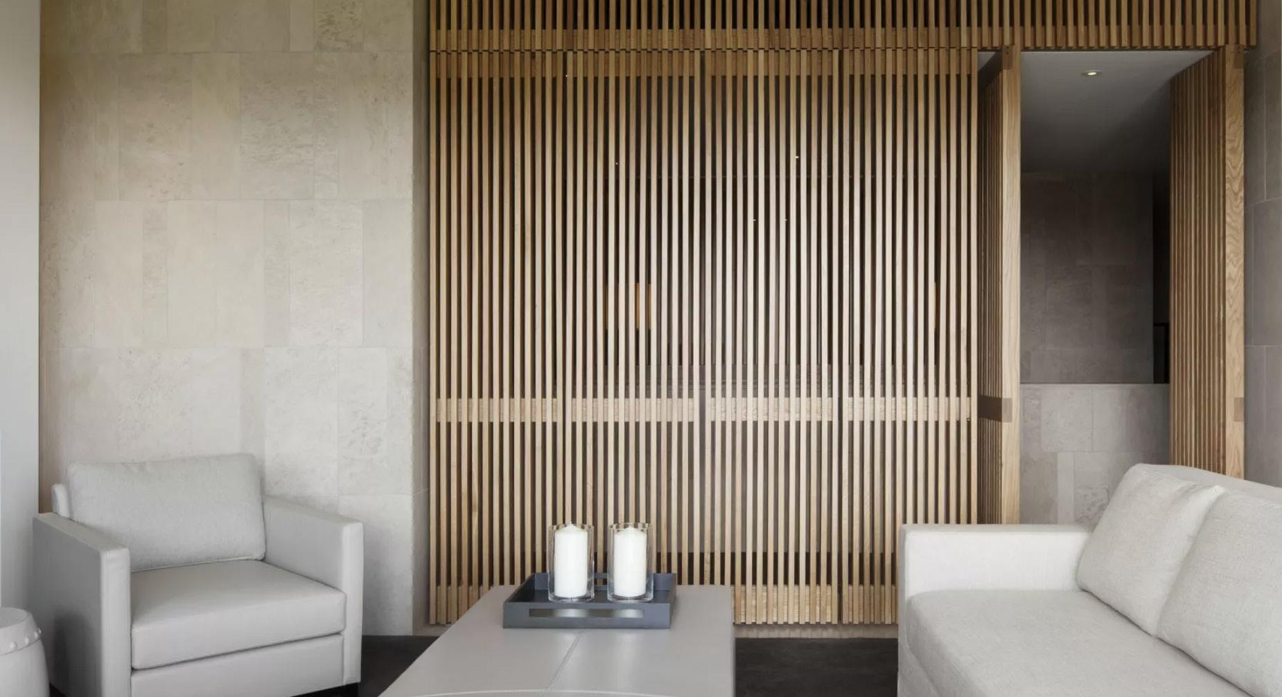 The reception features a hand-carved desk with linework reminiscent of a shell and a sand-infused gesso canvas behind it. The reclaimed oak hardwood floor has an intricate octagonal pattern inspired by a bird’s-eye view of a beach um brella, while a bronze white-wash patina chain link sculpture pierced with a neon light stands 9ft-tall.