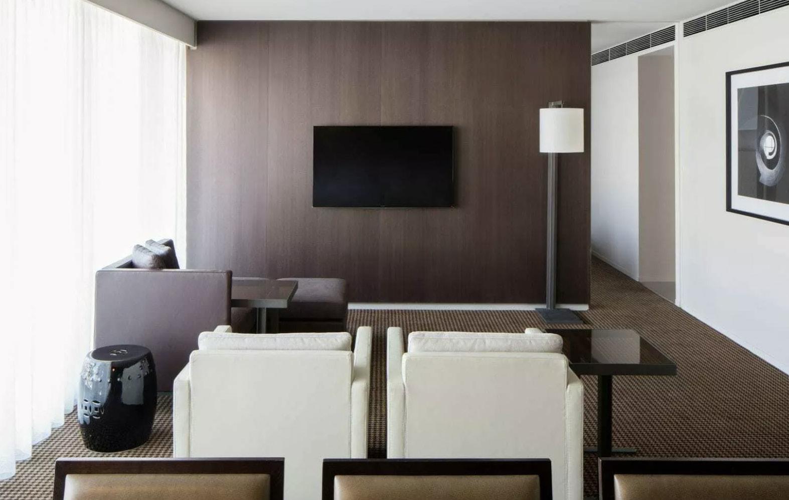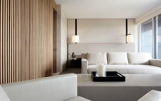 Materiality within each hotel room changes a little, they have used contem porary furniture, using soft minimalist furnishing throughout the space, the bathrooms consist of dark square tiles, marble floors in the bathrooms, carpet throughout the space, white cabinetry. The upper penthouse has a timber clad ding feature wall within the lounge area, floor to ceiling marble bathroom, natu ral toned furnishings for a more sophisticated look.
