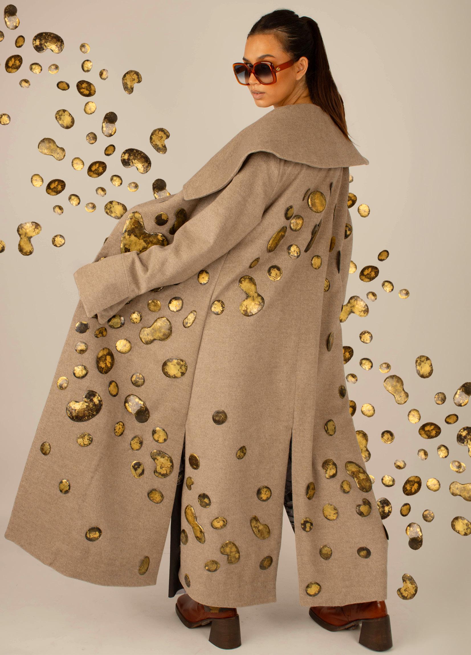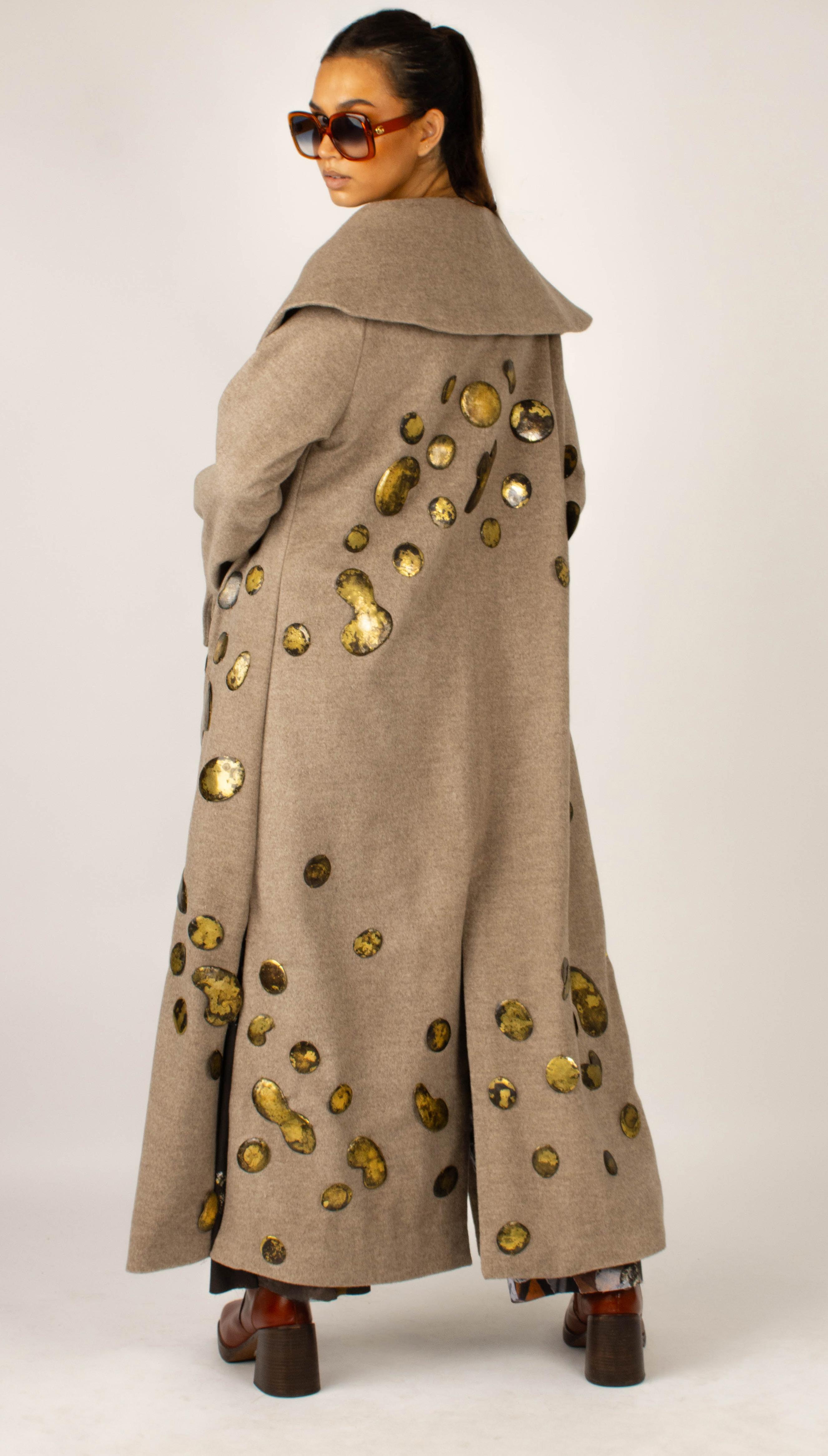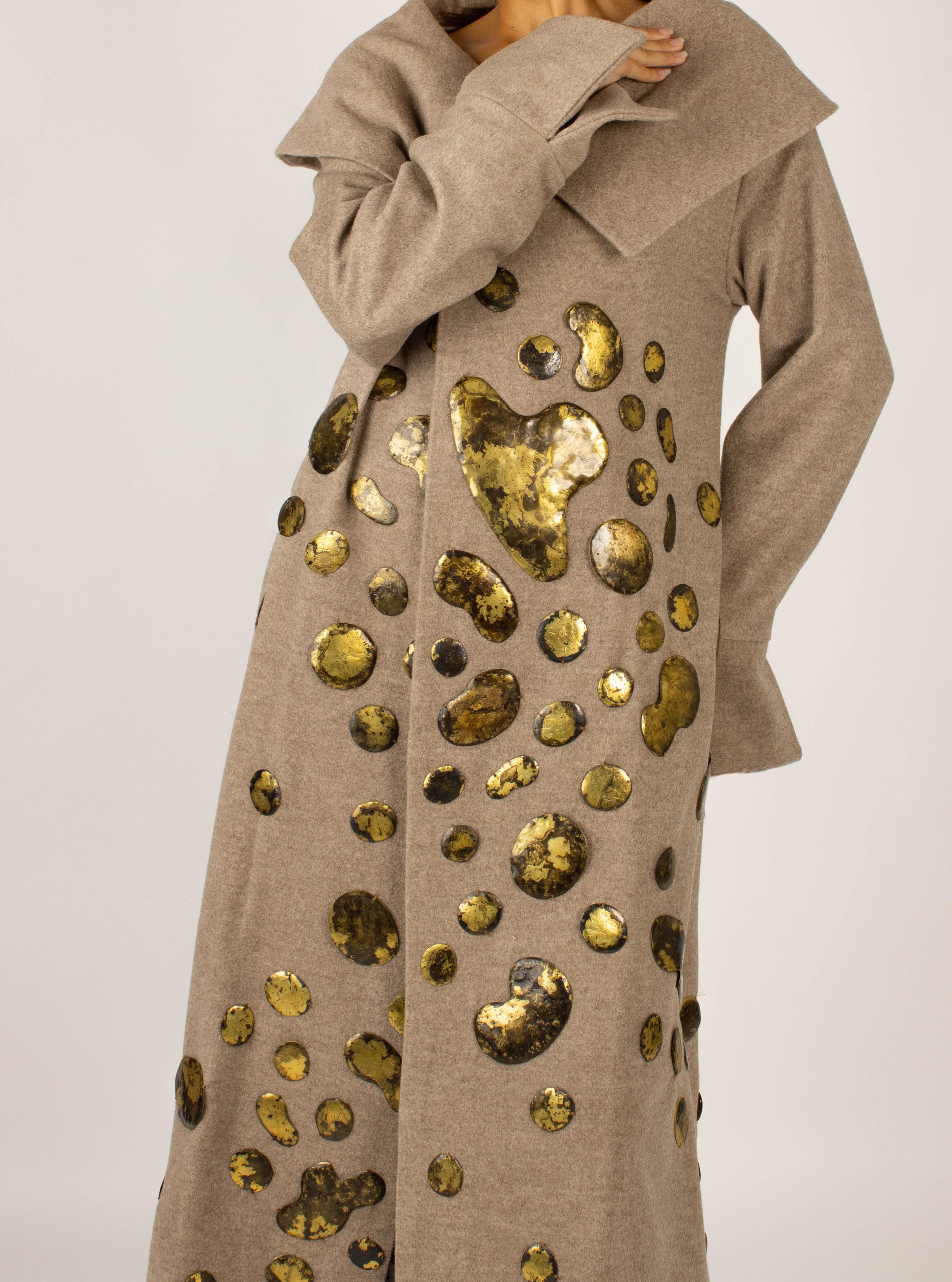 the brass embelishments were born from a long, intuitive collaboration with jewllery smith Kate Hunter. Together we experiemented with form, eright and finish, searching for a metal language that felt ancient and intimate. Each golden shape was refined through countless trials, hammered, cast and patinated until they carried the quiet irregularity of something unearth rather than manufactured. each piece is completely its own, surface texture and patina taking its own form on each piece. the result is a series of bespoke relics that cling to the coat like fragments of remembered moments, their presence a testament to craft, connection and the shared pursuit of the right solution.