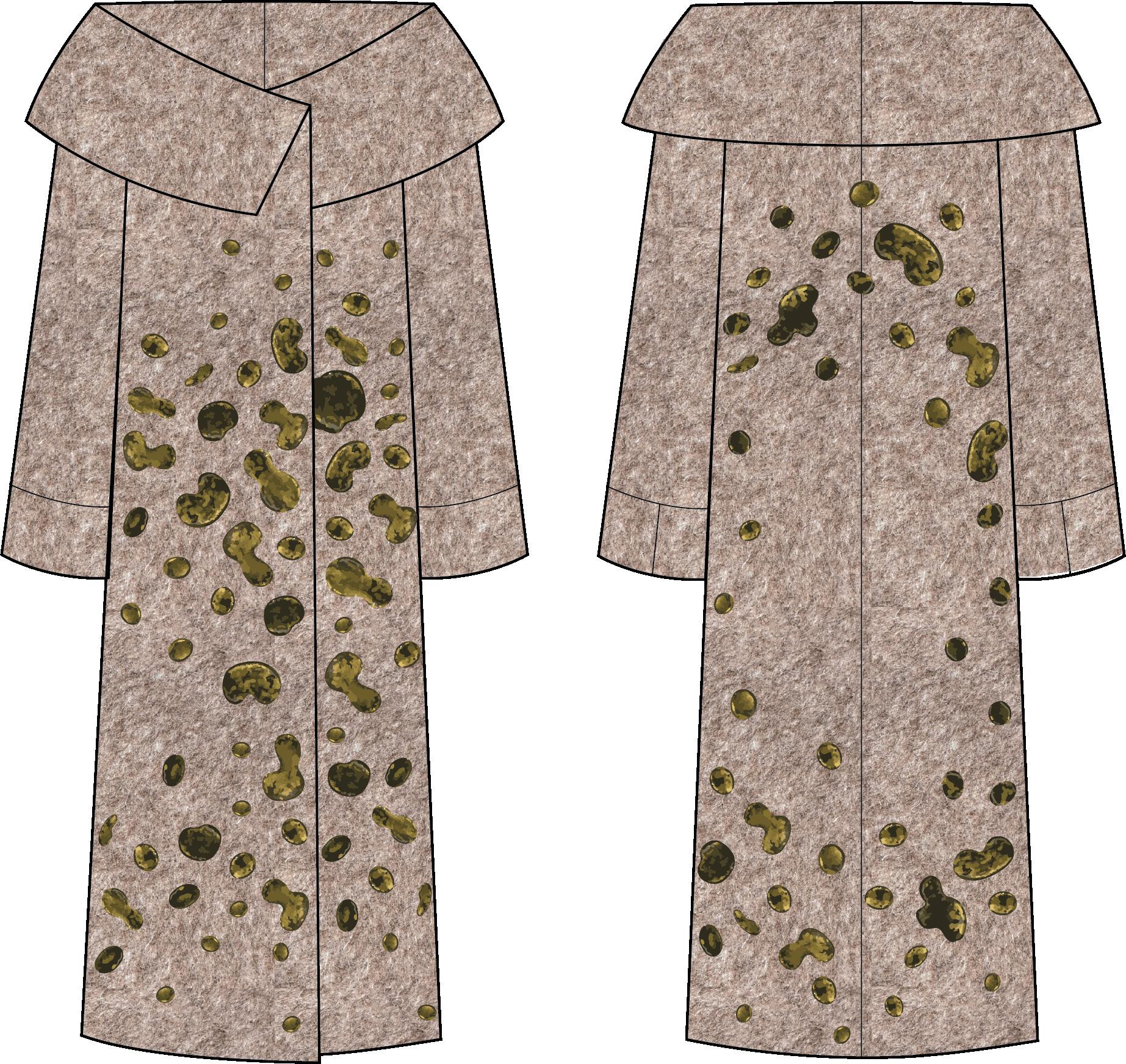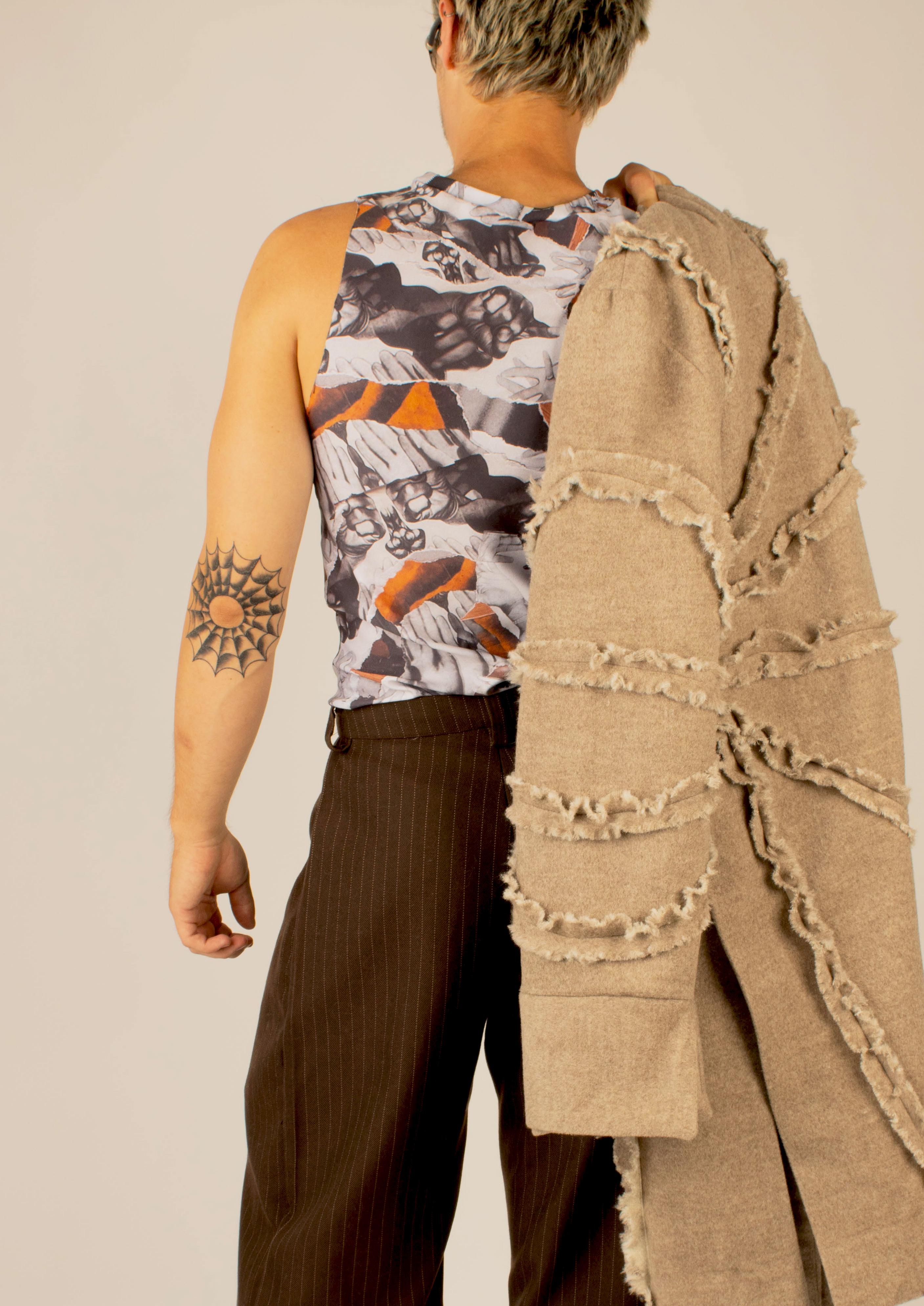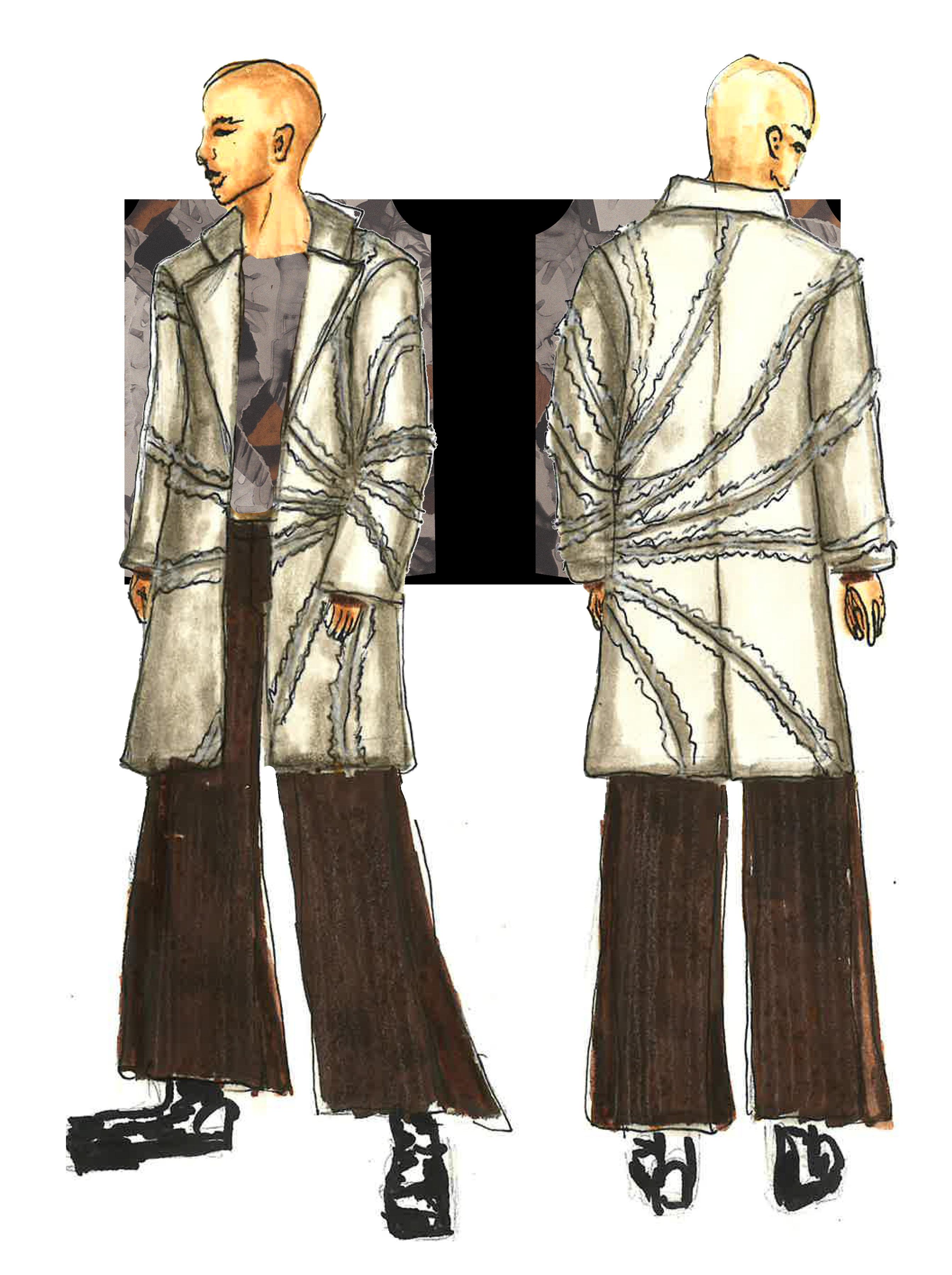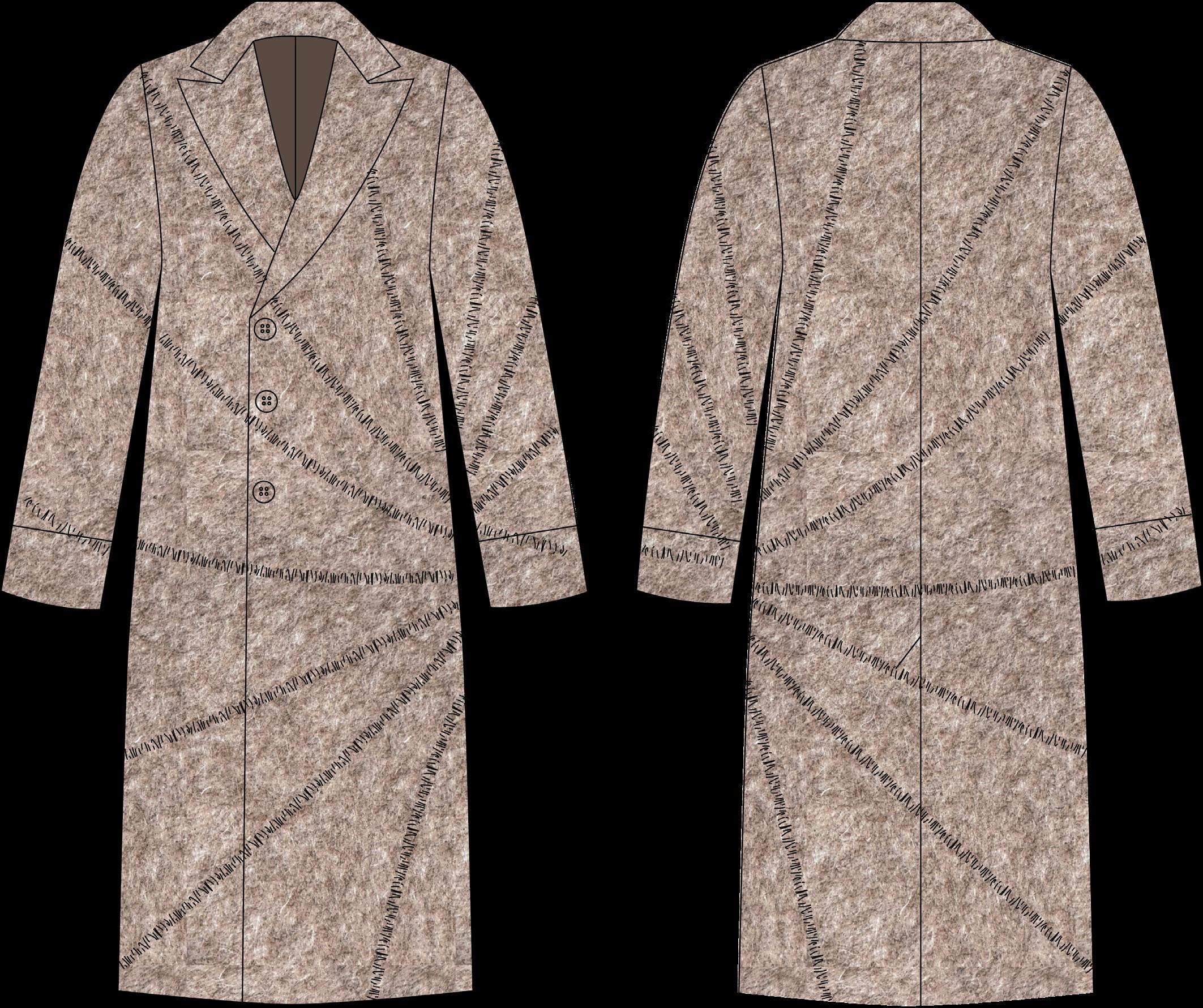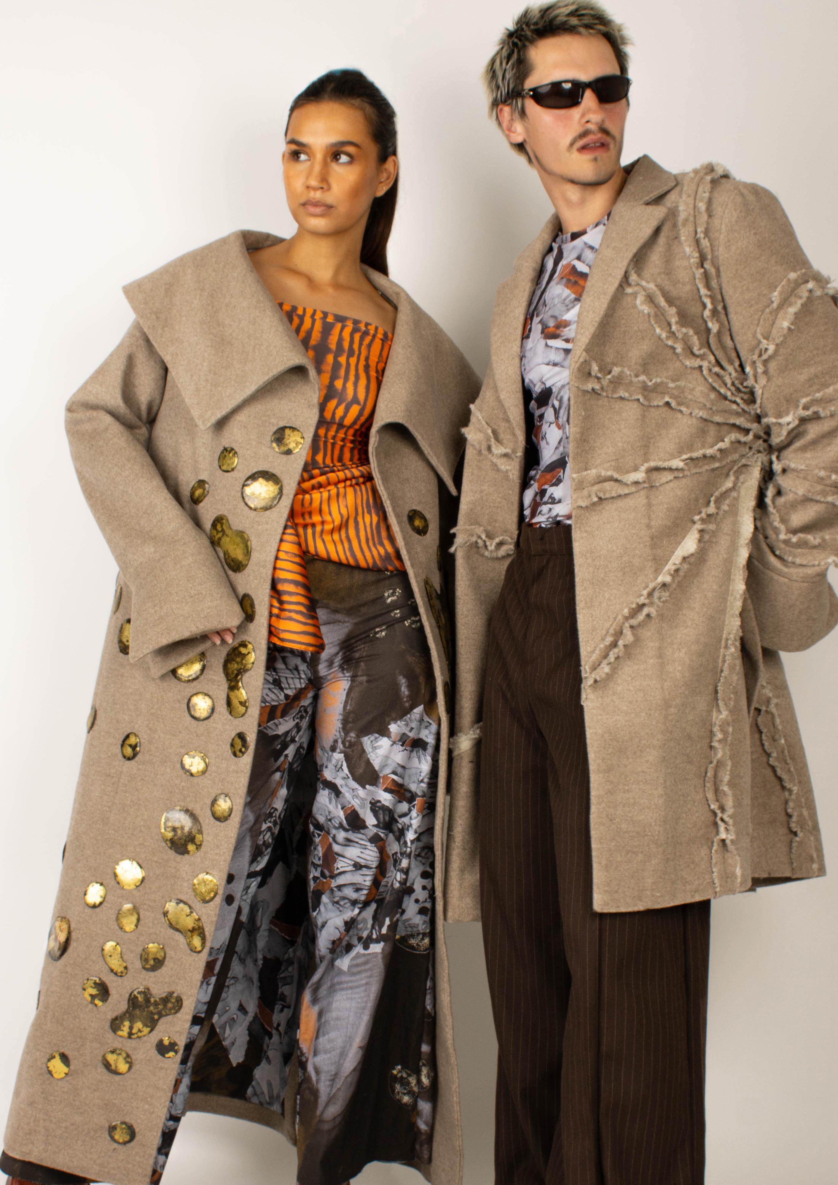 The menswear coat acts as the collections counterbalance. It’s deliberate fraying seams form starburst lines that unravel and grow, wrapping around the body. This texture speaks directly to the metallic patina blooming across the hero coat. Together, the fray and patina reflect the dichotomy between erosion and endurance. Time marks us, beautifully and without permission.