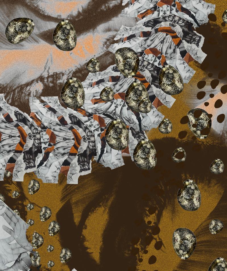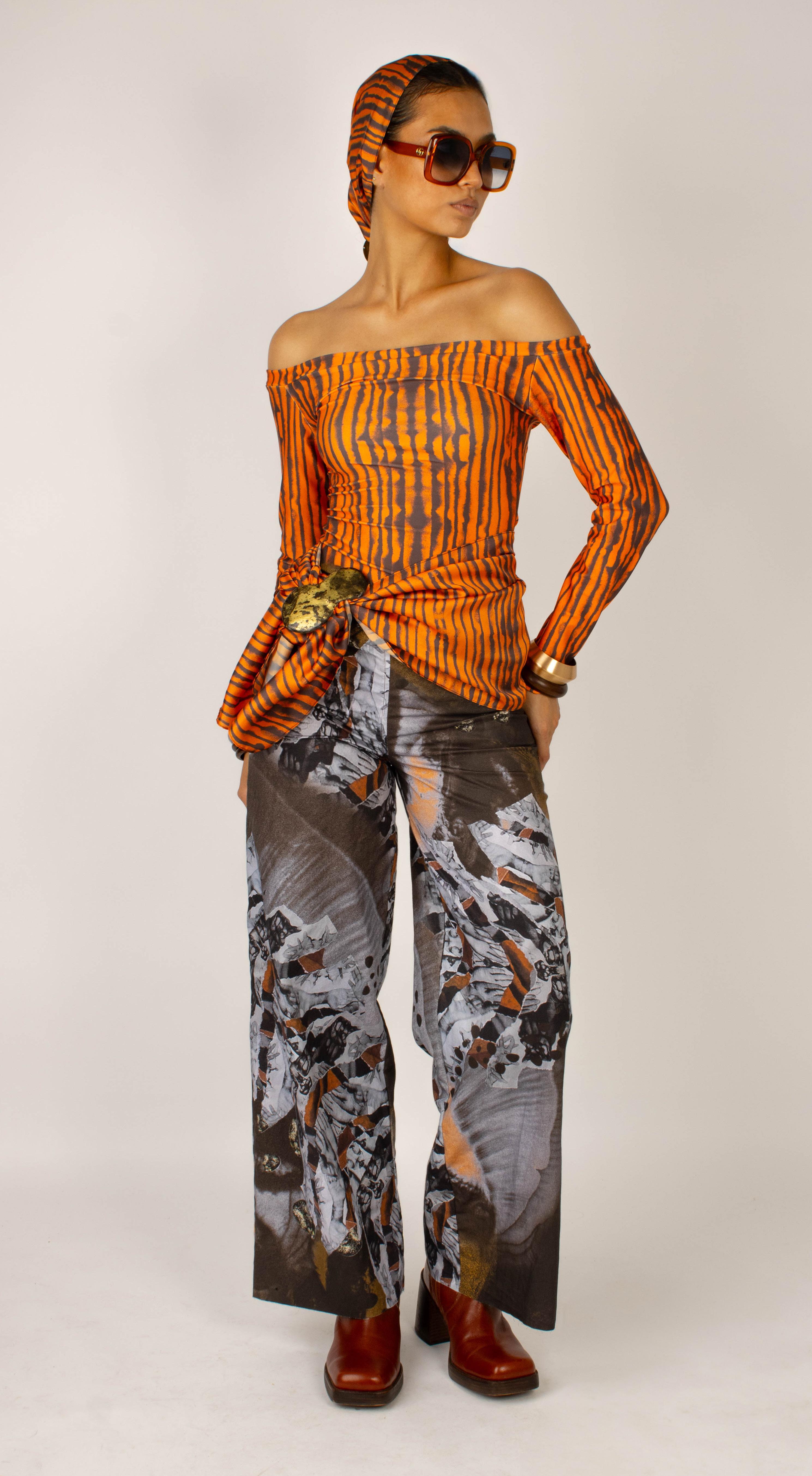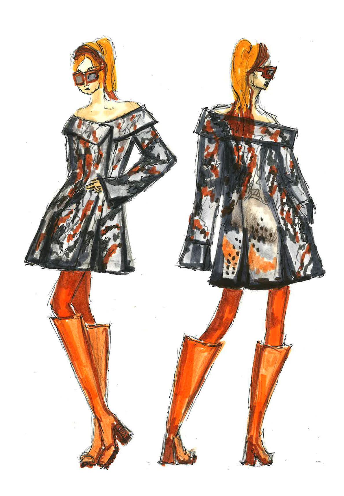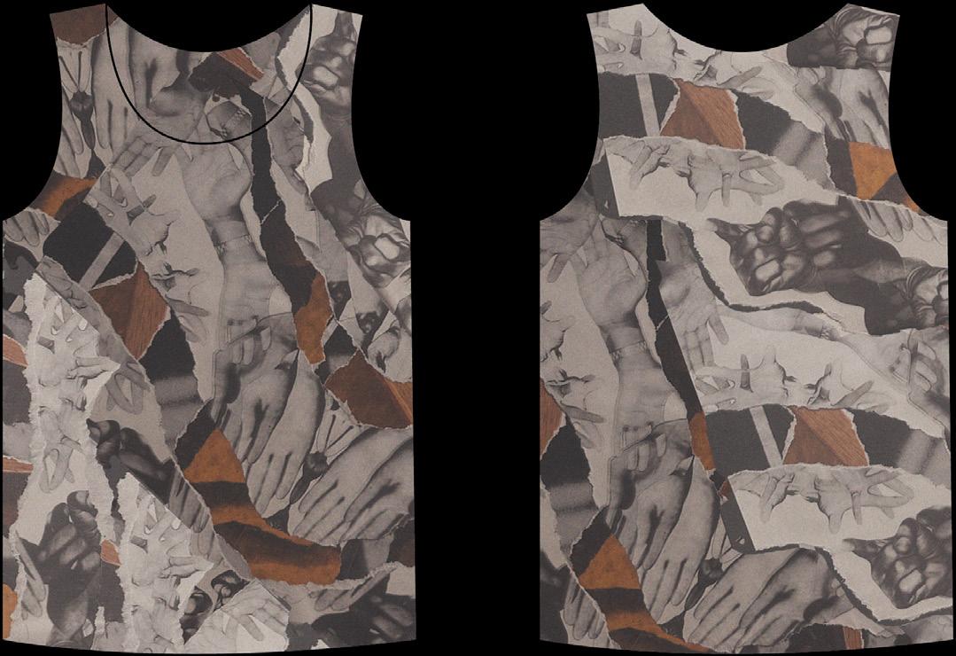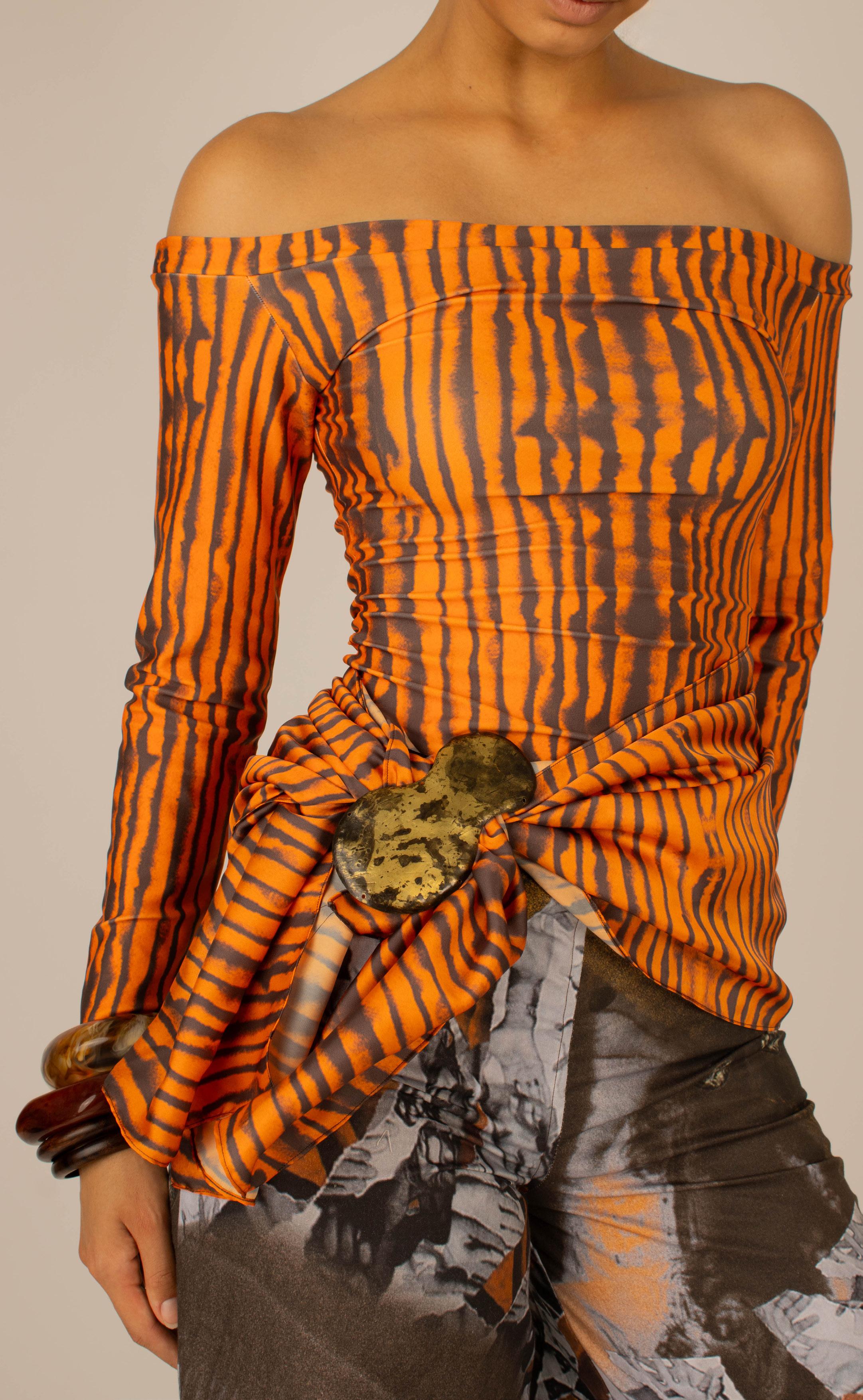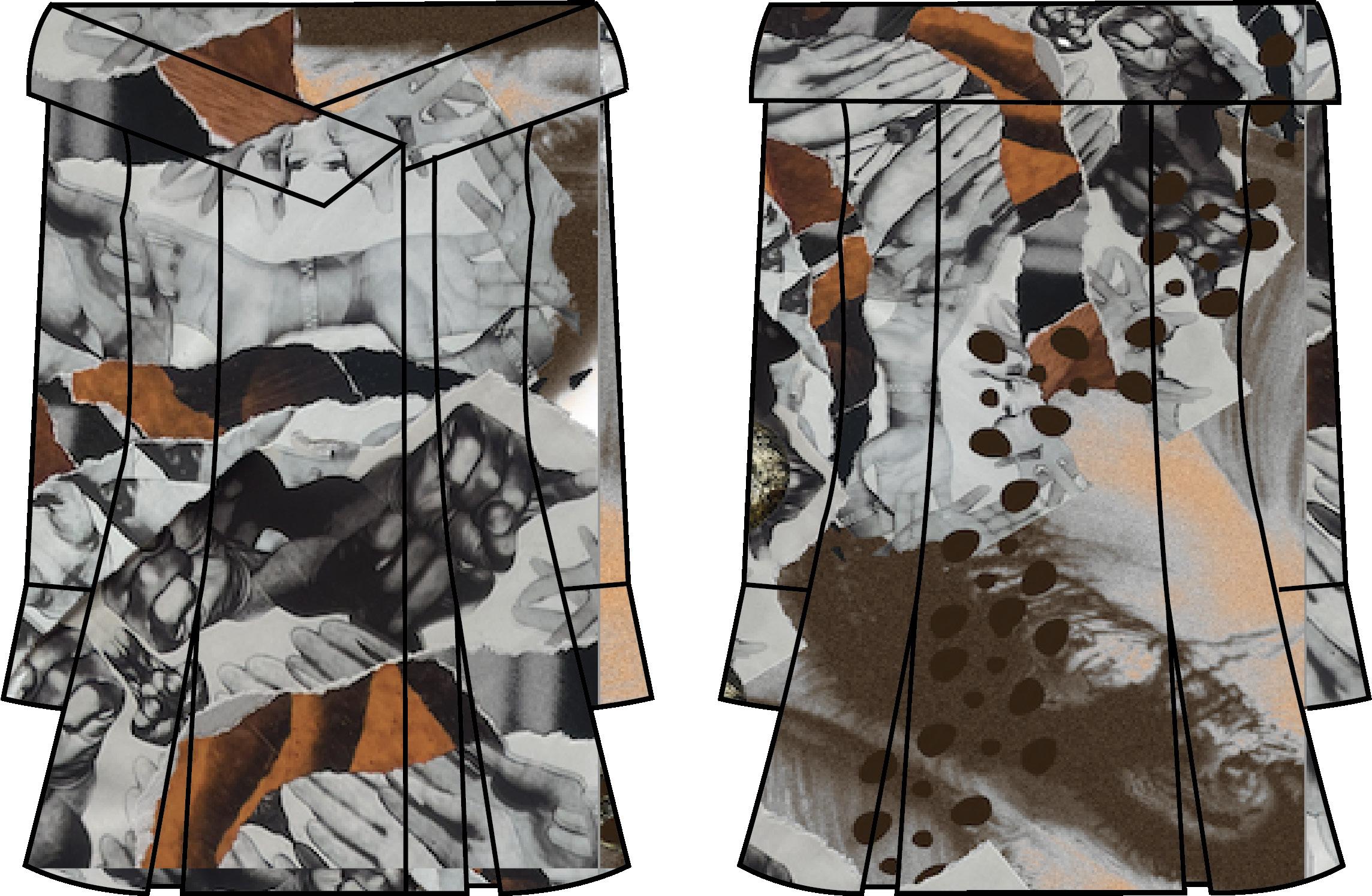 The menswear coat acts as the collections counterbalance. It’s deliberate fraying seams form starburst lines that unravel and grow, wrapping around the body. This texture speaks directly to the metallic patina blooming across the hero coat. Together, the fray and patina reflect the dichotomy between erosion and endurance. Time marks us, beautifully and without permission.