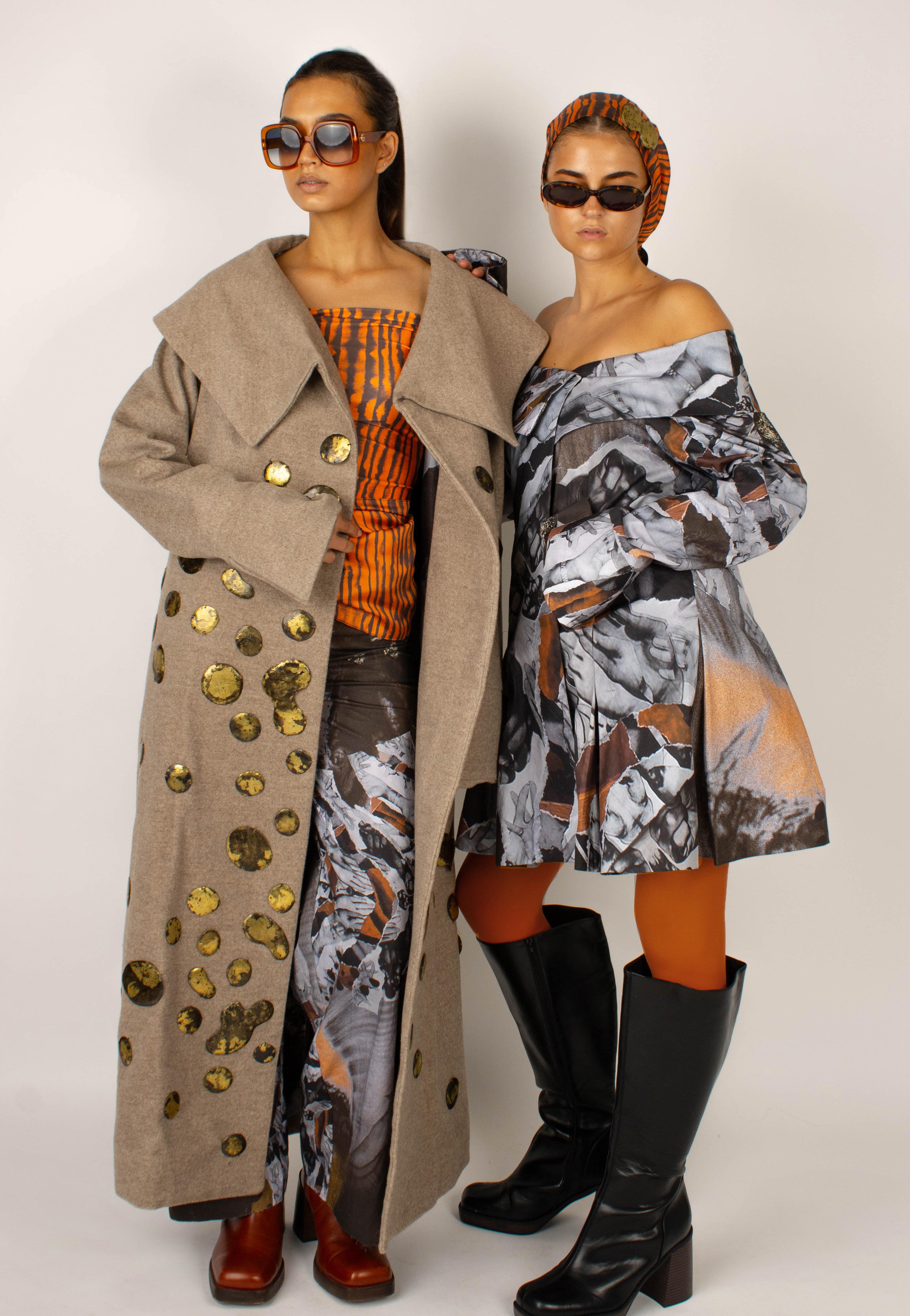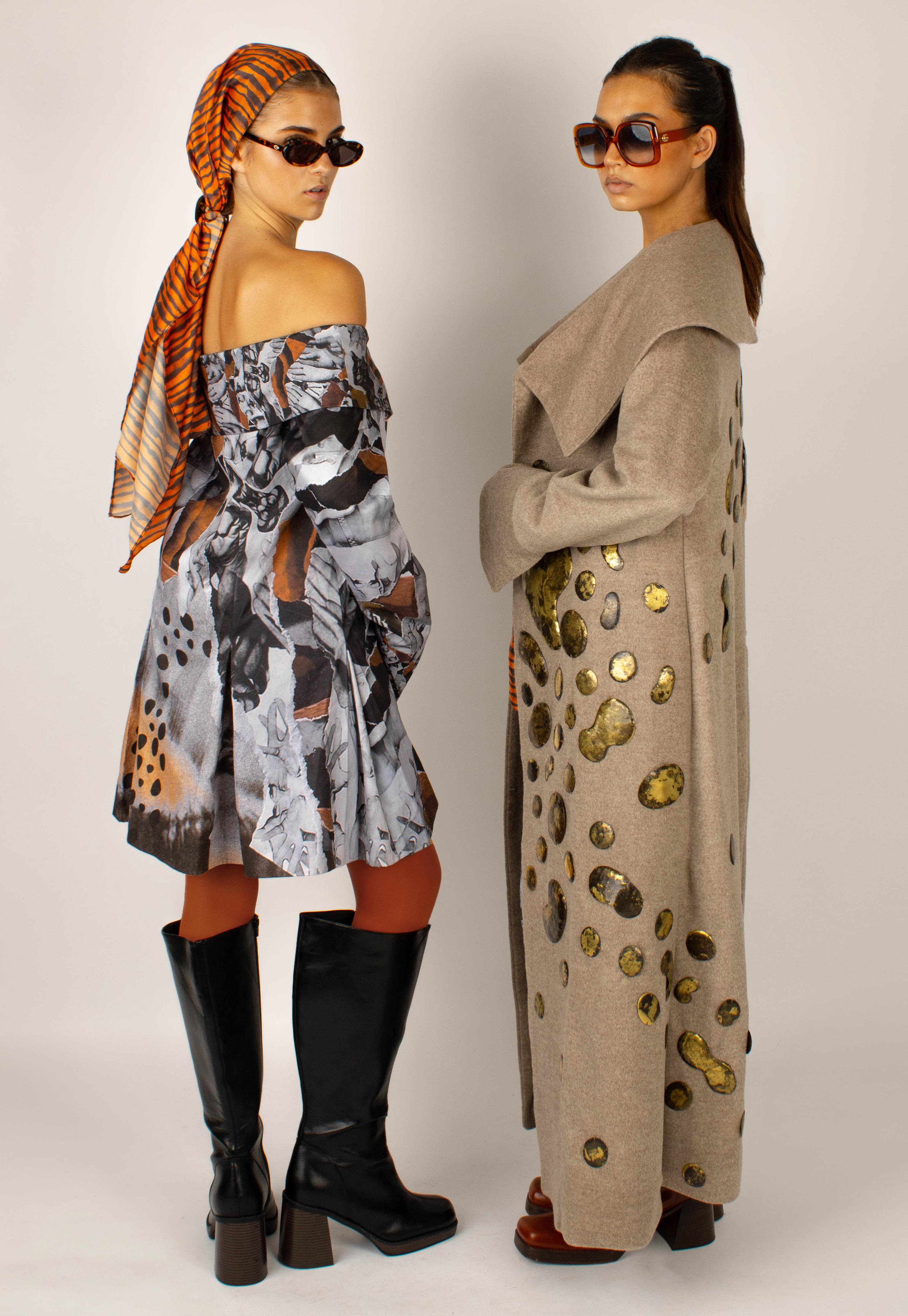 Old Gold is an homage to the past, a collection inspired by the comfort and familiarity of memory. This collection embraces the soft echoes that live inside the clothes that we have loved, borrowed, shared and outgrown. A coat passed between siblings feels that like home, or the matching dresses that sisters are forced to wear by their mothers. Fashion is a tactile diary of our lives, fabric worn and rewoven into our memories. The bespoke brass embellishments, golden shapes that scatter across the hero coat like weathered relics, reflect the way memories connect us to fashion and design.
