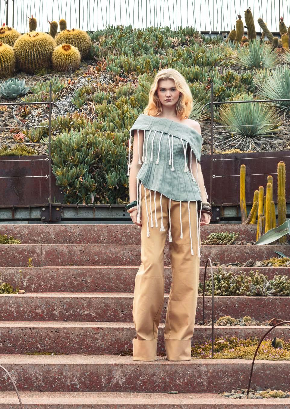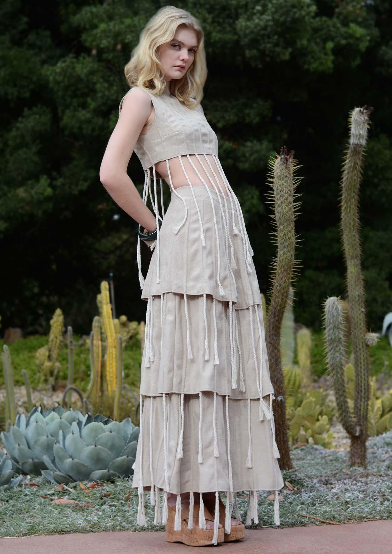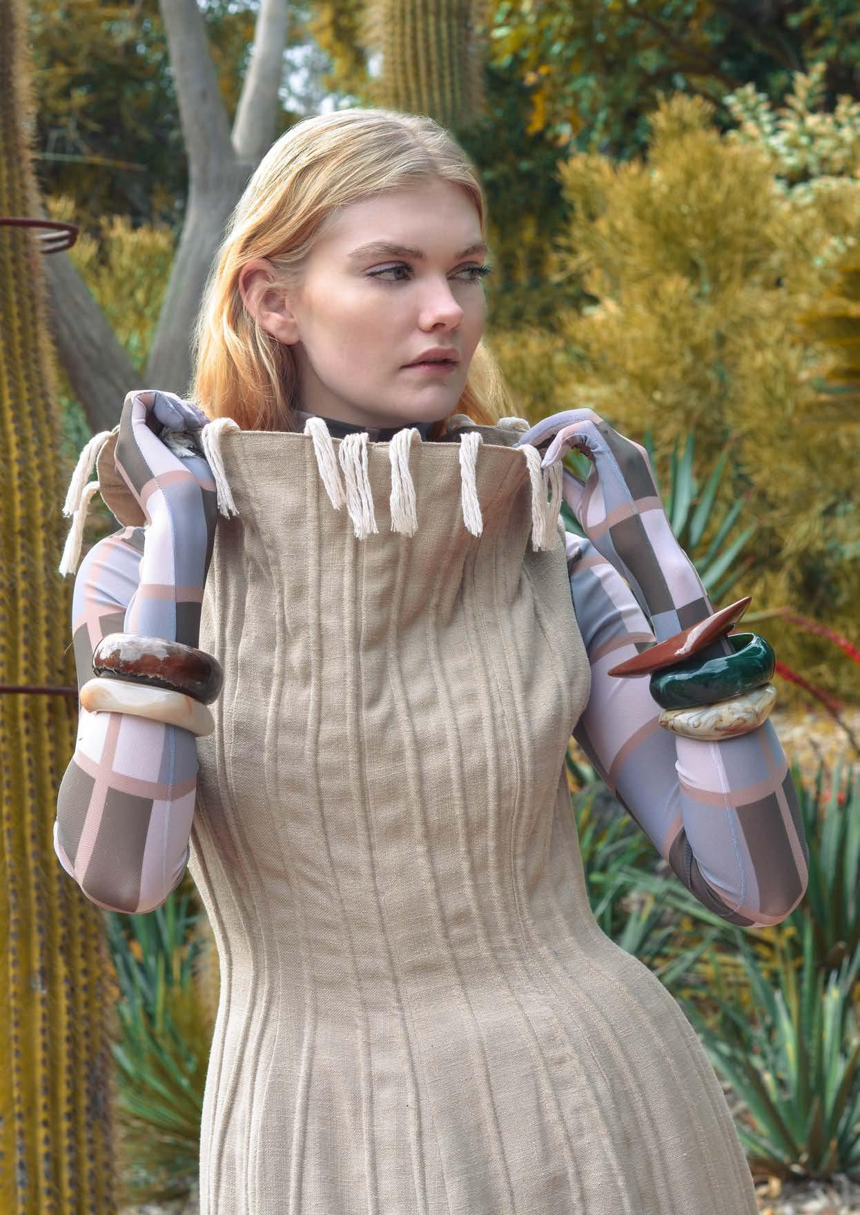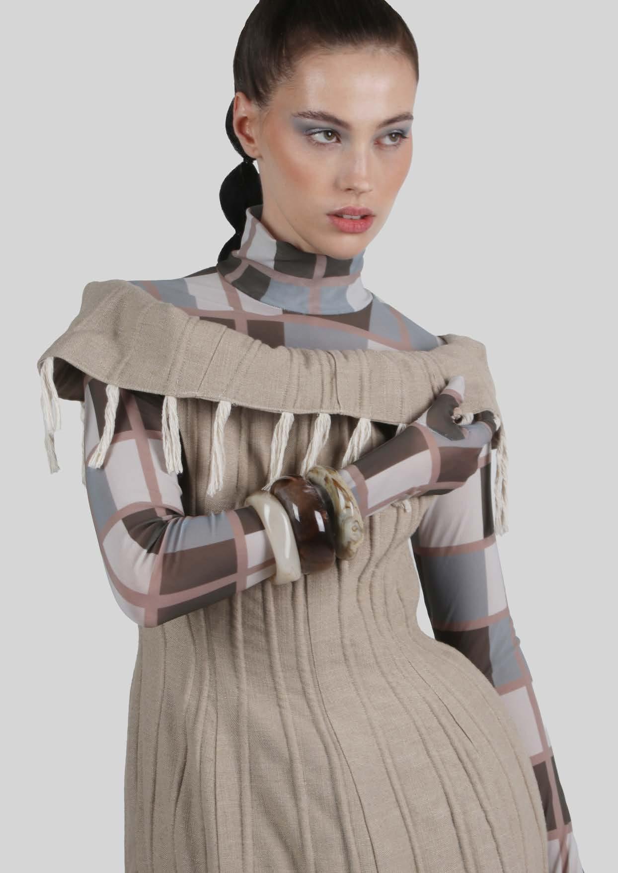 that extend and refine the silhouette. As each cord leads into softly frayed ends, it also introduces a sense of gentle movement which brings the collection to life. Meanwhile, geometric print lends structure and precision, balancing the collection’s organic tactility with measured, intentional form.