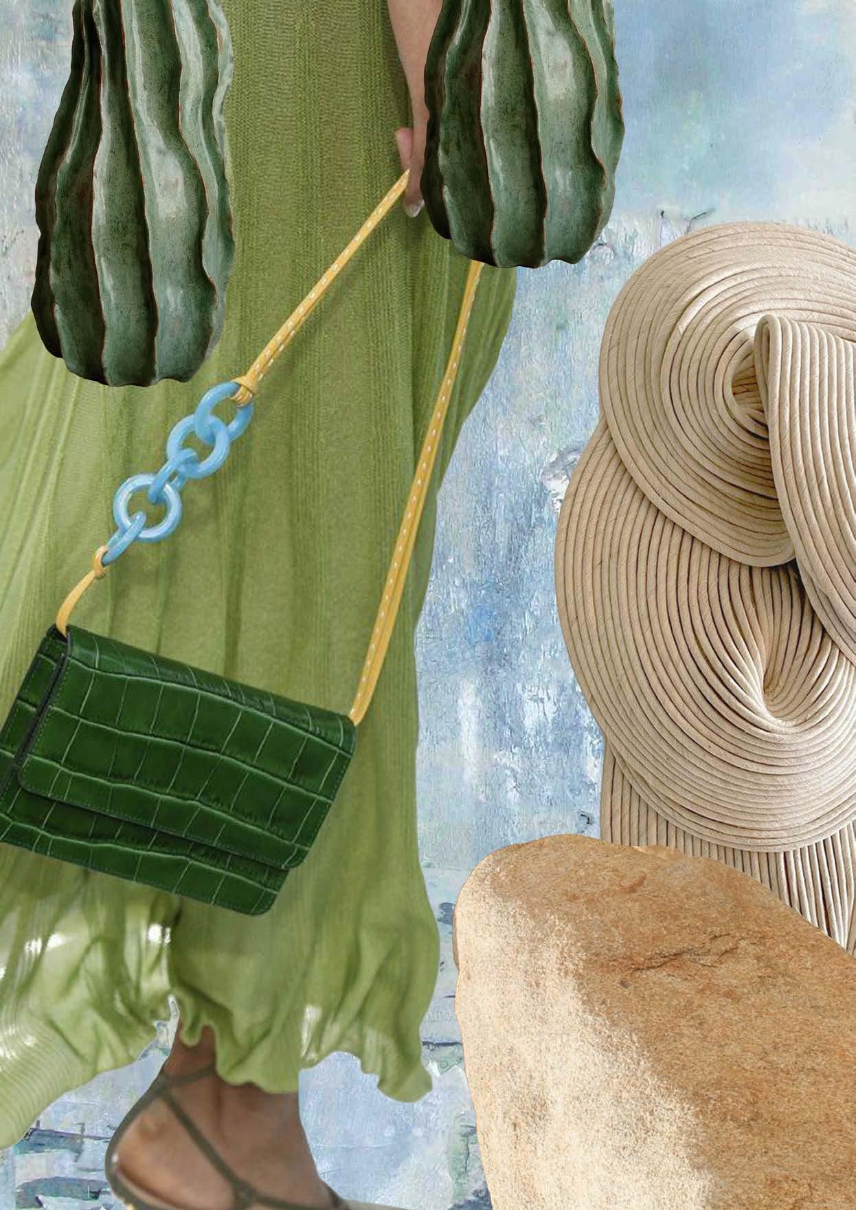 The collection’s grounded colour palette of ecru, sand, and weathered blue is enriched by green and caramel, evoking the natural landscape and embuing the range with a sense of calm.