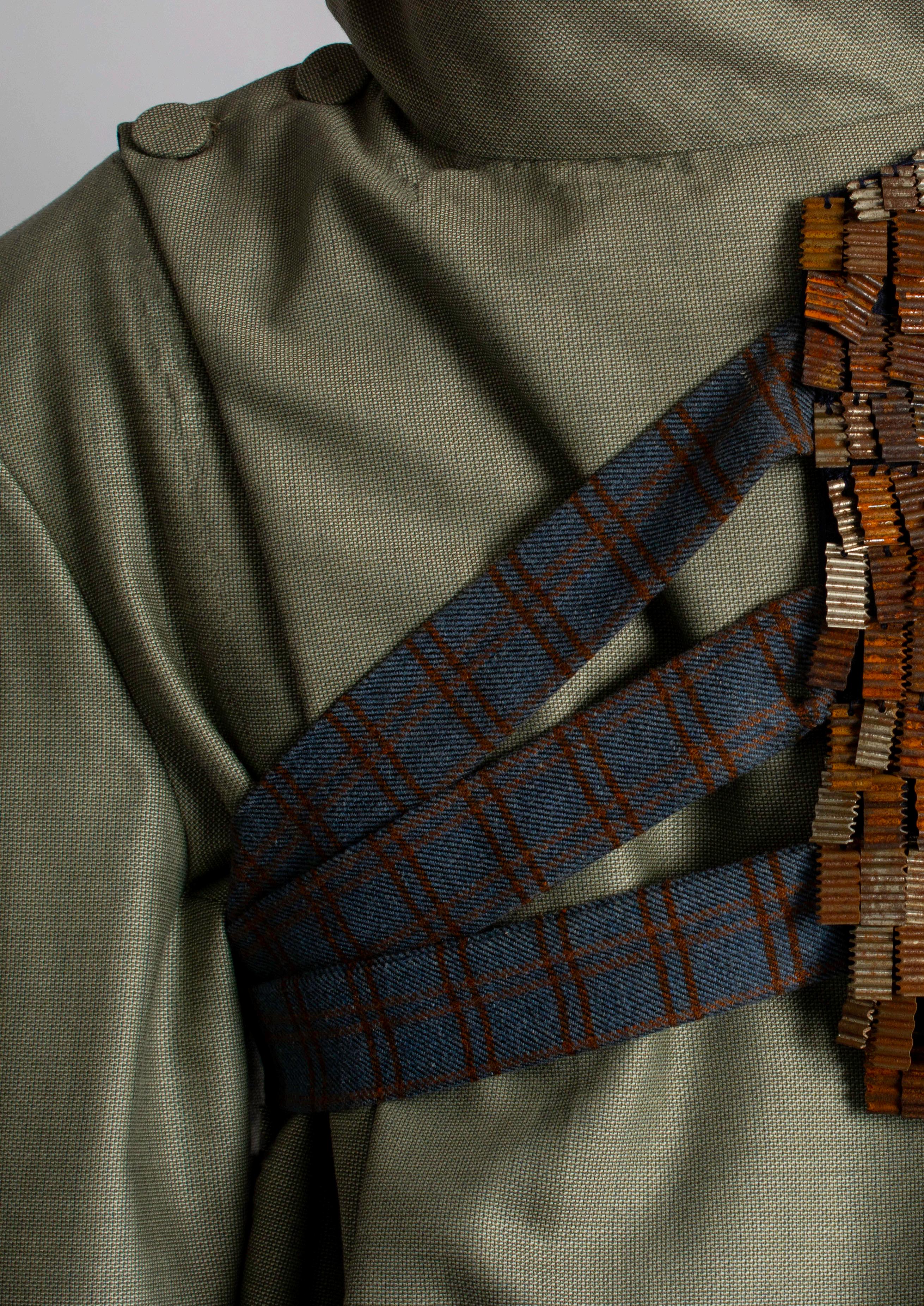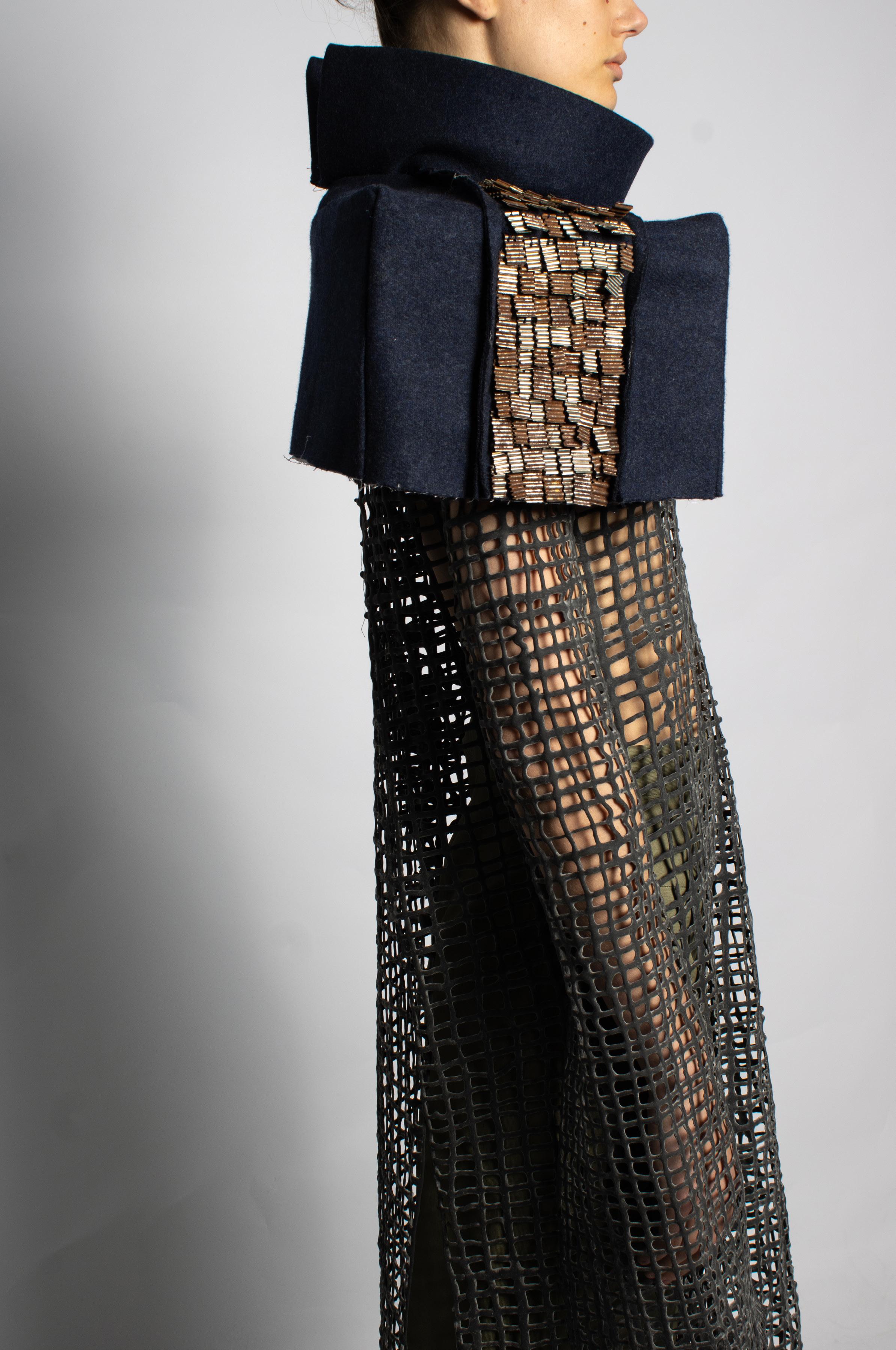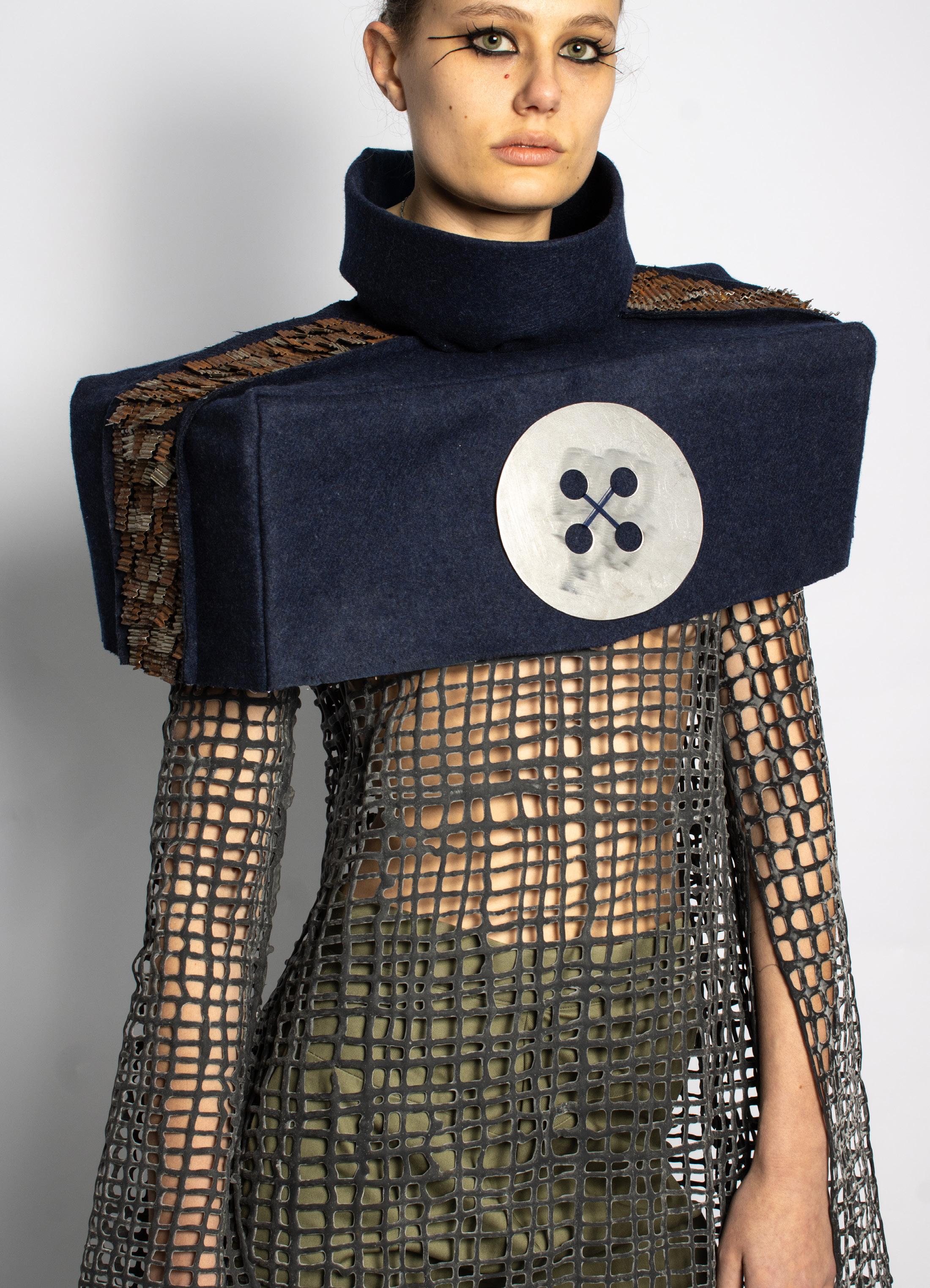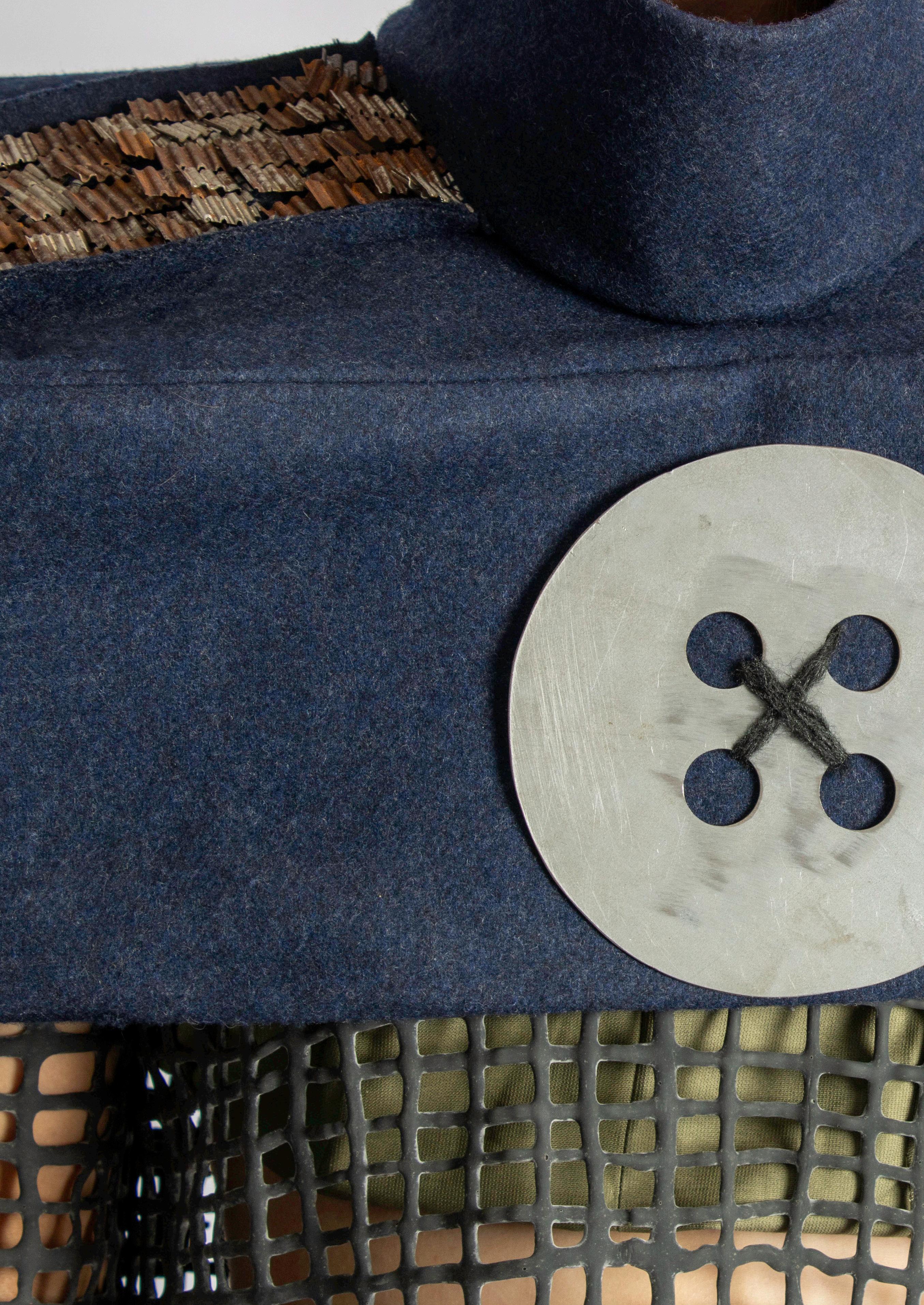 Features include hand-piped liquid latex mesh inspired by farm fencing, rusted nail beads used as textural embellishments, and hand crafted oversized metal buttons, referencing industrial hardware. These elements merge traditional wool tailoring with experimental surface work.