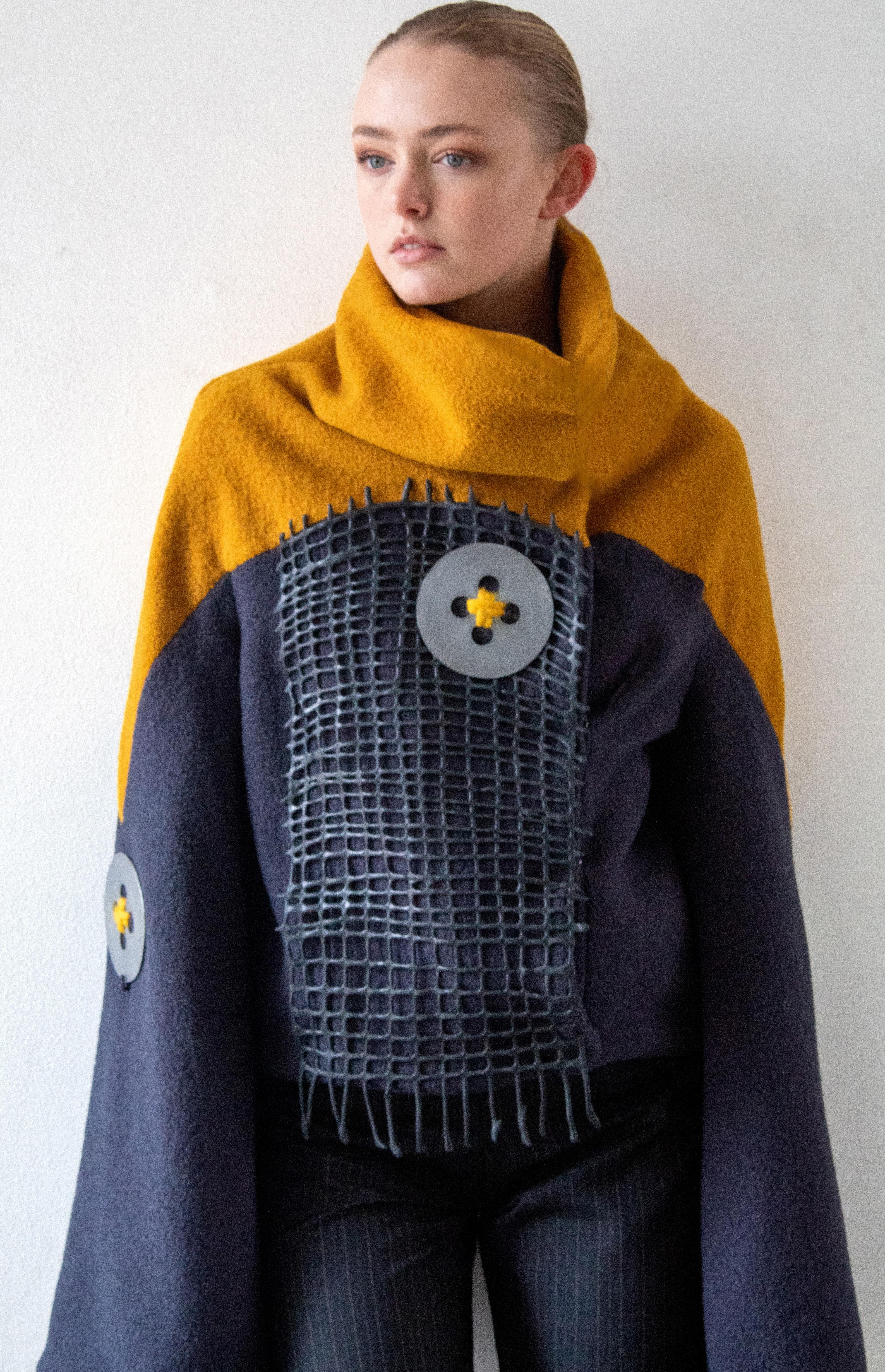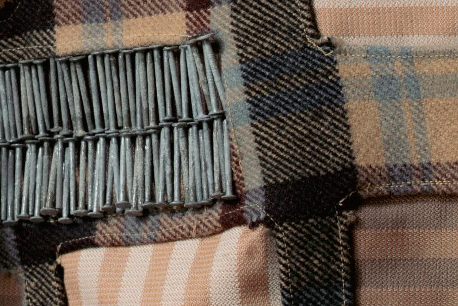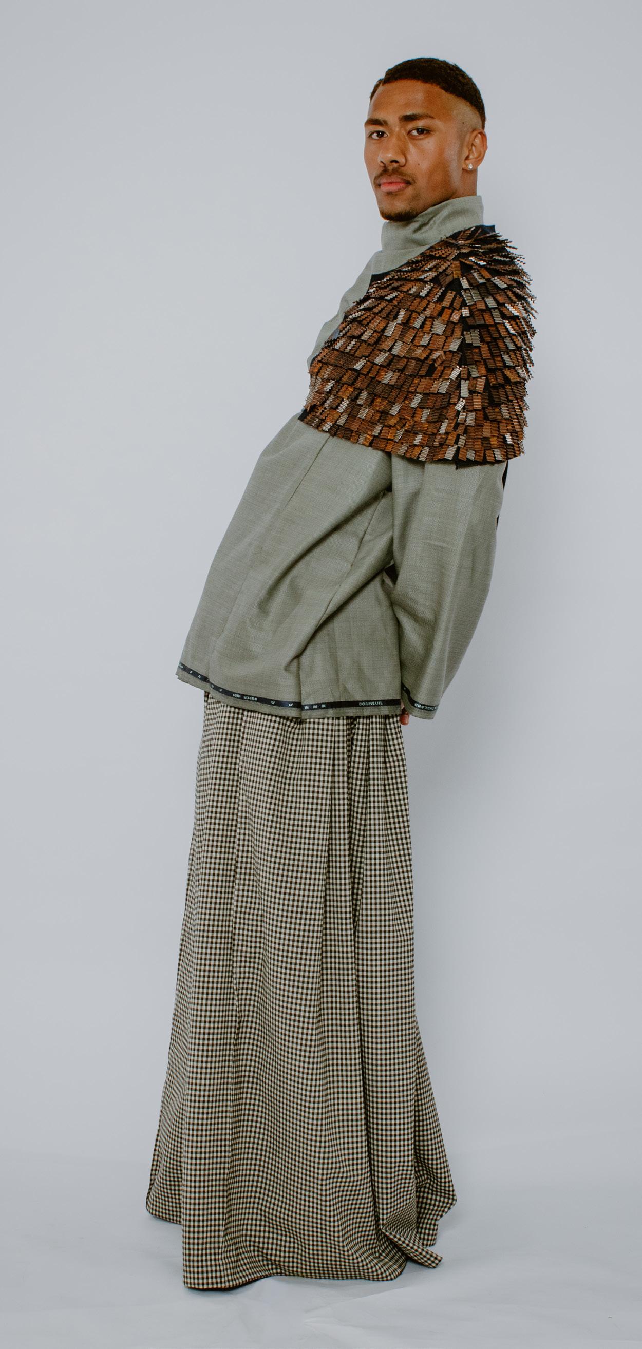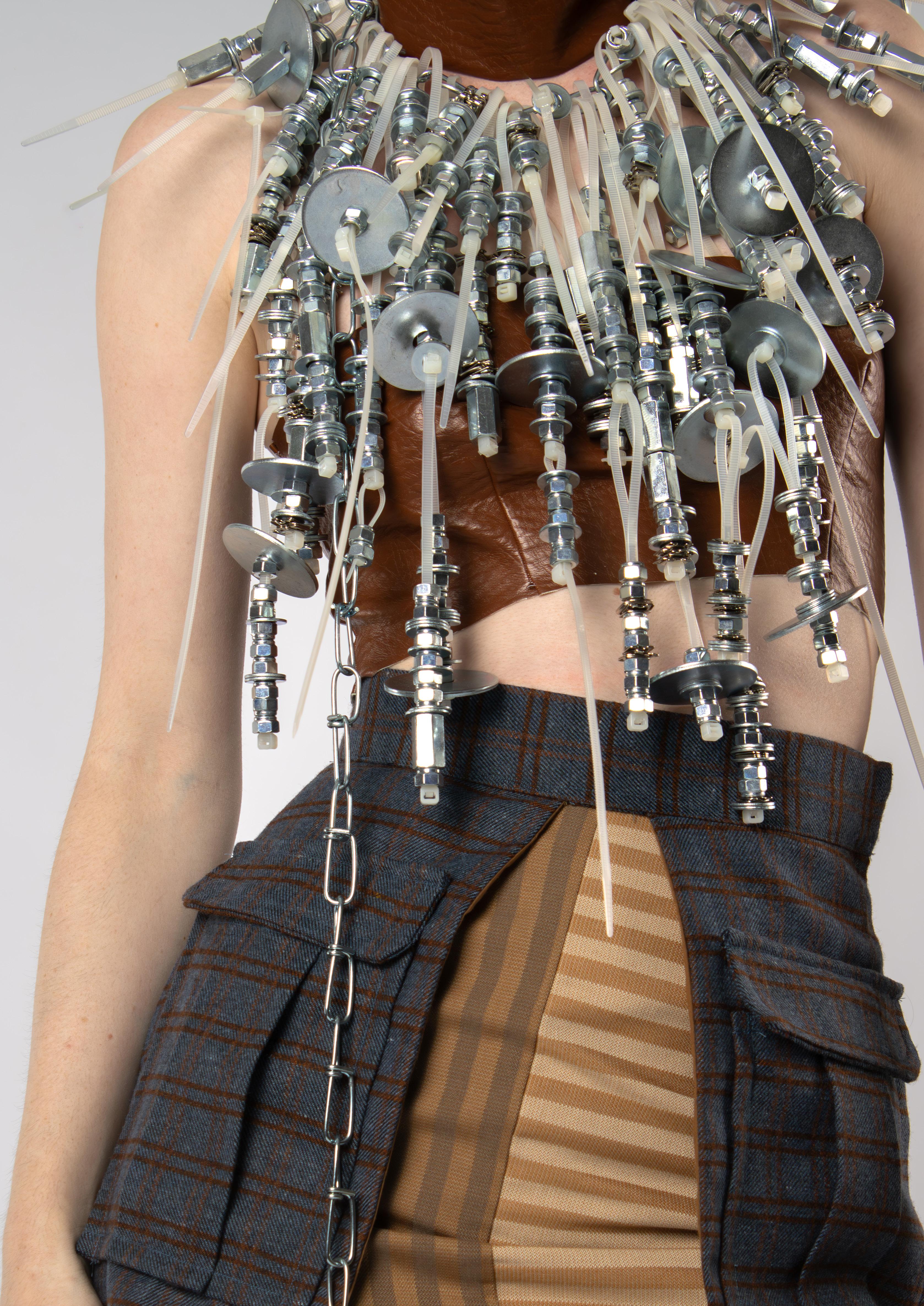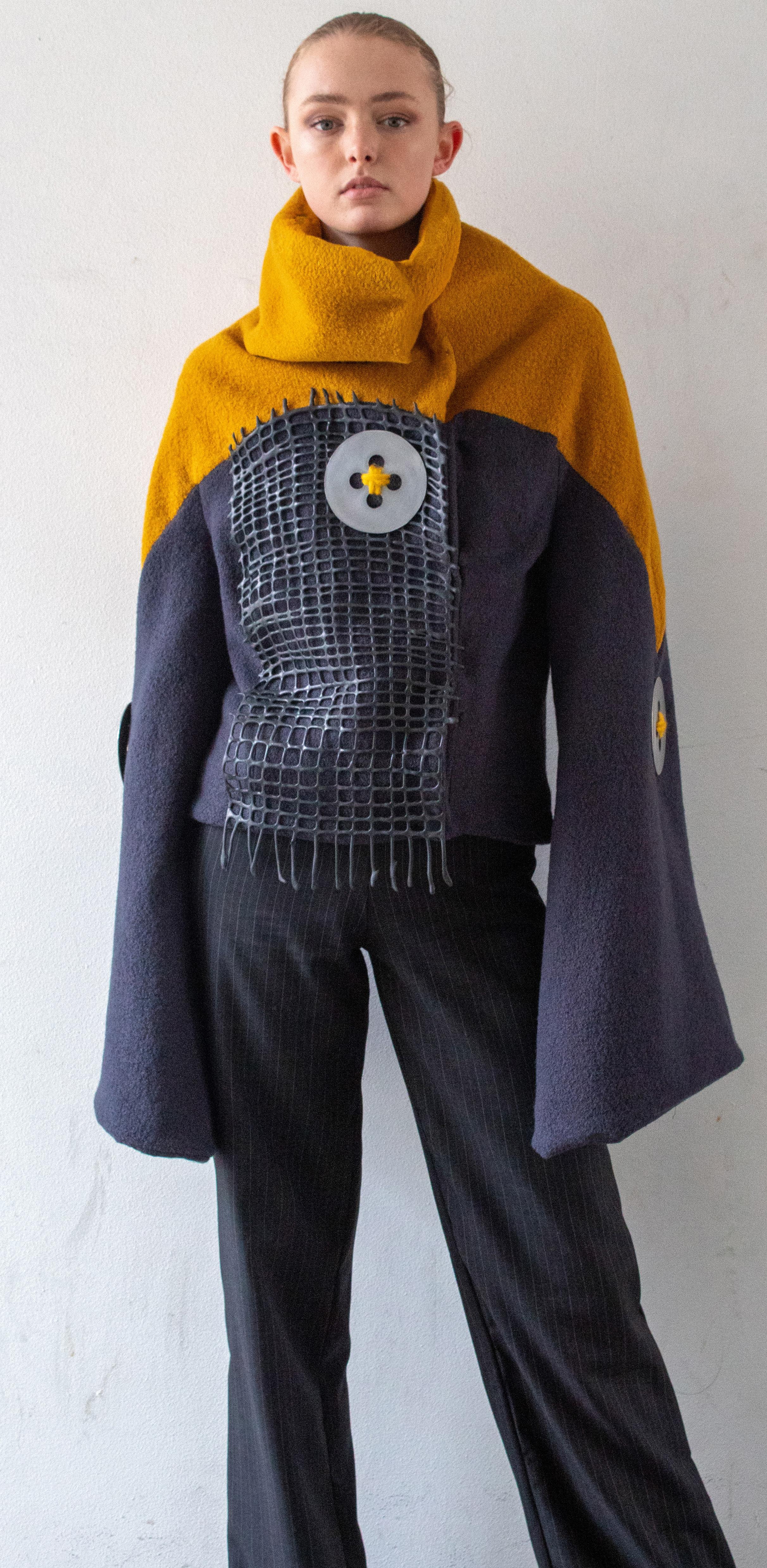 Features include hand-piped liquid latex mesh inspired by farm fencing, rusted nail beads used as textural embellishments, and hand crafted oversized metal buttons, referencing industrial hardware. These elements merge traditional wool tailoring with experimental surface work.