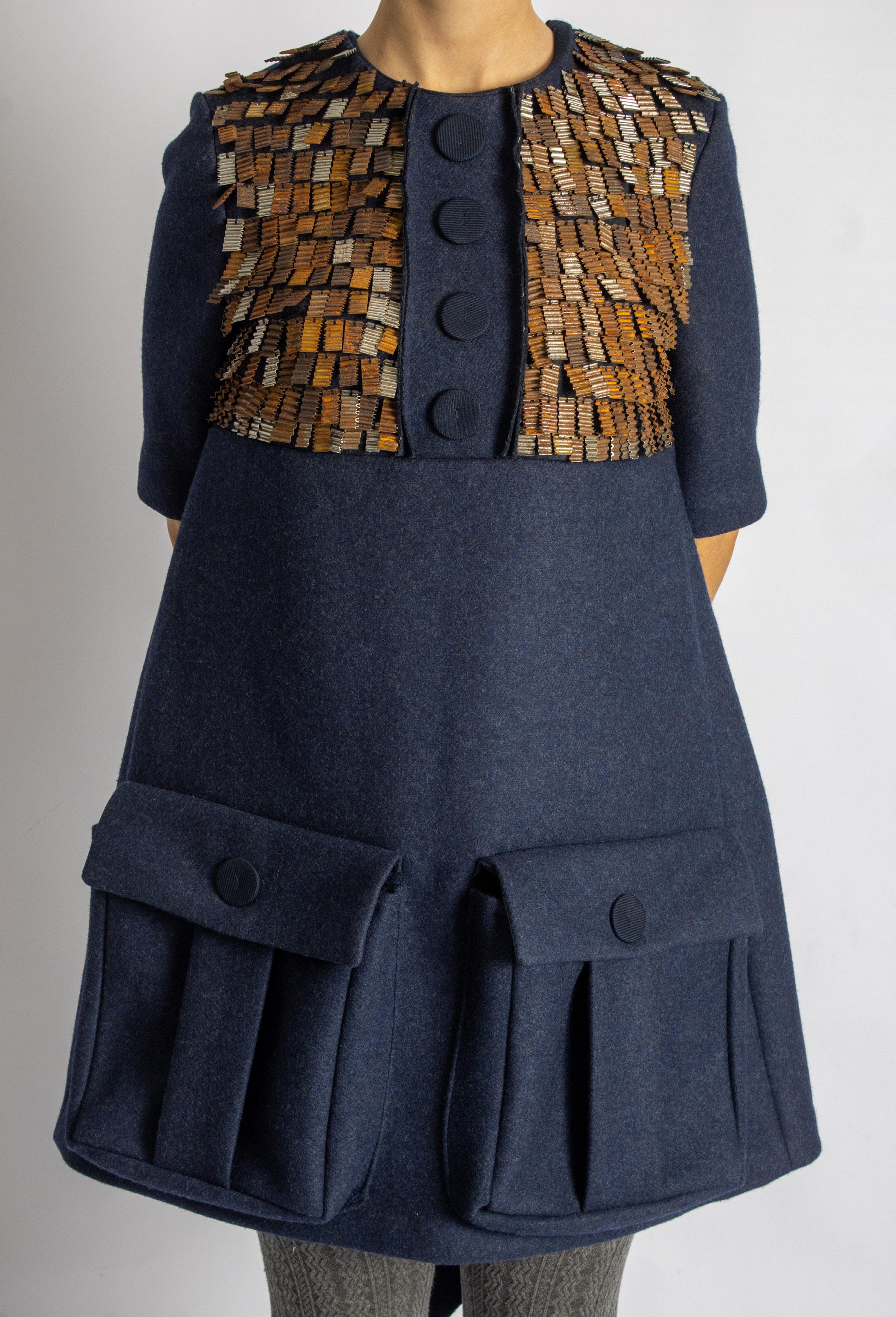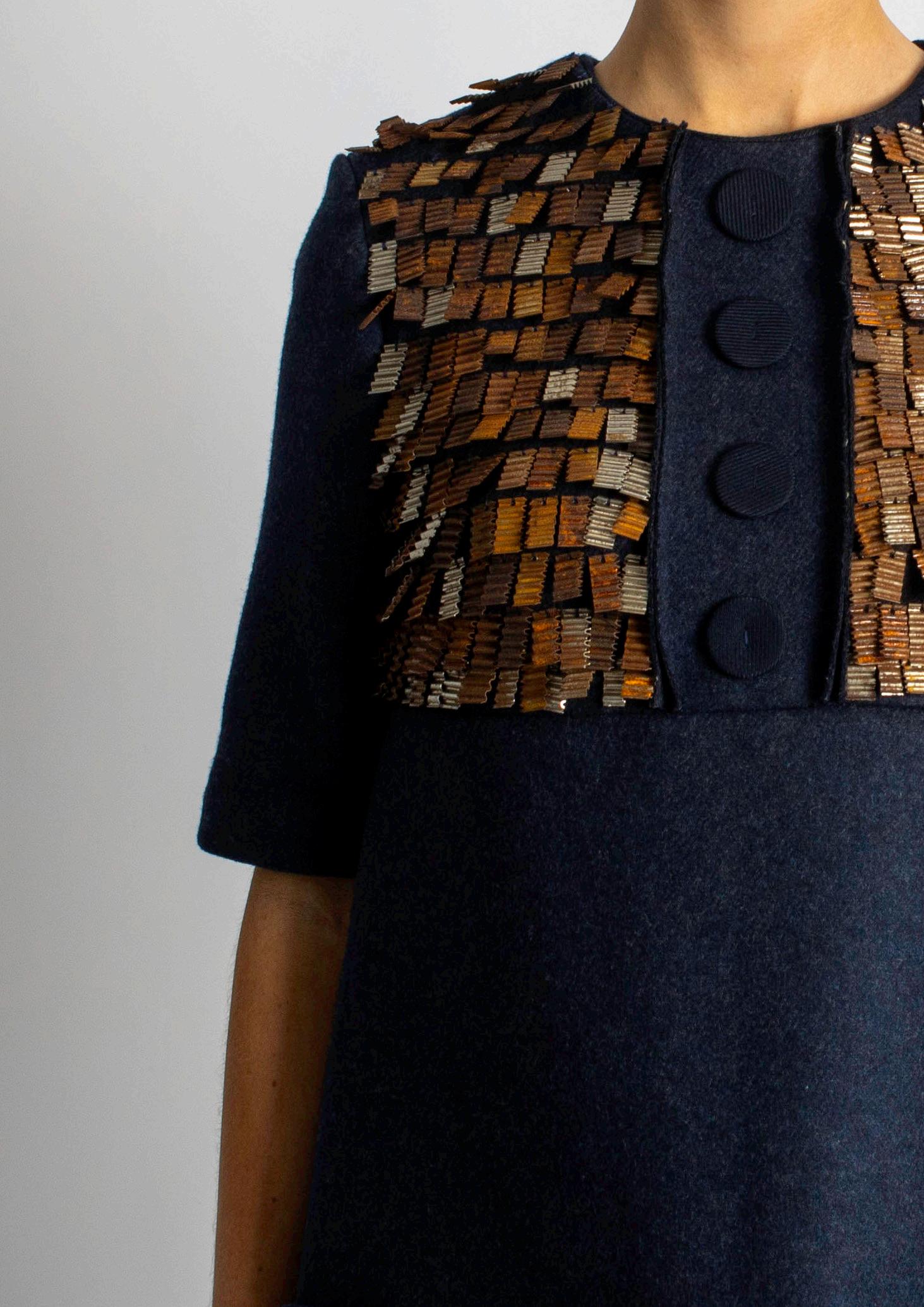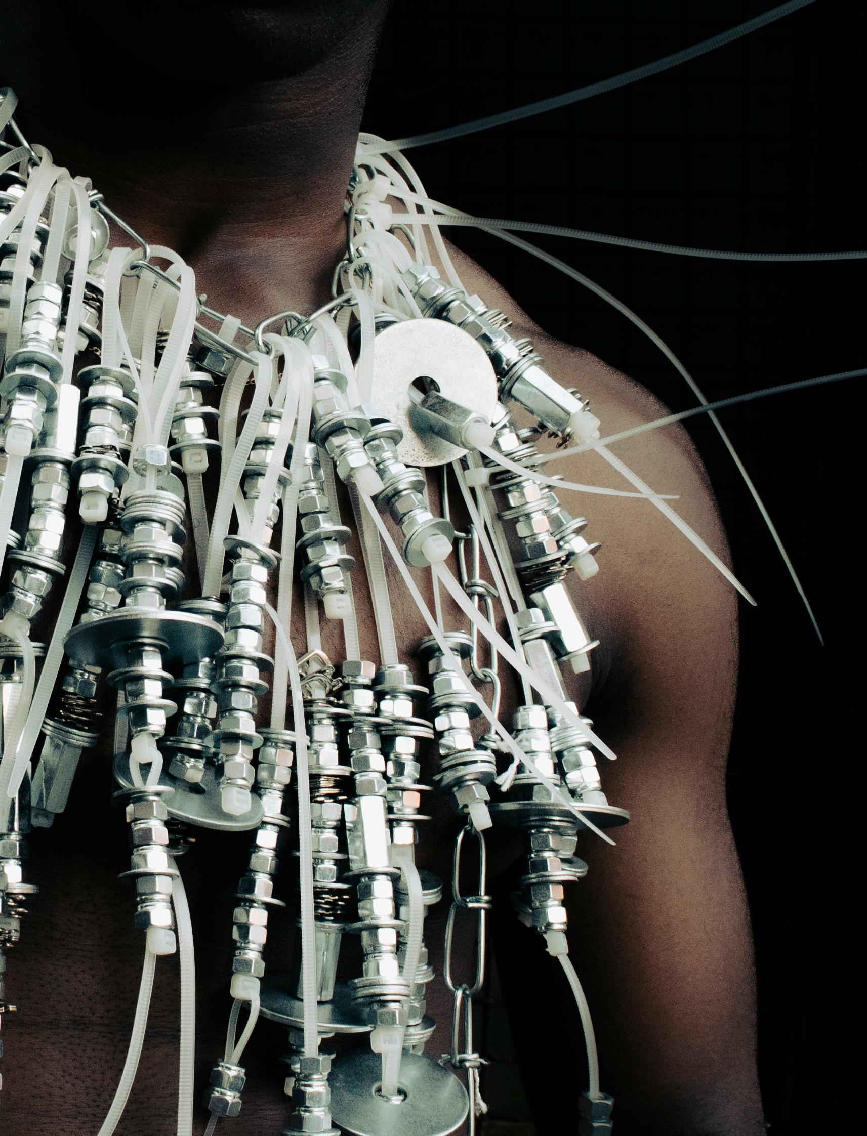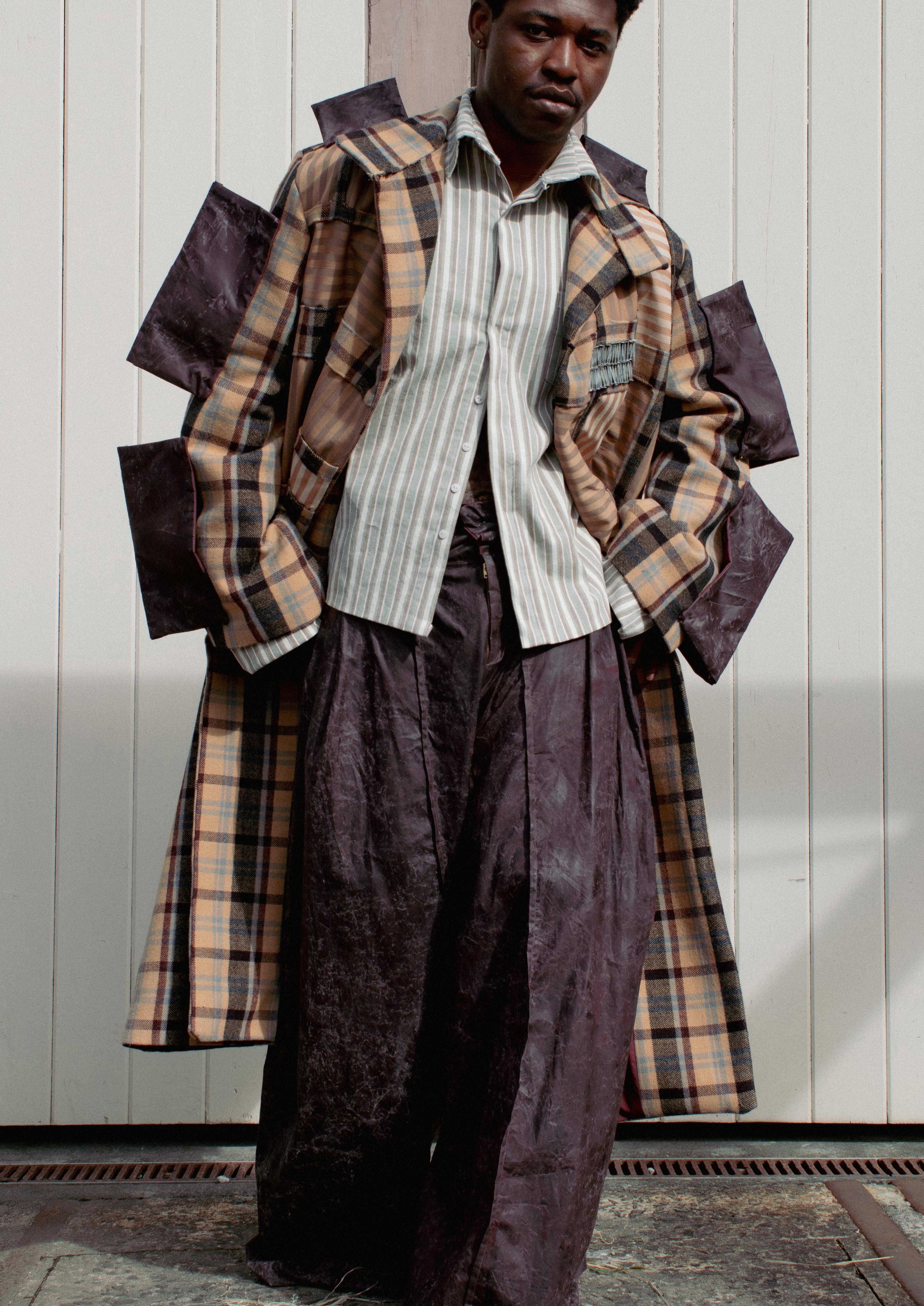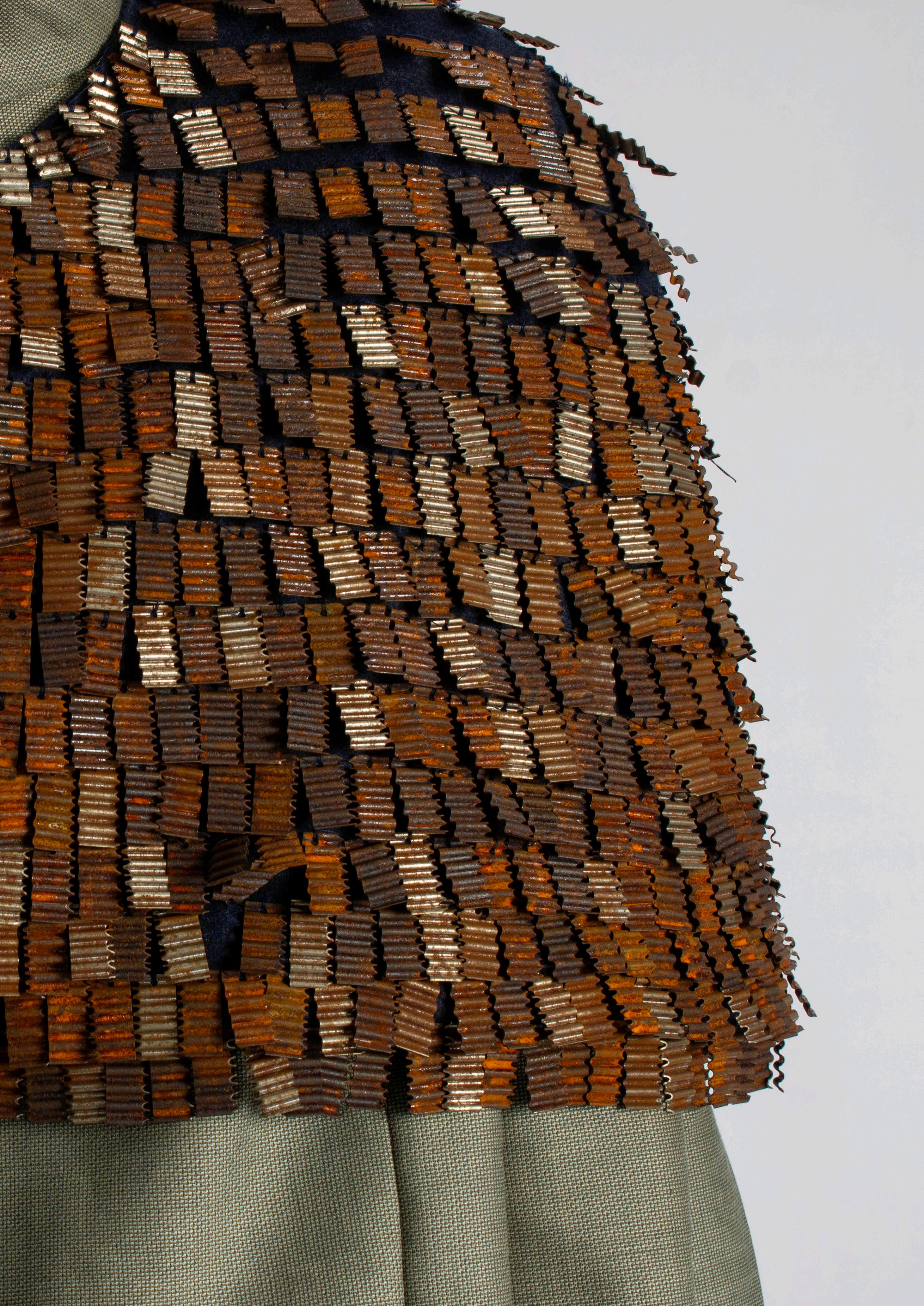 Features include hand-piped liquid latex mesh inspired by farm fencing, rusted nail beads used as textural embellishments, and hand crafted oversized metal buttons, referencing industrial hardware. These elements merge traditional wool tailoring with experimental surface work.
