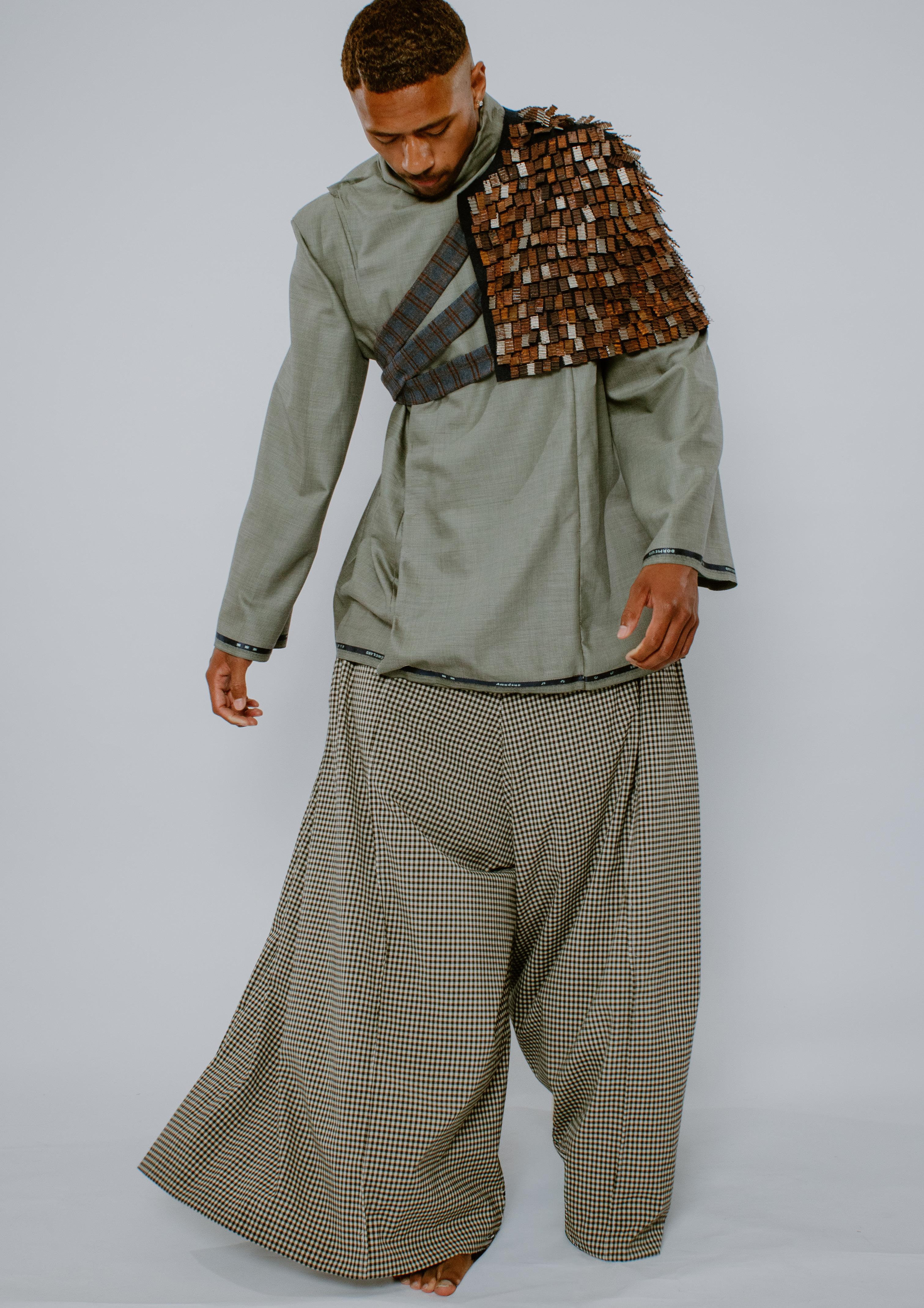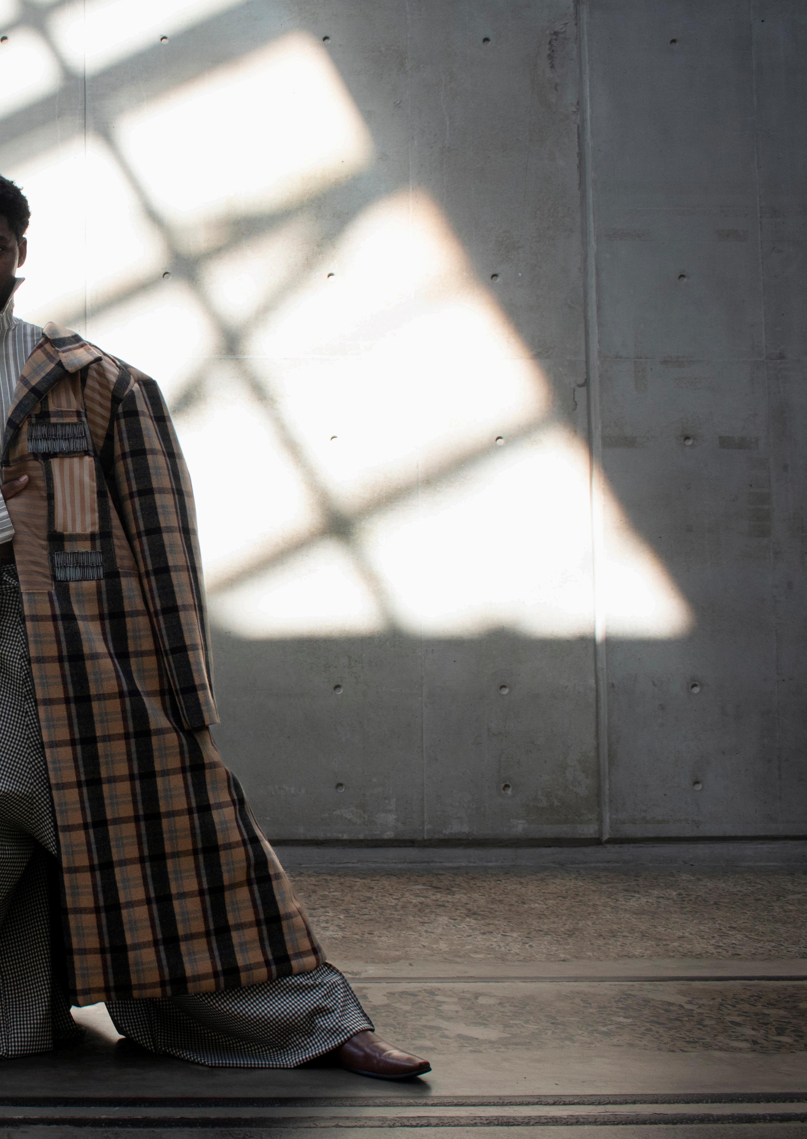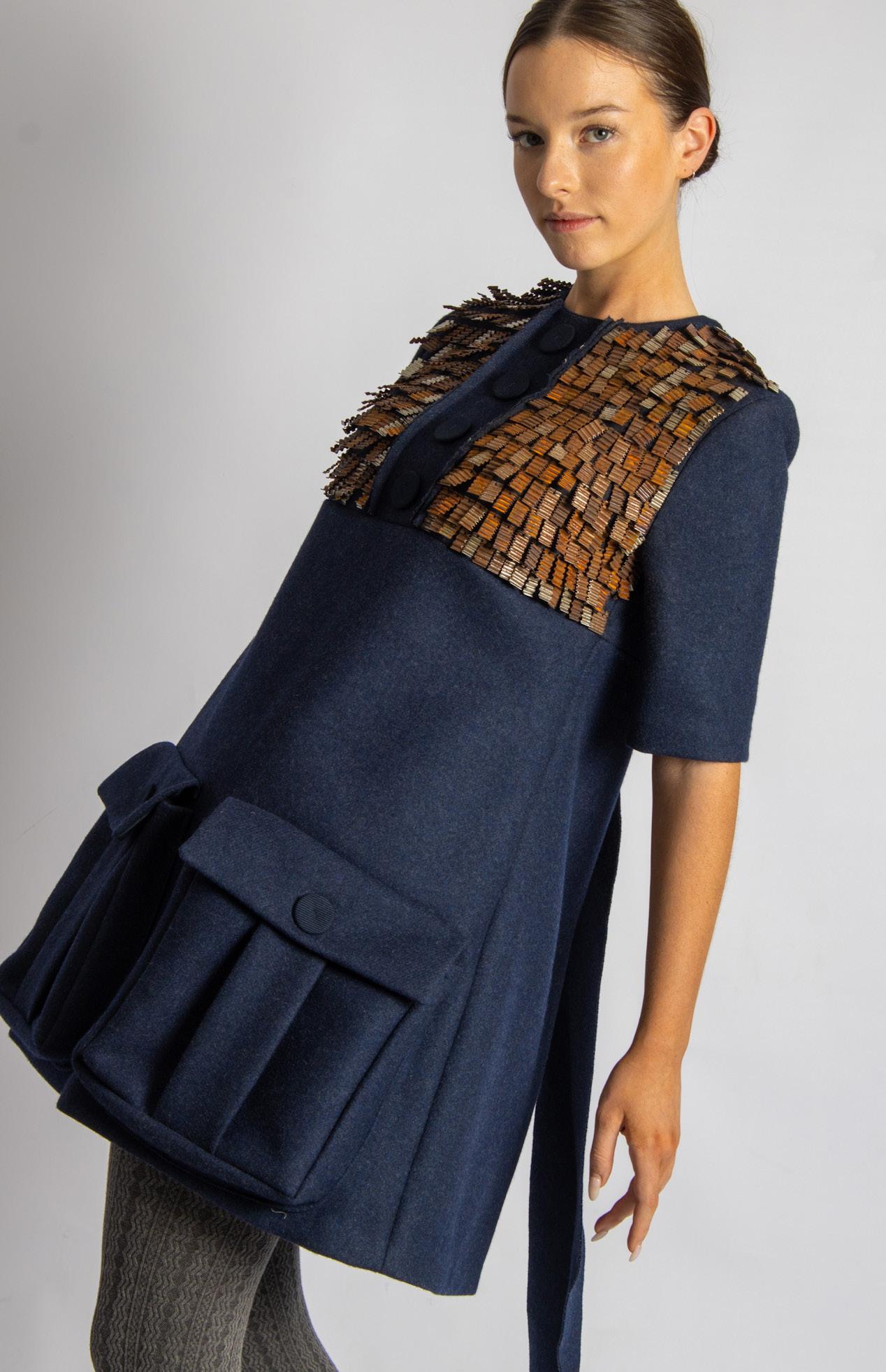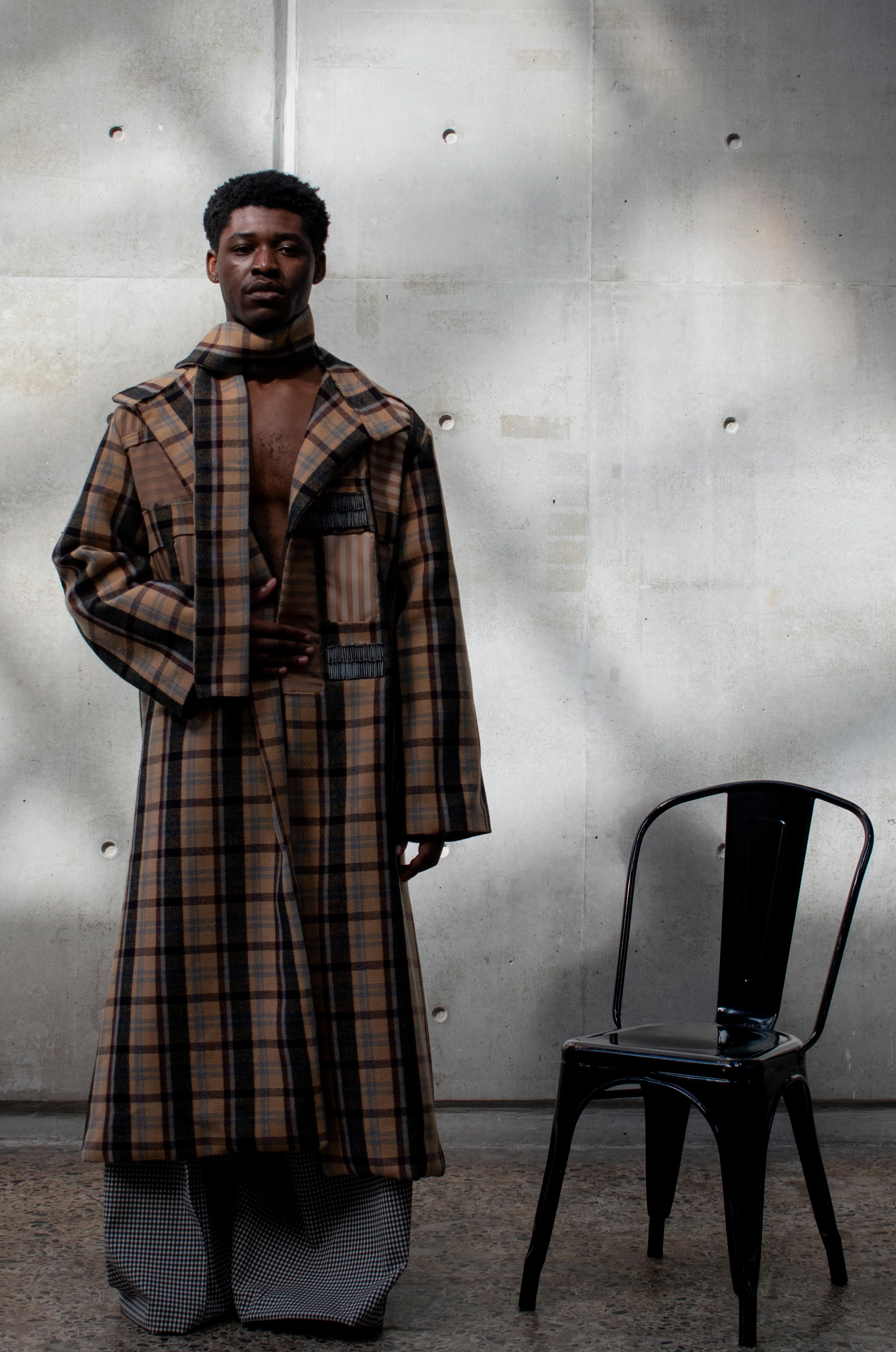 Features include hand-piped liquid latex mesh inspired by farm fencing, rusted nail beads used as textural embellishments, and hand crafted oversized metal buttons, referencing industrial hardware. These elements merge traditional wool tailoring with experimental surface work.
