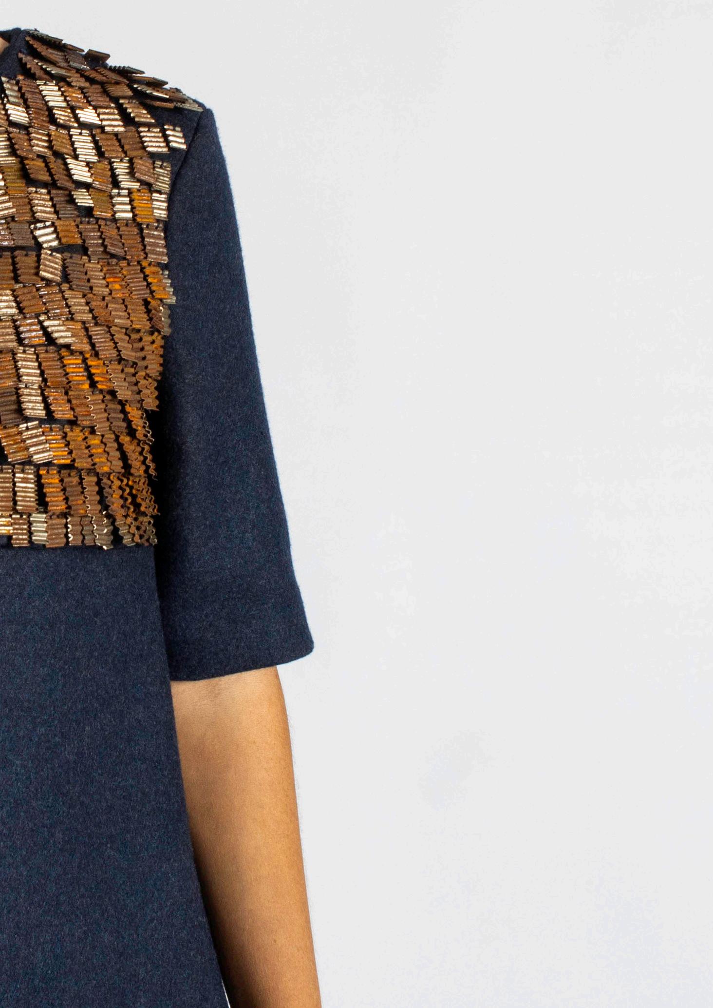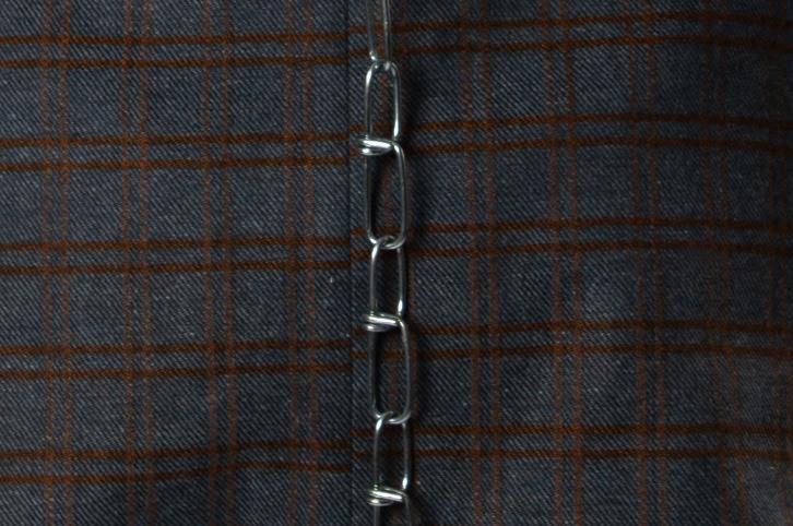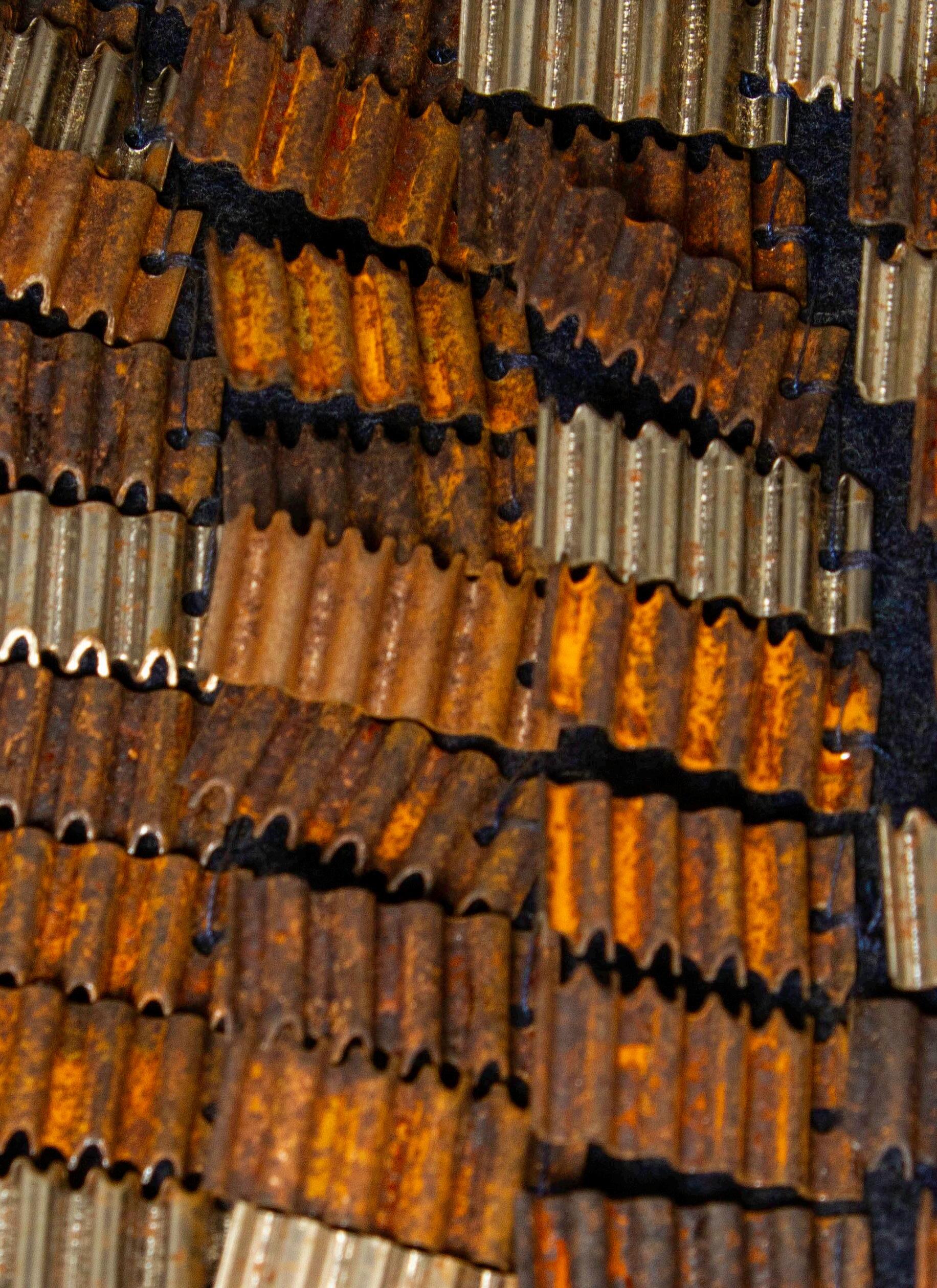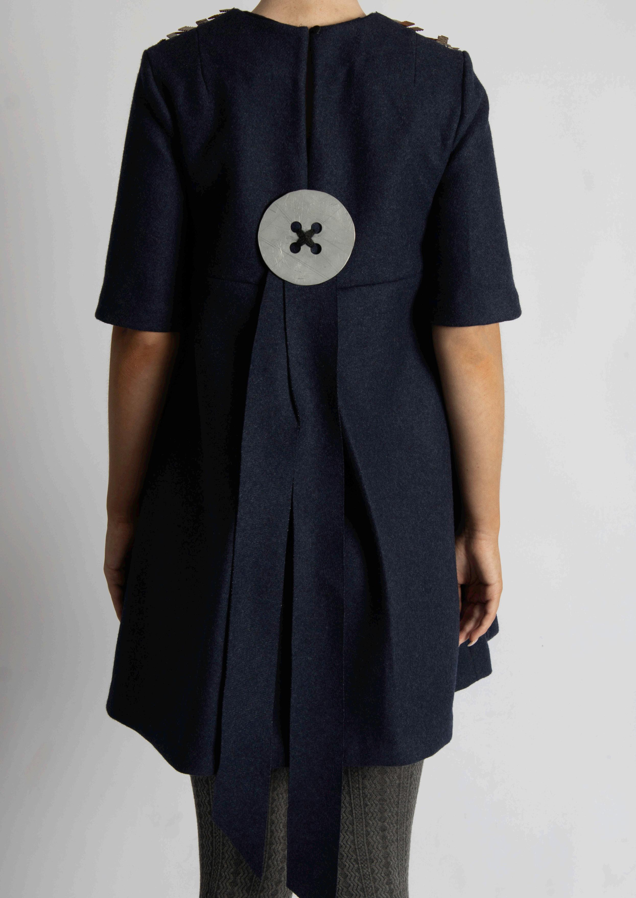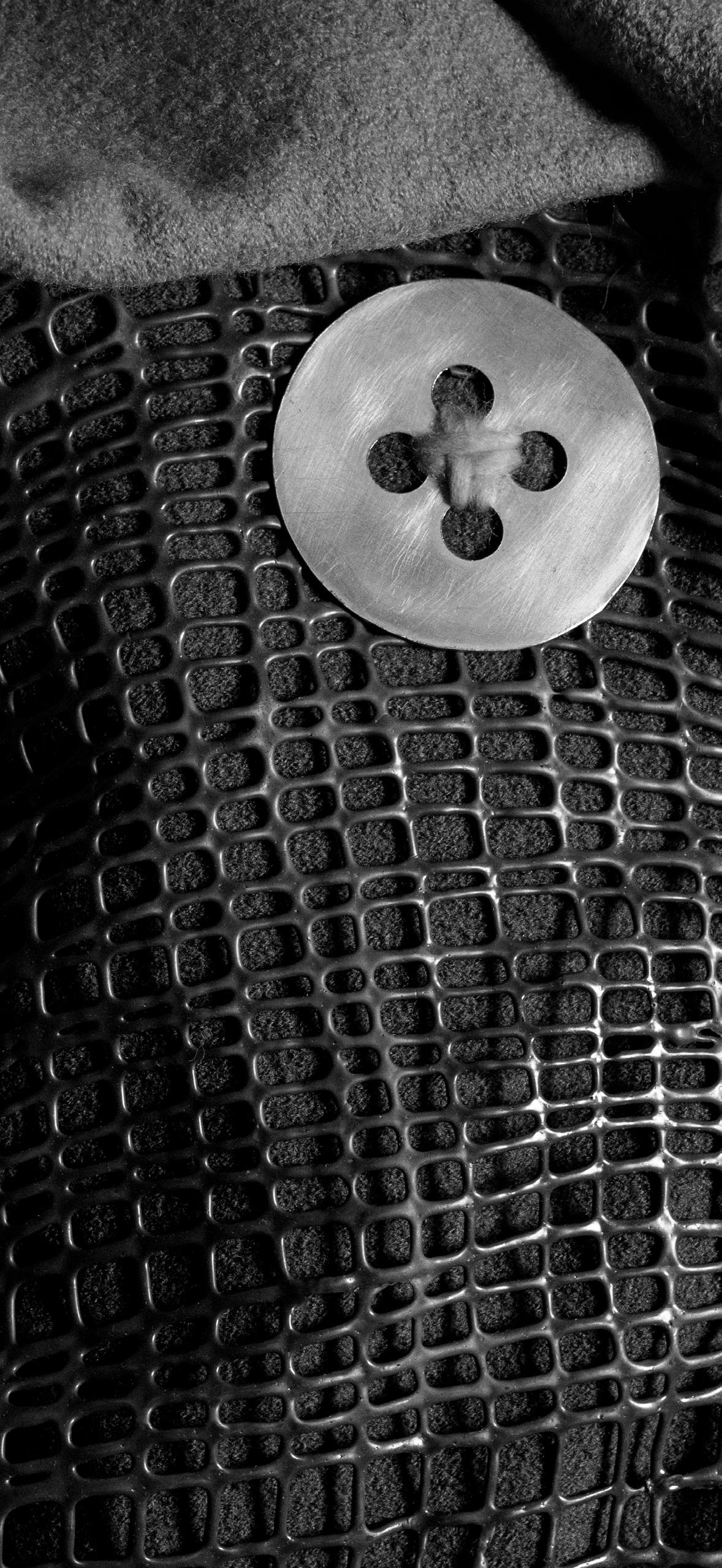 Features include hand-piped liquid latex mesh inspired by farm fencing, rusted nail beads used as textural embellishments, and hand crafted oversized metal buttons, referencing industrial hardware. These elements merge traditional wool tailoring with experimental surface work.