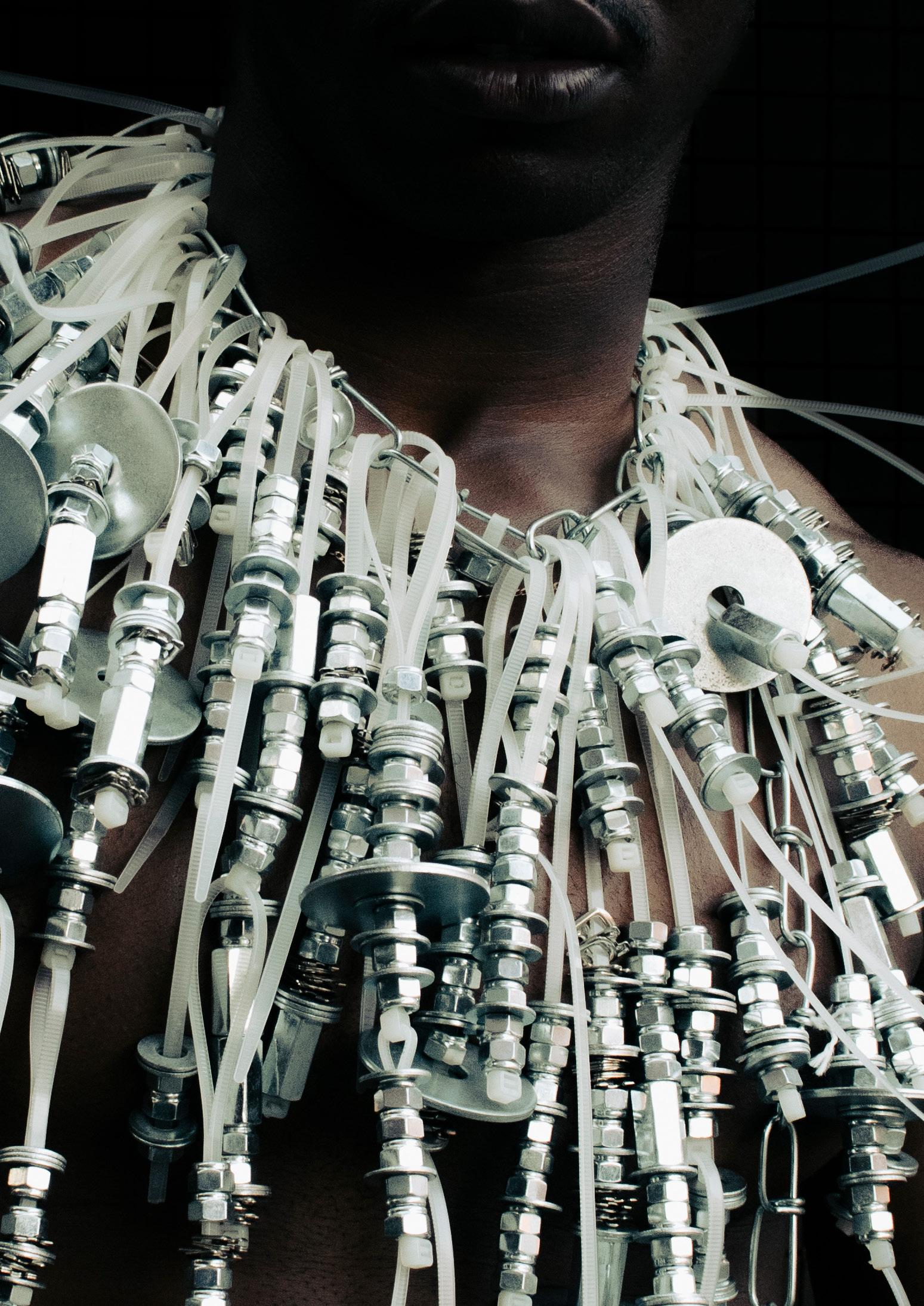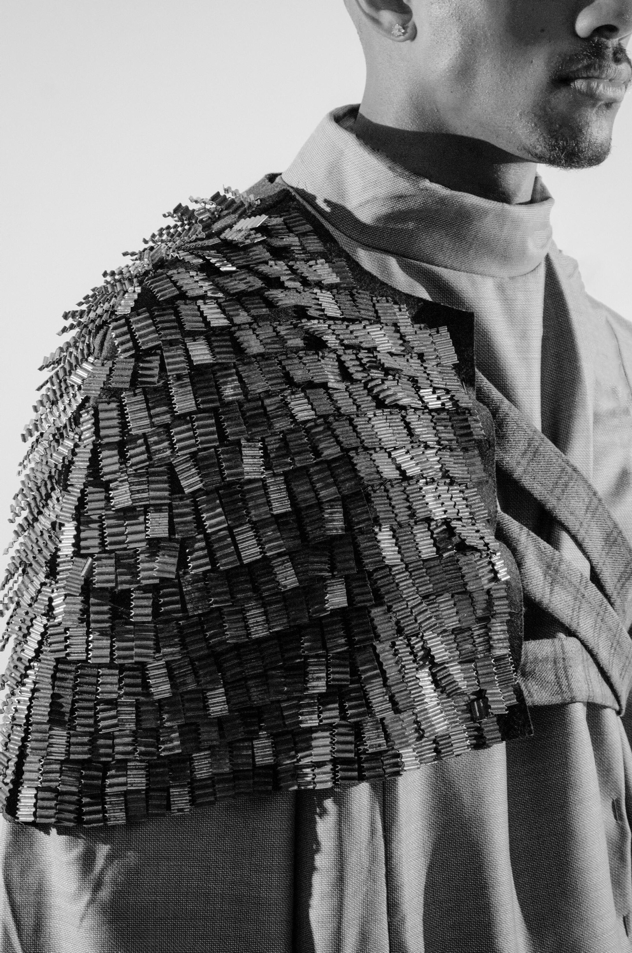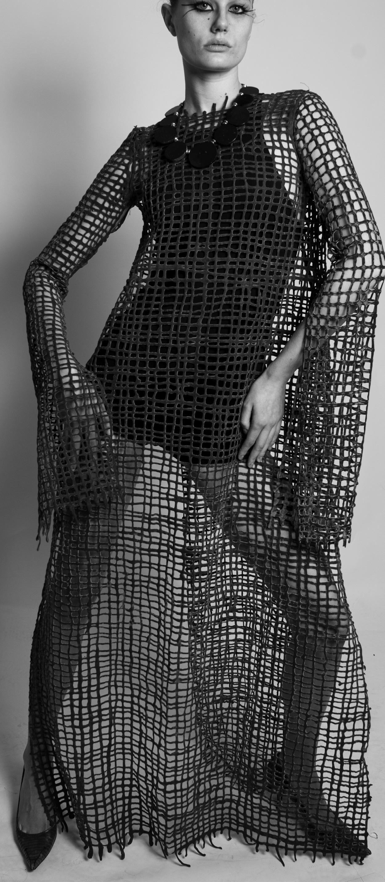 Lillika Sarai is a Sydney-based fashion designer whose work focuses on sculptural silhouettes, textural construction, and material experimentation. Her practice centres on transforming raw and unconventional materials through precise pattern making and detailed craftsmanship. She focuses on sustainable fashion, drawing primarily on natural Australian fibres to construct her garments. Her work embodies features such as hand-piped liquid latex mesh, repurposed rusted nails for embellishment, and hand-crafted oversized metal buttons that bring industrial elements into garment form.
