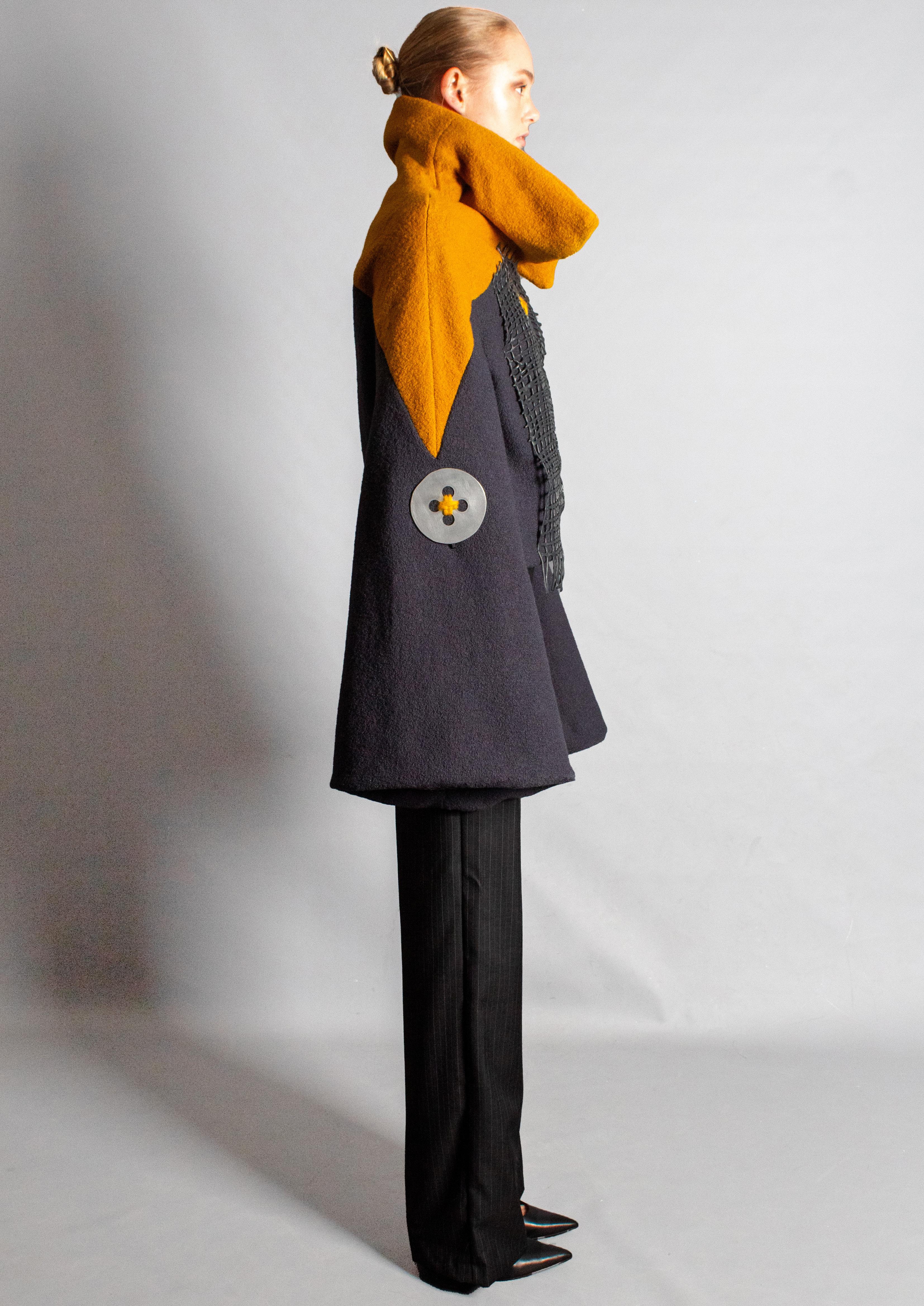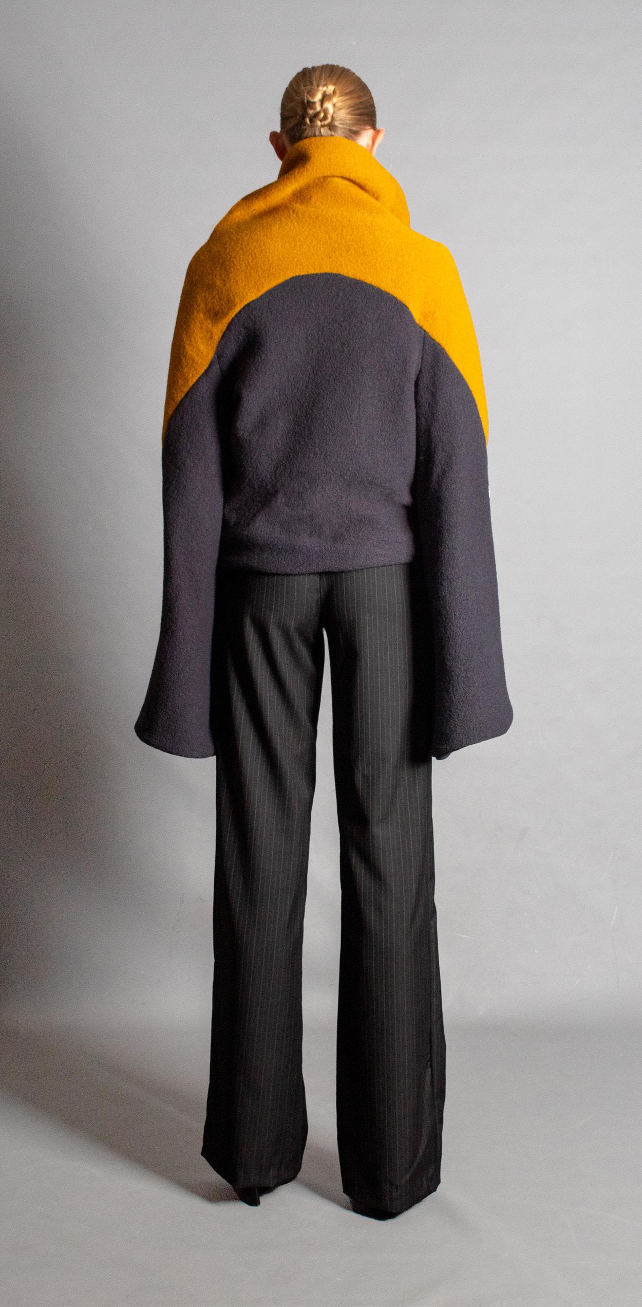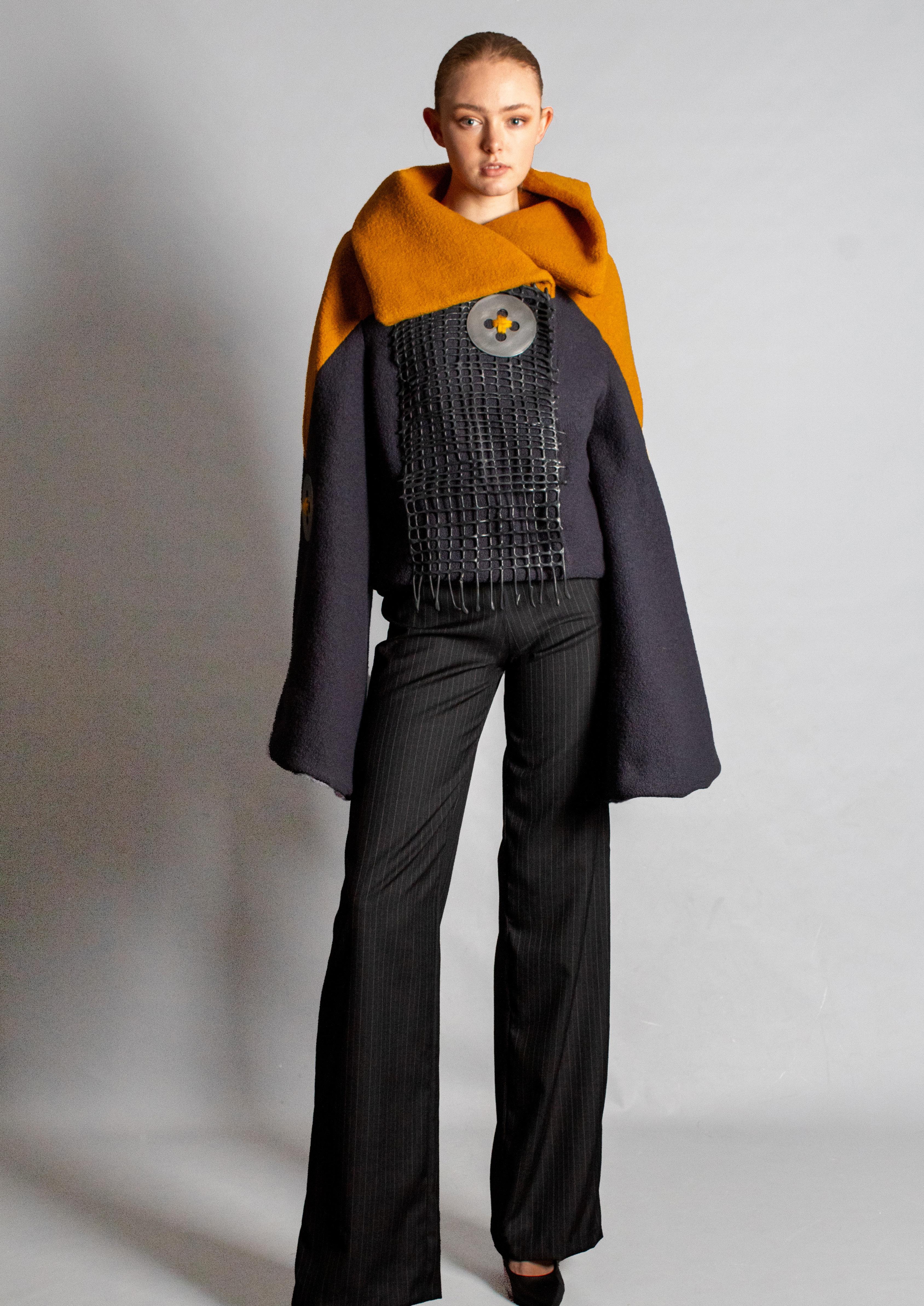 Forged in Fleece draws from the history of the Australian wool industry and memories of time spent on my grandparent’s farm. It explores how natural fibre, agricultural tools, and rural textures inform construction, with silhouettes shaped by oversized protective outerwear, sculpted wool layering, and structures echoing corrugated sheds and utilitarian workwear.