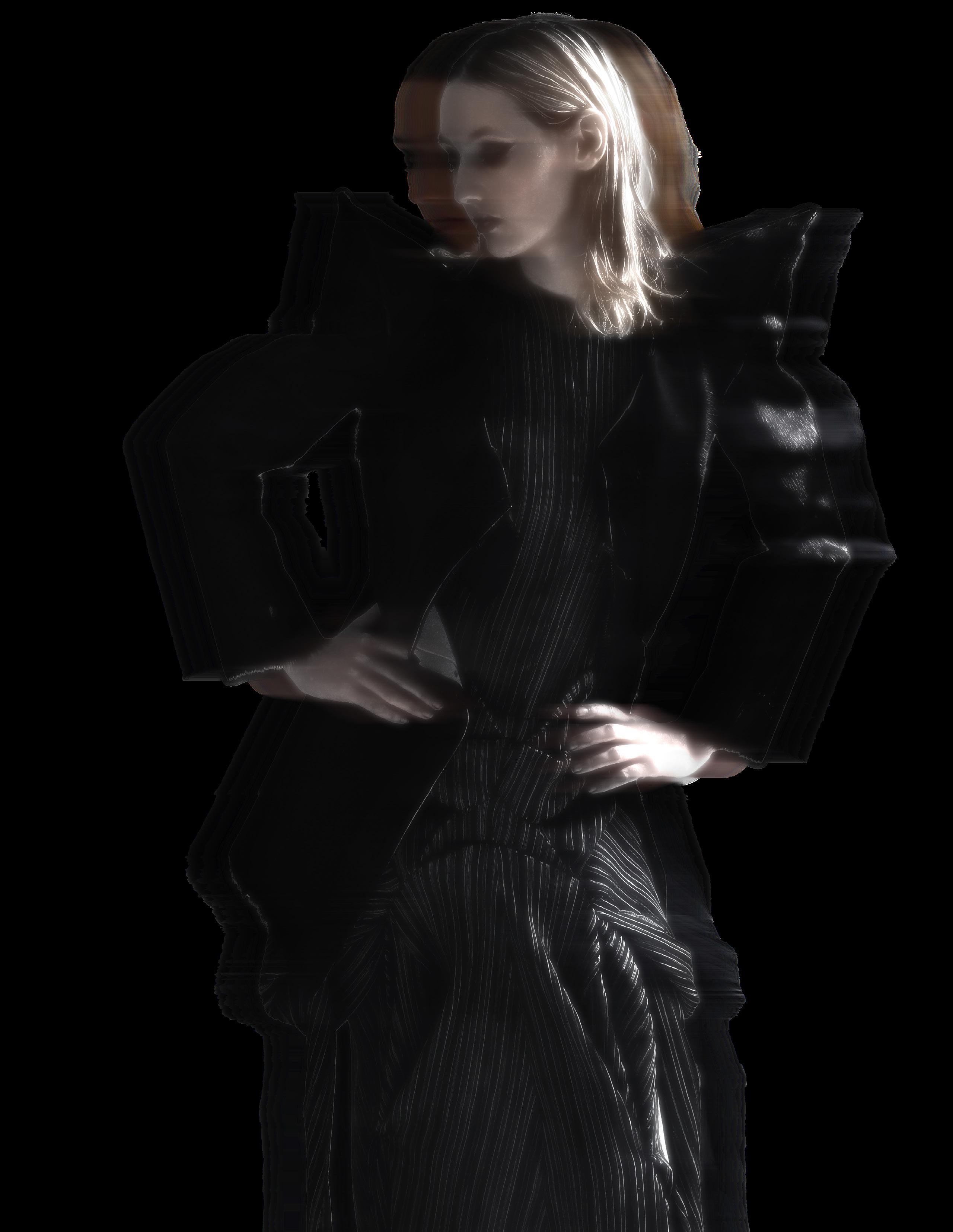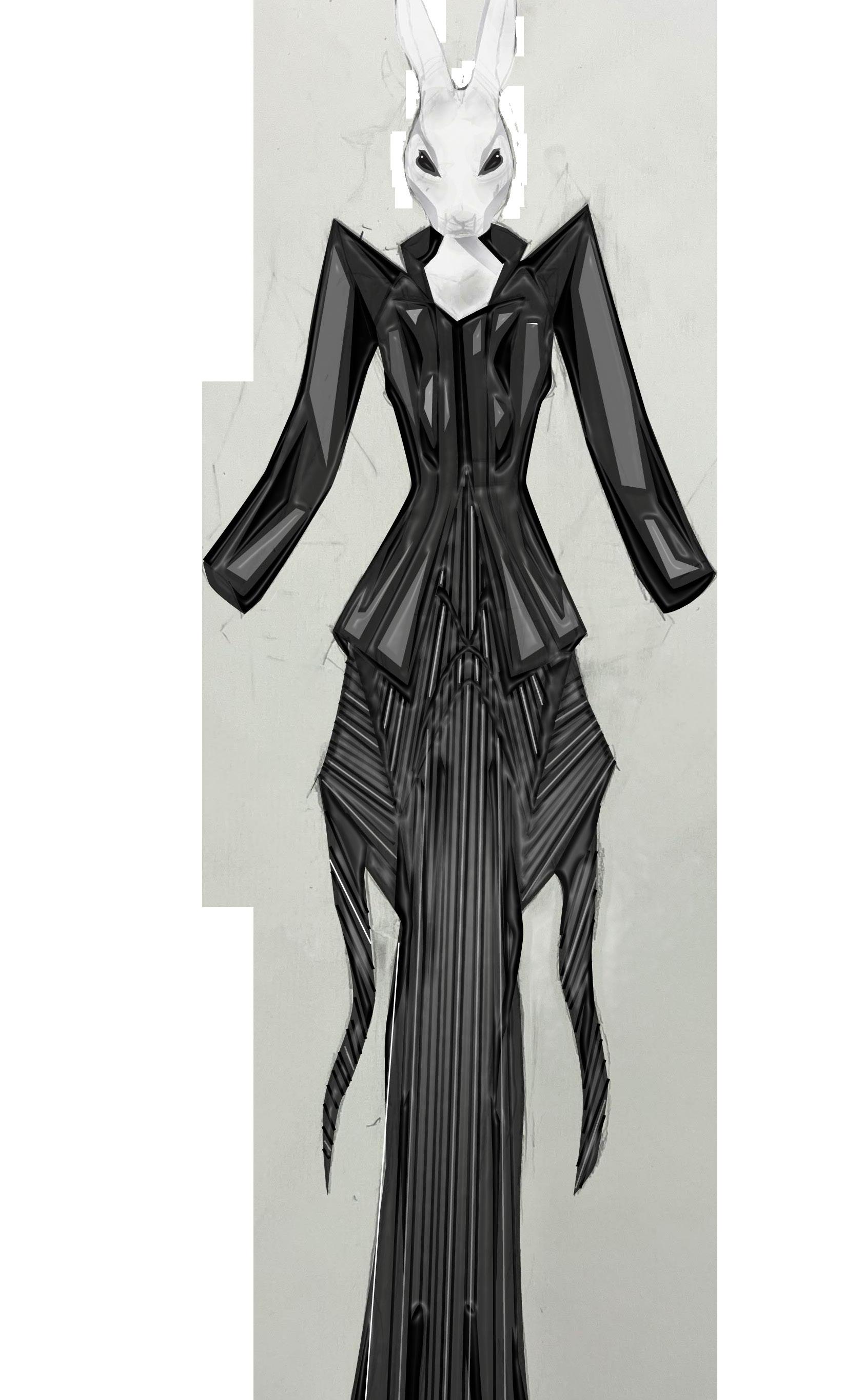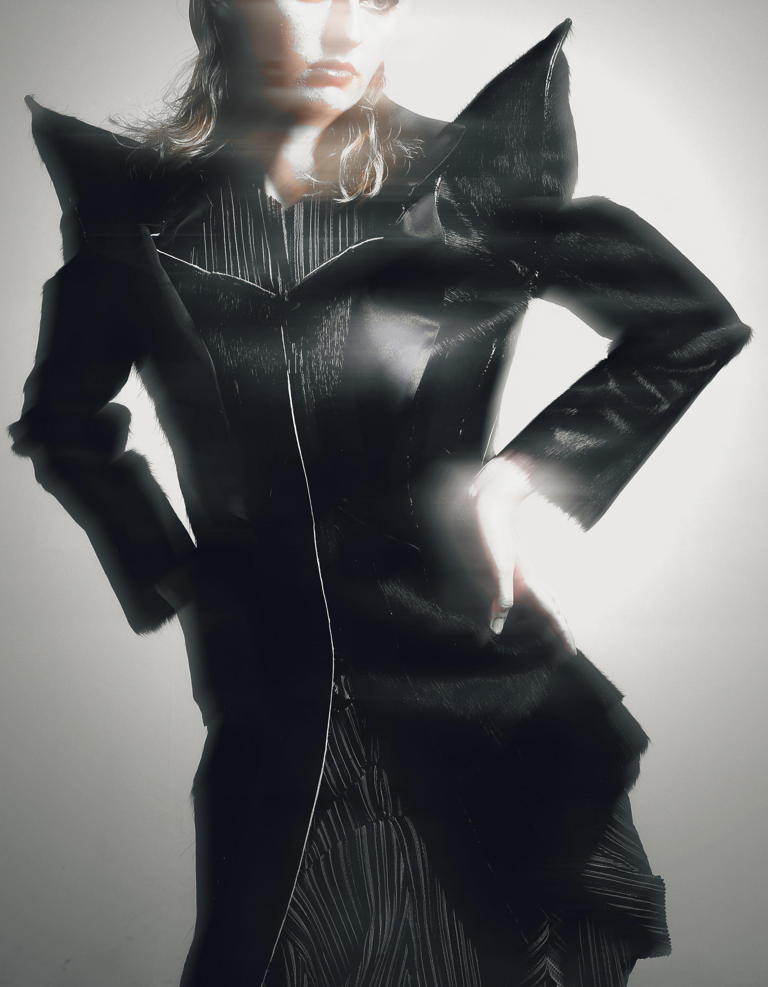 Elongated, structured silhouettes reshape the human frame, revealing the quiet tension between adornment and influence. Of Flesh and Form reflects on how identity is shaped through what we take and rework from nature, turning the body into a space where transformation is both deliberate and quietly disquieting..